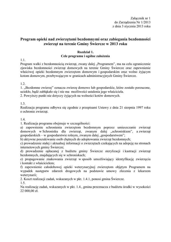 Załącznik nr 1 do Zarządzenia Nr 1/2013 z dnia 3 stycznia 2013 roku Program opieki nad zwierzętami bezdomnymi oraz zabiegania bezdomności zwierząt na terenie Gminy Świercze w 2013 roku Rozdział 1. Cele programu i ogólne założenia 1.1. Program walki z bezdomnością zwierząt, zwany dalej „Programem”, ma na celu ograniczenie zjawiska bezdomności zwierząt domowych na terenie Gminy Świercze oraz zapewnienie właściwej opieki bezdomnym zwierzętom domowym i gospodarskim oraz wolno żyjącym kotom domowym, przebywającym w granicach administracyjnych Gminy Świercze. 1.2. 1. „Bezdomne zwierzę” oznacza zwierzę domowe lub gospodarskie, które zostało porzucone, uciekło, bądź zabłąkało się i nie ma możliwości ustalenia jego właściciela. 2. Powyższy punkt nie dotyczy żyjących na wolności kotów domowych. 1.3. Realizacja programu odbywa się zgodnie z przepisami Ustawy z dnia 21 sierpnia 1997 roku o ochronie zwierząt. 1.4. 1. Realizacja programu obejmuje w szczególności: a) zapewnienie schronienia zwierzętom bezdomnym poprzez umieszczanie zwierząt domowych w Schronisku dla zwierząt, zwanym dalej „schroniskiem”, a zwierząt gospodarskich – w gospodarstwie rolnym, zwanym dalej „gospodarstwem”; b) aktywne poszukiwanie osób chętnych do adoptowania zwierząt bezdomnych; c) prowadzenie stałej i aktualnej informacji o zwierzętach czekających na adopcję na stronach internetowych gminy Świercze; d) prowadzenie opłacanej z budżetu gminy Świercze sterylizacji i kastracji zwierząt bezdomnych, znajdujących się w schroniskach; e) propagowanie znakowania zwierząt w sposób umożliwiający identyfikację zwierzęcia i kontakt z właścicielem; f) zapewnienie całodobowej opieki weterynaryjnej zwierzętom objętym Programem na wypadek następstw zdarzeń drogowych na podstawie umowy zlecenia z lekarzem weterynarii; 2. Koszt realizacji zadań, wskazanych w pkt. 1.4.1, ponosi gmina Świercze. 1.5. Na realizację zadań, wskazanych w pkt. 1.4., gmina przeznacza z budżetu środki w wysokości 22 000,00 zł. Rozdział 2. Odławianie bezdomnych zwierząt 2.1. Odławianiem bezdomnych zwierząt z terenu gminy Świercze zajmuje się schronisko w Ostrowi Mazowieckiej. 2.2. Pracownicy schroniska współpracują z Urzędem Gminy Świercze w ramach wykonywania zadań, o których mowa w pkt. 1.4.1. 2.3. Umowa zawarta z podmiotem, prowadzącym schronisko, określa skutki nienależytego wykonania wynikających z niej zobowiązań, dotyczących działalności schroniska, w tym ewentualne kary umowne. 2.4. 1. Kierownik Referatu Infrastruktury Rolnictwa i Ochrony Środowiska Urzędu Gminy Świercze sprawuje nadzór nad działalnością schroniska, bacząc, aby wykonywanie zadań, o których mowa w pkt. 1.4.1 oraz pkt. 2.1., odbywało się zgodnie z wymogami humanitarnej ochrony zwierząt. 2. W razie stwierdzenia niezgodności działań schroniska z przepisami prawa, a zwłaszcza z Ustawą z dnia 21 sierpnia 1997 o ochronie zwierząt i aktami wykonawczymi, Wójt Gminy niezwłocznie zawiadamia właściwe rzeczowo instytucje publiczne o zaobserwowanych uchybieniach. 2.5. Na schronisku ciąży obowiązek zapewnienia przebywającym zwierzętom właściwej opieki, a w szczególności: - odpowiedniego pożywienia i dostępu do świeżej wody; - ochrony przed warunkami atmosferycznymi; - opieki weterynaryjnej. 2.6. Schronisko aktywnie uczestniczy w działaniach, mających zapewnić bezdomnym zwierzętom stałą opiekę, w szczególności poprzez podawanie informacji w środkach masowego przekazu ( internet, prasa, tablica ogłoszeń ) o zwierzętach dostępnych do adopcji. 2.7. Schronisko ma obowiązek udostępnić osobie, ubiegającej się o adopcję zwierzęcia, (ograniczony jedynie względami bezpieczeństwa) dostęp do pomieszczeń, w których zwierzęta są przetrzymywane, za wyjątkiem pomieszczeń przeznaczonych dla celów kwarantanny bądź trzymania zwierząt agresywnych. 2.8. Adopcja zwierzęcia ze schroniska może odbyć się jedynie po odbyciu przez niego zabiegu, polegającego na trwałym pozbawieniu zdolności płodzenia, chyba że istnieją szczególne przeciwwskazania, a zwłaszcza nie pozwala na to stan zdrowia zwierzęcia. 2.9. 1. Zwierzę w schronisku może zostać poddane eutanazji jedynie w przypadku: a) gdy jest nieuleczalnie lub zakaźnie chore, a jego pobyt w schronisku podczas leczenia zagraża życiu innych zwierząt; b) gdy może dalej żyć jedynie cierpiąc i znosząc ból, a moralnym obowiązkiem człowieka staje się skrócenie cierpień zwierzęcia; b) gdy jest agresywne w stopniu nie rokującym poprawy i bezpośrednio zagraża ludziom i innym zwierzętom, a nie ma innego sposobu uniknięcia zagrożenia; c) w ramach usypiania ślepych miotów w celu kontroli populacji. 2. O konieczności przeprowadzenia zabiegu, o którym mowa w pkt. 2.9.1., orzeka lekarz weterynarii. 2.10. W przypadku przepełnienia, schronisko ma obowiązek podjąć współpracę z organizacjami społecznymi, których statutowym celem jest ochrona zwierząt, w celu umieszczenia nadwyżki zwierząt w domach tymczasowych. Rozdział 3. Opieka nad wolno żyjącymi kotami domowymi 3.1. Zjawisko na terenie Gminy nie występuje. Rozdział 4. Adopcje zwierząt i domy tymczasowe 4.1. 1. Osoby fizyczne mają prawo ubiegać się o sprawowanie w miejscu swojego zamieszkania opieki nad zwierzęciem bezdomnym pochodzącym z terenu gminy Świercze. 2. Sprawowanie opieki nad zwierzęciem może mieć postać: a) stałą i nieograniczoną w czasie, zmierzającą do nabycia zwierzęcia na własność, zwaną dalej „adopcją”; b) na czas określony; c) na czas nieokreślony, zwaną dalej „domem tymczasowym”. 4.2. 1. Przekazanie zwierzęcia do adopcji odbywa się nieodpłatnie bądź za zwrotem wydającemu podstawowych kosztów opieki weterynaryjnej nad zwierzęciem. 2. Przekazanie zwierzęcia do domu tymczasowego odbywa się nieodpłatnie. 3. Osoba, sprawująca opiekę nad zwierzę
