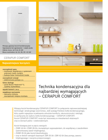Wiszący gazowy kocioł kondensacyjny Ogrzewanie lub ogrzewanie + ciepła woda Zakres mocy: od 3 do 41 kW Moce nominalne: do 16, 28, 35 i 41 kW CERAPUR COMFORT Najważniejsze korzyści: oszczędność gazu – możliwość współpracy z systemami . . . solarnymi marki Junkers – funkcja Solar ControlUnit Inside oszczędność energii – elektroniczna pompa c.o. łatwa obsługa – panel Bosch Heatronic® 3, czytelny wyświetlacz wysoki komort c.w.u. wyjątkowe wyciszenie – specjalna izolacja, oszczędność miejsca montażu Technika kondensacyjna dla najbardziej wymagających – CERAPUR COMFORT Wiszący kocioł kondensacyjny CERAPUR COMFORT to połączenie najnowocześniejszej technologii i atrakcyjnego wzornictwa. Jeśli szukają Państwo kotła kondensacyjnego, który spełni najwyższe oczekiwania odnośnie komfortu, ekonomiczności i ekologii, to zachęcamy do wyboru kotła kondensacyjnego – CERAPUR COMFORT. Kocioł CERAPUR COMFORT może być stosowany w mieszkaniach etażowych oraz w domach jedno- i wielorodzinnych. Kocioł dostępny jest w pięciu wersjach: – ZSBR 16-3A i ZSBR 28-3A z kompletnym wyposażeniem, do współpracy z zasobnikiem (zamontowany zawór trójdrogowy), – ZWBR 35-3A jako kocioł dwufunkcyjny – oraz w dwóch wersjach bazowych ZBR 35-3A i ZBR 42-3A (bez pompy, zaworu trójdrogowego i naczynia przeponowego). Najwyższy komfort ciepła, maksymalna ochrona środowiska i duże oszczędności Dzięki wykorzystaniu techniki kondensacyjnej, kocioł CERAPUR COMFORT osiąga sprawność znormalizowaną 109% przy minimalnej emisji substancji szkodliwych. W ten sposób oszczędzamy energię i jednocześnie chronimy środowisko. Wysokiej klasy elektronika – łatwa obsługa Wbudowany elektroniczny układ regulacji Bosch Heatronic® 3 gwarantuje dziecinnie łatwą obsługę urządzenia. Wszystkie parametry kotła są wyświetlane na wielofunkcyjnym wyświetlaczu. „Inteligentna” pompa Wbudowana „inteligentna” pompa modulowana elektronicznie, gwarantuje komfortową i oszczędną pracę urządzenia: optymalizuje sprawność cieplną, oszczędza energię elektryczną, automatycznie dopasowuje się do zmiennych warunków pracy centralnego ogrzewania Najnowocześniejsza technika w eleganckim opakowaniu Nowoczesny i elegancki design urządzenia, pozwala na montaż w eksponowanych miejscach. Przyjemne ciepło – wyjątkowe wyciszenie Dodatkowe wyciszenie w komplecie! Dzięki wyposażeniu kotłów CERAPUR COMFORT w dodatkowe maty wyciszające, możecie Państwo cieszyć się ciepłem w ciszy i spokoju. Dzięki temu, kotły CERAPUR COMFORT można montować również w pomieszczeniach mieszkalnych. Układy kaskadowe Najnowocześniejsza automatyka serii FX umożliwia nie tylko różnorodne sterowanie nawet 10 obiegami grzewczymi, ale również współpracę kaskadową nawet do 16 kotłów połączonych równolegle. Przegląd gazowych kotłów – kotły jednofunkcyjne ogrzewanie lub ogrzewanie i ciepła woda z dodatkowego/opcjonalnego zasobnika Typ kotła Model Cerapur Smart Cerapurmaxx Cerapur Comfort ZSB 14-3C ZSB 22-3C ZSBR 16-3A ZSBR 28-3A ZBR 35-3A ZBR 42-3A ZBR 65-2 Sposób montażu wiszący wiszący wiszący wiszący wiszący wiszący wiszący wiszący Nominalna moc cieplna 40/30°C [kW] 3,7-14,2 8,1-21,8 3,7-15,9 7,1-27,7 10,2-35,3 10,2-40,8 15,6-65,0* 20,5-98,0* Nominalna moc cieplna 80/60°C [kW] 3,3-13,0 7,3-20,3 3,3-14,6 6,4-26,1 9,3-34,1 9,5-39,2 14,2-60,4 18,6-92,1 13,0 20,3 14,7 26,2 34,8 40,0 60,4 92,1 Dopuszczalne ciśnienie gazu GZ50 (2E) [mbar] 17-25 17-25 16-25 16-25 16-25 16-25 16-25 16-25 Dopuszczalne ciśnienie gazu GZ41,5 (2Lw) [mbar] 16-23 16-23 17,5-23 17,5-23 17,5-23 17,5-23 - - Dopuszczalne ciśnienie gazu GZ35 (2Ls) [mbar] 10-16 10-16 10,5-16 10,5-16 - - - - Maksymalna moc dla c.w.u. [kW] ZBR 98-2 Dopuszczalne ciśnienie gazu płynnego (propan) [mbar] 29-44 29-44 37 37 37 37 36 36 Strumień spalin przy mocy max./min. dla GZ50 (2E) [g/s] 5,8/1,6 8,9/3,5 6,8/1,7 12,0/3,2 15,7/4,3 18,1/4,3 27,9/6,0 42,2/8,6 Temperatura spalin 80/60 °C dla mocy max./min. [°C] 69/58 94/61 69/58 62/55 79/60 87/60 66/55 75/57 Temperatura spalin 40/30 °C dla mocy max./min. [°C] 49/30 60/32 49/32 51/32 60/32 65/32 45/34* 50/36* 80 80 80 80 100 100 127 220 5 5 5 5 5 5 5 5 Maksymalna ilość kondensatu (tR = 30 °C) [l/h] 1,2 1,2 1,2 2,2 3,3 3,5 7,3 11,0 Wartość pH ok. 4,8 4,8 4,8 4,8 4,8 4,8 4,8 4,8 Napięcie elektryczne AC [V] 230 230 230 230 230 230 230 230 Ciśnienie dyspozycyjne [Pa] Klasa NOx Częstotliwość [Hz] 50 50 50 50 50 50 50 50 Maksymalny pobór mocy c.o. [W] 125 125 105 119 88 92 76/20 150/26 Poziom ciśnienia akustycznego [dB(A)]≤ 36 ≤ 36 ≤ 36 ≤ 34 ≤ 36 ≤ 38 ≤ 40 - IP X4D (IP X0D; B23) ok. 90 Stopień ochrony IP X4D X4D X4D X4D X4D X4D IP X4D (IP X0D; B23) ok. 90 ok. 90 ok. 90 ok. 90 ok. 90 ok. 90 ok. 90 3 3 3 3 3 3 4 4 3,0 3,0 3,5 3,5 3,5 3,5 5** 5** Automatyka w podstawowym zakresie dostawy Panel sterowania Bosch Heatronic® 3 Panel sterowania Bosch Heatronic® 3 Panel sterowania Bosch Heatronic® 3 Panel sterowania Bosch Heatronic® 3 Panel sterowania Bosch Heatronic® 3 Panel sterowania Bosch Heatronic® 3 Panel sterowania Panel sterowania Automatyka dodatkowa / opcjonalna regulatory serii FX regulatory serii FX regulatory serii FX regulatory serii FX regulatory serii FX regulatory serii FX regulatory serii Fx regulatory serii Fx Pompa obiegowa 3-stopniowa 3-stopniowa elektroniczna elektroniczna wyp. dodatkowe wyp. dodatkowe wyp. dodatkowe wyp. dodatkowe x x x x - - - - 8/0,5 8/0,5 12/0,75 12/0,75 - - - - Maksymalna temperatura zasilania c.o. [°C] Maksymalne dopuszczalne ciśnienie c.o. (PMS) [bar] Pojemność wodna c.o. [l] Zawór trójdrogowy do współpracy z zasobnikiem c.w.u. Naczynie wzbiorcze c.o. [l]/[bar] Płyta montażowa z zaworami x x x x - - - - 80/125 80/125 80/125 80/125 80/125 80/125 100/150 100/150 Wysokość [mm] 850 850 850 850 850 850 980 980 Szerokość [mm] 400 400 440 440 440 440 520 520 Głębokoś