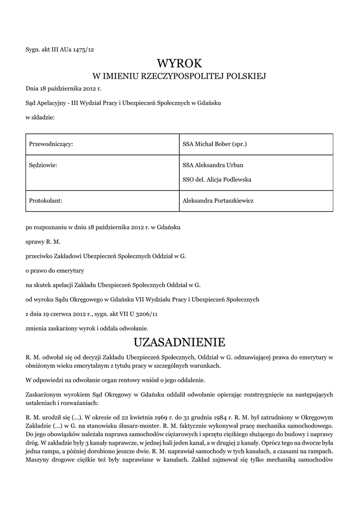 Sygn. akt III AUa 1475/12 WYROK W IMIENIU RZECZYPOSPOLITEJ POLSKIEJ Dnia 18 października 2012 r. Sąd Apelacyjny - III Wydział Pracy i Ubezpieczeń Społecznych w Gdańsku w składzie: Przewodniczący: SSA Michał Bober (spr.) Sędziowie: SSA Aleksandra Urban SSO del. Alicja Podlewska Protokolant: Aleksandra Portaszkiewicz po rozpoznaniu w dniu 18 października 2012 r. w Gdańsku sprawy R. M. przeciwko Zakładowi Ubezpieczeń Społecznych Oddział w G. o prawo do emerytury na skutek apelacji Zakładu Ubezpieczeń Społecznych Oddział w G. od wyroku Sądu Okręgowego w Gdańsku VII Wydziału Pracy i Ubezpieczeń Społecznych z dnia 19 czerwca 2012 r., sygn. akt VII U 3206/11 zmienia zaskarżony wyrok i oddala odwołanie. UZASADNIENIE R. M. odwołał się od decyzji Zakładu Ubezpieczeń Społecznych, Oddział w G. odmawiającej prawa do emerytury w obniżonym wieku emerytalnym z tytułu pracy w szczególnych warunkach. W odpowiedzi na odwołanie organ rentowy wniósł o jego oddalenie. Zaskarżonym wyrokiem Sąd Okręgowy w Gdańsku oddalił odwołanie opierając rozstrzygnięcie na następujących ustaleniach i rozważaniach: R. M. urodził się (...). W okresie od 22 kwietnia 1969 r. do 31 grudnia 1984 r. R. M. był zatrudniony w Okręgowym Zakładzie (...) w G. na stanowisku ślusarz-monter. R. M. faktycznie wykonywał pracę mechanika samochodowego. Do jego obowiązków należała naprawa samochodów ciężarowych i sprzętu ciężkiego służącego do budowy i naprawy dróg. W zakładzie były 3 kanały naprawcze, w jednej hali jeden kanał, a w drugiej 2 kanały. Oprócz tego na dworze była jedna rampa, a później dorobiono jeszcze dwie. R. M. naprawiał samochody w tych kanałach, a czasami na rampach. Maszyny drogowe ciężkie też były naprawiane w kanałach. Zakład zajmował się tylko mechaniką samochodów ciężkich. R. M. z Przedsiębiorstwa Produkcyjno-Usługowego (...) S.A. otrzymał świadectwo wykonywania prac w szczególnych warunkach, zgodnie z którym R. M. był zatrudniony w Okręgowym Zakładzie (...) w G. od 22.04.1969r. do 31.12.1984r. w tym okresie od 22.04.1969r. do 31.12.1984r. stale i w pełnym wymiarze czasu pracy wykonywał prace wykonywane w kanałach remontowych przy naprawie pojazdów mechanicznych lub szynowych na stanowisku monter - ślusarz wymienionym wykazie A dziale XIV poz. 16 pkt 4 wykazu stanowiącego załącznik do Zarządzenia nr 64/83 Ministra Komunikacji z dnia 29.06.1983 r. w sprawie prac w szczególnych warunkach w zakładach pracy resortu komunikacji, których wykonywanie uprawnia do niższego wieku emerytalnego oraz do wzrostu emerytury lub renty inwalidzkiej zgodnie z rozporządzeniem Rady Ministrów z dnia 07.02.1983 r. /Dz.U. Nr 8 poz.43 z 1983 r./ R. M. w dniu 3 sierpnia 2011 r. złożył w Zakładzie Ubezpieczeń Społecznych wniosek o emeryturę. Decyzją z dnia 16 września 2011 r. Zakład Ubezpieczeń Społecznych, Oddział w G. odmówił R. M. prawa do emerytury w obniżonym wieku emerytalnym z tytułu pracy w szczególnych warunkach z uwagi na niespełnienie warunków nabycia tego prawa, przewidzianych w art. 184 ustawy z dnia 17 grudnia 1998 r. o emeryturach i rentach z FUS (Dz. U. z 2009 r., Nr 153, poz. 1227 ze zm.) oraz w Rozporządzeniu Rady Ministrów z dnia 7 lutego 1983 r. w sprawie wieku emerytalnego pracowników zatrudnionych w szczególnych warunkach lub w szczególnym charakterze (Dz. U. nr 8, poz. 43 ze zm.). Organ rentowy odmówił przyznania emerytury ponieważ R. M. nie udowodnił żadnego okresu pracy w szczególnych warunkach. R. M. nie jest członkiem OFE, udowodnił na dzień 1 stycznia 1999 r. wymagany okres składkowy i nieskładkowy w wymiarze 30 lat 10 miesięcy i 7 dni, rozwiązał stosunek pracy z każdym pracodawcą, na rzecz którego praca była wykonywana bezpośrednio przed dniem złożenia wniosku. Dokumenty zawarte w aktach sprawy, w aktach rentowych nie były kwestionowane przez żadną ze stron co do ich prawdziwości i rzetelności. Zeznania świadków Sąd Okręgowy uznał za wiarygodne. W ocenie Sądu są one szczere i logiczne. Sąd zważył, że co do okoliczności mających istotne znaczenie dla rozstrzygnięcia sprawy zeznania świadków pokrywają się tworząc spójną całość. Sąd uznał, iż odwołanie ubezpieczonego zasługuje na uwzględnienie albowiem spełnia on wszelkie przesłanki dla przyznania mu prawa do dochodzonego świadczenia. Wnioskodawca domagał się ustalenia prawa do emerytury w obniżonym wieku emerytalnym z tytułu pracy w szczególnych warunkach. Podstawą takiego żądania jest art.184 ustawy z dnia 17 grudnia 1998r. o emeryturach i rentach z Funduszu Ubezpieczeń Społecznych (tj. Dz. U. z 2009 Nr 153 poz. 1227 ze zm.). Przepis ten stanowi szczególne uregulowanie, znajduje bowiem zastosowanie w stosunku do osób urodzonych po dniu 31 grudnia 1948r., które zasadnicze, wskazane w nim warunki nabycia prawa do świadczenia, spełniły już w dacie wejścia ustawy o emeryturach i rentach z FUS a więc na dzień 1 stycznia 1999r. i gwarantuje osobom tym możność nabycia prawa do świadczenia na dotychczasowych warunkach. Przepis ten został zawarty w przepisach przejściowych, ma na celu zagwarantowanie częściowo nabytych uprawnień emerytalnych - prawa do emerytury w wieku obniżonym z tytułu pracy w szczególnych warunkach osobom urodzonym po 31 grudnia 1948r. - z tytułu spełnienia warunków stażowych, określonych w tym przepisie, do dnia wejścia w życie ustawy o emeryturach i rentach z FUS. Niewątpliwie bowiem ustawa o emeryturach i rentach z FUS ograniczyła uprawnienia emerytalne tych osób, chociażby w art. 46 ust. 1 określając czasokres do którego można spełnić warunki do uzyskania świadczenia. Z uwagi na ten fakt właśnie ustawodawca wprowadził przepis przejściowy jakim jest art.184 ustawy o emeryturach i rentach z FUS, pozwalający realizować wskazanej w mim grupie ubezpieczonych prawo do emerytury. Stosownie do jego treśc