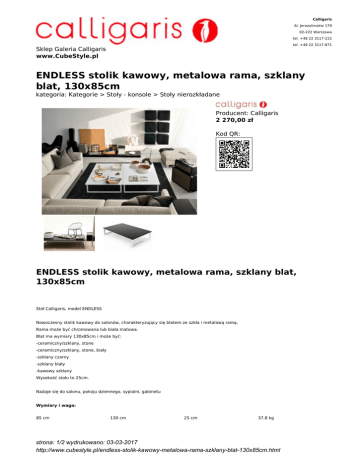 Calligaris Al. Jerozolimskie 179 02-222 Warszawa tel. +48 22 3117-222 tel. +48 22 3117-871 Sklep Galeria Calligaris www.CubeStyle.pl ENDLESS stolik kawowy, metalowa rama, szklany blat, 130x85cm kategoria: Kategorie > Stoły - konsole > Stoły nierozkładane Producent: Calligaris 2 270,00 zł Kod QR: ENDLESS stolik kawowy, metalowa rama, szklany blat, 130x85cm Stół Calligaris, model ENDLESS Nowoczesny stolik kawowy do salonów, charakteryzujący się blatem ze szkła i metalową ramą. Rama może być chromowana lub biała matowa. Blat ma wymiary 130x85cm i może być: -ceramiczny/szklany, stone -ceramiczny/szklany, stone, biały -szklany czarny -szklany biały -kawowy szklany Wysokość stołu to 25cm. Nadaje się do salonu, pokoju dziennego, sypialni, gabinetu Wymiary i waga: 85 cm 130 cm 25 cm 37.8 kg strona: 1/2 wydrukowano: 03-03-2017 http://www.cubestyle.pl/endless-stolik-kawowy-metalowa-rama-szklany-blat-130x85cm.html Czas dostawy: 6-8 tygodni Dostępne wersje: Structure Glass top Glass/Ceramic Top strona: 2/2 wydrukowano: 03-03-2017 http://www.cubestyle.pl/endless-stolik-kawowy-metalowa-rama-szklany-blat-130x85cm.html