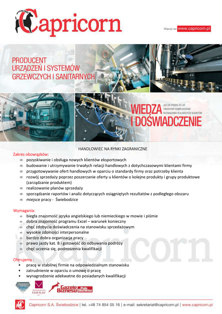 HANDLOWIEC NA RYNKI ZAGRANICZNE Zakres obowiązków: • pozyskiwanie i obsługa nowych klientów eksportowych • budowanie i utrzymywanie trwałych relacji handlowych z dotychczasowymi klientami firmy • przygotowywanie ofert handlowych w oparciu o standardy firmy oraz potrzeby klienta • rozwój sprzedaży poprzez poszerzanie oferty u klientów o kolejne produkty i grupy produktowe (zarządzanie produktem) • realizowanie planów sprzedaży • sporządzanie raportów i analiz dotyczących osiągniętych rezultatów z podległego obszaru • miejsce pracy - Świebodzice Wymagania: • biegła znajomość języka angielskiego lub niemieckiego w mowie i piśmie • dobra znajomość programu Excel – warunek konieczny • chęć zdobycia doświadczenia na stanowisku sprzedażowym • wysokie zdolności interpersonalne • bardzo dobra organizacja pracy • prawo jazdy kat. B i gotowość do odbywania podróży • chęć uczenia się, podnoszenia kwalifikacji Oferujemy : • pracę w stabilnej firmie na odpowiedzialnym stanowisku • zatrudnienie w oparciu o umowę o pracę • wynagrodzenie adekwatne do posiadanych kwalifikacji