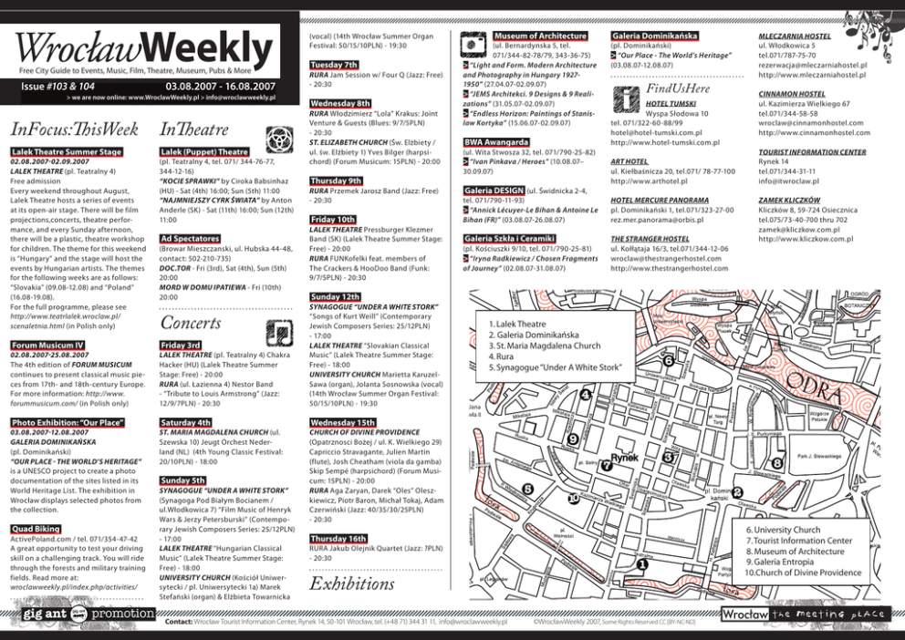 WrocławWeekly Free City Guide to Events, Music, Film, Theatre, Museum, Pubs & More Issue #103 & 104 03.08.2007 - 16.08.2007 > we are now online: www.WroclawWeekly.pl > [email protected] InFocus:ThisWeek InTheatre 02.08.2007-02.09.2007 LALEK THEATRE (pl. Teatralny 4) Free admission Every weekend throughout August, Lalek Theatre hosts a series of events at its open-air stage. There will be film projections,concerts, theatre performance, and every Sunday afternoon, there will be a plastic, theatre workshop for children. The theme for this weekend is “Hungary” and the stage will host the events by Hungarian artists. The themes for the following weeks are as follows: “Slovakia” (09.08-12.08) and “Poland” (16.08-19.08). For the full programme, please see http://www.teatrlalek.wroclaw.pl/ scenaletnia.html (in Polish only) (pl. Teatralny 4, tel. 071/ 344-76-77, 344-12-16) “Kocie sprawki” by Ciroka Babsinhaz (HU) - Sat (4th) 16:00; Sun (5th) 11:00 “Najmniejszy Cyrk Świata” by Anton Anderle (SK) - Sat (11th) 16:00; Sun (12th) 11:00 Lalek Theatre Summer Stage Forum Musicum IV 02.08.2007-25.08.2007 The 4th edition of Forum Musicum continues to present classical music pieces from 17th- and 18th-century Europe. For more information: http://www. forummusicum.com/ (in Polish only) Lalek (Puppet) Theatre Ad Spectatores (Browar Mieszczanski, ul. Hubska 44-48, contact: 502-210-735) Doc.tor - Fri (3rd), Sat (4th), Sun (5th) 20:00 Mord w domu Ipatiewa - Fri (10th) 20:00 Concerts Friday 3rd LALEK THEATRE (pl. Teatralny 4) Chakra Hacker (HU) (Lalek Theatre Summer Stage: Free) - 20:00 RURA (ul. Łazienna 4) Nestor Band - “Tribute to Louis Armstrong” (Jazz: 12/9/7PLN) - 20:30 (vocal) (14th Wrocław Summer Organ Festival: 50/15/10PLN) - 19:30 Tuesday 7th RURA Jam Session w/ Four Q (Jazz: Free) - 20:30 Wednesday 8th RURA Włodzimierz “Lola” Krakus: Joint Venture & Guests (Blues: 9/7/5PLN) - 20:30 ST. ELIZABETH CHURCH (Św. Elżbiety / ul. św. Elżbiety 1) Yves Bilger (harpsichord) (Forum Musicum: 15PLN) - 20:00 Thursday 9th RURA Przemek Jarosz Band (Jazz: Free) - 20:30 Friday 10th LALEK THEATRE Pressburger Klezmer Band (SK) (Lalek Theatre Summer Stage: Free) - 20:00 RURA FUNKofelki feat. members of The Crackers & HooDoo Band (Funk: 9/7/5PLN) - 20:30 Photo Exhibition: “Our Place” Saturday 4th Wednesday 15th ST. MARIA MAGDALENA CHURCH (ul. Szewska 10) Jeugt Orchest Nederland (NL) (4th Young Classic Festival: 20/10PLN) - 18:00 CHURCH OF DIVINE PROVIDENCE (Opatrznosci Bożej / ul. K. Wielkiego 29) Capriccio Stravagante, Julien Martin (flute), Josh Cheatham (viola da gamba) Skip Sempé (harpsichord) (Forum Musicum: 15PLN) - 20:00 RURA Aga Zaryan, Darek “Oles” Oleszkiewicz, Piotr Baron, Michał Tokaj, Adam Czerwiński (Jazz: 40/35/30/25PLN) - 20:30 Quad Biking ActivePoland.com / tel. 071/354-47-42 A great opportunity to test your driving skill on a challenging track. You will ride through the forests and military training fields. Read more at: wroclawweekly.pl/index.php/activities/ Sunday 5th Galeria Dominikańska MLECZARNIA Hostel ul. Włodkowica 5 tel.071/787-75-70 [email protected] http://www.mleczarniahostel.pl (pl. Dominikański) > “Our Place - The World’s Heritage” (03.08.07-12.08.07) FindUsHere Cinnamon Hostel ul. Kazimierza Wielkiego 67 tel.071/344-58-58 [email protected] http://www.cinnamonhostel.com Hotel Tumski Wyspa Słodowa 10 tel. 071/322-60-88/99 [email protected] http://www.hotel-tumski.com.pl BWA Awangarda (ul. Wita Stwosza 32, tel. 071/790-25-82) > “Ivan Pinkava / Heroes” (10.08.07– 30.09.07) ART HOTEL ul. Kiełbaśnicza 20, tel.071/ 78-77-100 http://www.arthotel.pl Galeria DESIGN (ul. Świdnicka 2-4, tel. 071/790-11-93) > “Annick Lécuyer-Le Bihan & Antoine Le Bihan (FR)” (03.08.07-26.08.07) Hotel Mercure Panorama pl. Dominikański 1, tel.071/323-27-00 [email protected] Galeria Szkła i Ceramiki The Stranger Hostel ul. Kołłątaja 16/3, tel.071/344-12-06 [email protected] http://www.thestrangerhostel.com (pl. Kościuszki 9/10, tel. 071/790-25-81) > “Iryna Radkiewicz / Chosen Fragments of Journey” (02.08.07-31.08.07) Tourist Information Center Rynek 14 tel.071/344-31-11 [email protected] Zamek Kliczków Kliczków 8, 59-724 Osiecznica tel.075/73-40-700 thru 702 [email protected] http://www.kliczkow.com.pl Sunday 12th SYNAGOGUE “UNDER A WHITE STORK” “Songs of Kurt Weill” (Contemporary Jewish Composers Series: 25/12PLN) - 17:00 LALEK THEATRE “Slovakian Classical Music” (Lalek Theatre Summer Stage: Free) - 18:00 UNIVERSITY CHURCH Marietta KaruzelSawa (organ), Jolanta Sosnowska (vocal) (14th Wrocław Summer Organ Festival: 50/15/10PLN) - 19:30 03.08.2007-12.08.2007 GALERIA DOMINIKAŃSKA (pl. Dominikański) “Our Place - The World’s Heritage” is a UNESCO project to create a photo documentation of the sites listed in its World Heritage List. The exhibition in Wrocław displays selected photos from the collection. SYNAGOGUE “UNDER A WHITE STORK” (Synagoga Pod Białym Bocianem / ul.Włodkowica 7) “Film Music of Henryk Wars & Jerzy Petersburski” (Contemporary Jewish Composers Series: 25/12PLN) - 17:00 LALEK THEATRE “Hungarian Classical Music” (Lalek Theatre Summer Stage: Free) - 18:00 UNIVERSITY CHURCH (Kościół Uniwersytecki / pl. Uniwersytecki 1a) Marek Stefański (organ) & Elżbieta Towarnicka Museum of Architecture (ul. Bernardynska 5, tel. 071/344-82-78/79, 343-36-75) > “Light and Form. Modern Architecture and Photography in Hungary 19271950” (27.04.07-02.09.07) > “JEMS Architekci. 9 Designs & 9 Realizations” (31.05.07-02.09.07) > “Endless Horizon: Paintings of Stanislaw Kortyka” (15.06.07-02.09.07) 1. Lalek Theatre 2. Galeria Dominikańska 3. St. Maria Magdalena Church 4. Rura 5. Synagogue “Under A White Stork” 6 4 pl. Jana Pawła II 9 3 7 5 8 2 10 6. University Church 7. Tourist Information Center 8. Museum of Architecture 9. Galeria Entropia 10.Church of Divine Providence Thursday 16th RURA Jakub Ol