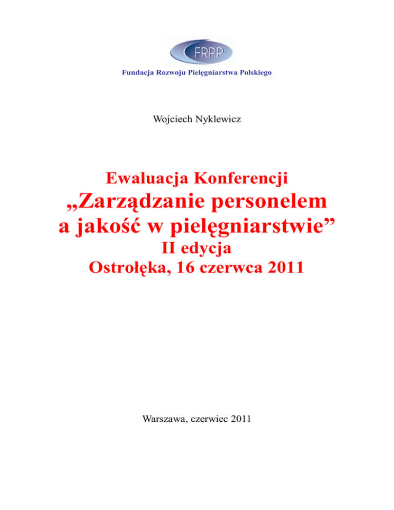 Fundacja Rozwoju Pielęgniarstwa Polskiego Wojciech Nyklewicz Ewaluacja Konferencji „Zarządzanie personelem a jakość w pielęgniarstwie” II edycja Ostrołęka, 16 czerwca 2011 Warszawa, czerwiec 2011 Ewaluacja Konferencji „Zarządzanie personelem a jakość w pielęgniarstwie” II edycja Ostrołęka, 16 czerwca 2011 ________________________________________________________________________________ W dniu 16 czerwca 2011 r. obyła się w Ostrołęce II edycja Konferencji „Zarządzanie personelem a jakość w pielęgniarstwie”. Według listy obecności, uczestniczyło w niej 58 pielęgniarek i położnych oraz 13 wykładowców (łącznie 71 osób). Kwestionariusz ewaluacji Konferencji został wypełniony przez 43 osoby, w tym 20 pielęgniarek oddziałowych, 11 pielęgniarek odcinkowych, 4 pielęgniarki koordynujące, 3 pielęgniarki przełożone oraz 2 kierowników i 1 nauczyciel akademicki. Jedna osoba nie podała informacji o swoim stanowisku pracy. Średni staż pracy badanych wynosił 23 lata, największą grupę (56%) stanowiły osoby w przedziale stażu pracy pomiędzy 21 a 30 lat. 56% 60% 50% 40% 26% 30% 20% 10% Serie1 9% 7% 0% 0 10 11 20 21 30 31 40 pow 41 staż pracy Wykres 1. Staż pracy uczestników konferencji. Prawie połowa badanych (44%) uczestniczyła po raz pierwszy w konferencji organizowanej przez FRPP, zaś dla 1/3 była to już druga konferencja. 50% 44% 40% 33% 30% Serie1 20% Serie2 12% 7% 10% 0% 1 2 3 4 5 6 7 Wykres 2. Procent uczestników konferencji ze względu na staż pracy. Zdaniem 70% oceniających, konferencja była bardzo przydatna, a 26% stwierdziło, że raczej przydatna. Ocen negatywnych nie było. _____________________________________________________________________ Warszawa, czerwiec 2011 2 Ewaluacja Konferencji „Zarządzanie personelem a jakość w pielęgniarstwie” II edycja Ostrołęka, 16 czerwca 2011 ________________________________________________________________________________ Czternastu respondentów mogło dokonać ewaluacji konferencji przy użyciu nowego kwestionariusza, w którym zapytano o ocenę organizacji konferencji, sposób jej prowadzenia i stopień spełnienia oczekiwań. Zastosowano skalę numeryczną od 1 do 6, oznaczającą odpowiednio oceny: niedostateczny, mierny, dostateczny, dobry, bardzo dobry, doskonały. 5,25 5,214286 5,214286 5,2 5,15 5,1 Serie1 5,071429 5,05 5 organizacja prowadzenie spełnienie oczekiwań oceny Wykres 3. Ocena organizacji, prowadzenia konferencji i spełnienia oczekiwań. Z wykresu wynika, że mimo wysokich ocen we wszystkich trzech kategoriach (powyżej wartości 5,05), najwyższe noty otrzymały ex aequo organizacja i prowadzenie konferencji (5,21). Oczekiwania 14 osób zostały spełnione w stopniu 5,07. _____________________________________________________________________ Warszawa, czerwiec 2011 3 Ewaluacja Konferencji „Zarządzanie personelem a jakość w pielęgniarstwie” II edycja Ostrołęka, 16 czerwca 2011 ________________________________________________________________________________ Uczestnicy konferencji mieli możliwość ocenienia tematów przedstawianych wykładów w skali stopniowej od 1 do 6 z wartościami opisowymi jak wyżej. 5,6 5,517857 5,5 5,363095 5,4 5,3 5,214286 5,2 5,386905 5,375 5,202381 5,120371 Serie1 5,053572 5,1 5 4,9 4,8 1 temat 1 temat 1 temat 2 temat 2 temat 2 temat 3 temat 3 temat 1 2 3 1 2 3 1 2 Wykres 4. Ocena tematów prelekcji. Z zestawienia ocen wynika, iż najwyższą notę w skali od 5,0 do 5,6 otrzymał temat 3 w sesji II („Projekt oceny pracowników w IP CZD”), najniższą zaś ocenę temat 3 w sesji I („Badanie jakości opieki pielęgniarskiej w oddziałach pediatrycznych, jako element zarządzania”). Należy podkreślić, że wszystkie tematy otrzymały ocenę powyżej 5,5 stopnia, zatem ich wartość była większa niż bardo dobra. W badaniu ewaluacyjnym, 14 uczestników mogło ocenić pracę prelegentów w skali od 1 do 6 z wartością opisową jak wyżej. 5,8 5,666667 5,6 5,4 5,5 5,333333 5,5 5,333333 5,25 5,25 5,2 5 Serie1 5 4,8 4,6 1 prel 1 1 prel 2 1 prel 3 2 prel 1 2 prel 2 2 prel 3 3 prel 1 3 prel 2 Wykres 5. Ocena prelegentów. _____________________________________________________________________ Warszawa, czerwiec 2011 4 Ewaluacja Konferencji „Zarządzanie personelem a jakość w pielęgniarstwie” II edycja Ostrołęka, 16 czerwca 2011 ________________________________________________________________________________ Średnie ocen plasowały się na poziomie 5,0 i wyższym. Najwyższą notę otrzymał prelegent 3 w sesji II, najniższą zaś prelegent 3 w sesji I. Zarówno najwyższe jak i najniższe oceny tematów i prelegentów są spójne, a wszystkie zostały wyrażone w skali powyżej 5,0, co oznacza, że zdaniem badanych, były one bardzo dobre. Uczestnicy badania wyrazili następujące oczekiwania co do przyszłych tematów konferencji i szkoleń, organizowanych przez FRPP (zapis jest dosłownym cytowaniem wypowiedzi uczestników): Etyka w zawodzie pielęgniarki (3 wskazania); szkolenie pana Piotra Jankowskiego (przedstawiciel medyczny) (2 wskazania); kursy kwalifikacyjne lub specjalistyczne z pielęgniarstwa kardiologicznego; wypalenie zawodowe – jak mu przeciwdziałać (2 wskazania); każdy temat związany z pielęgniarstwem; skutki prawne czynności wykonywanych poza zakresem kompetencji pielęgniarek; choroby zawodowe; zakażenia szpitalne – profilaktyka (2 wskazania); rozmowa z trudnym pacjentem; planowanie obsad pielęgniarskich (2 wskazania); wynagradzanie, ocena pracownika i przełożonego (2 wskazania); zagadnienia prawne; narzędzia i argumenty, jakimi powinniśmy się posługiwać w rozmowach z pracodawcą nt. awansu, sposobu wynagradzania, motywowania; zagadnienia odpowiedzialności zawodowej, prawnej, gdzie jest granica między decyzją pacjenta a możliwościami pomocy pacjentowi; możliwości awansu w pracy zawodowej; szkolenia dla pielęgniarek operacyjnych; kształcenie, rozwój zawodowy a