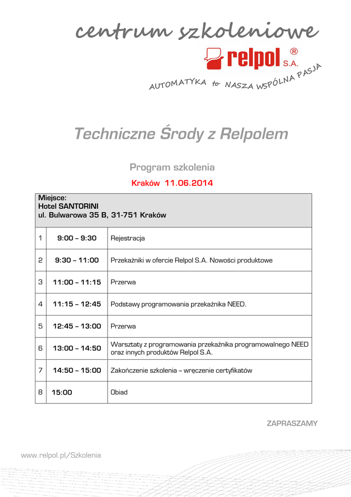 centrum szkoleniowe AUT O M LN ATYKA to NASZA WSPÓ A S PA JA Techniczne Środy z Relpolem Program szkolenia Kraków 11.06.2014 Miejsce: Hotel SANTORINI ul. Bulwarowa 35 B, 31-751 Kraków 1 9:00 – 9:30 2 9:30 – 11:00 3 11:00 – 11:15 Przerwa 4 11:15 – 12:45 Podstawy programowania przekaźnika NEED. 5 12:45 – 13:00 Przerwa 6 13:00 – 14:50 Warsztaty z programowania przekaźnika programowalnego NEED oraz innych produktów Relpol S.A. 7 14:50 – 15:00 Zakończenie szkolenia – wręczenie certyfikatów 8 15:00 Obiad Rejestracja Przekaźniki w ofercie Relpol S.A. Nowości produktowe ZAPRASZAMY www.relpol.pl/Szkolenia