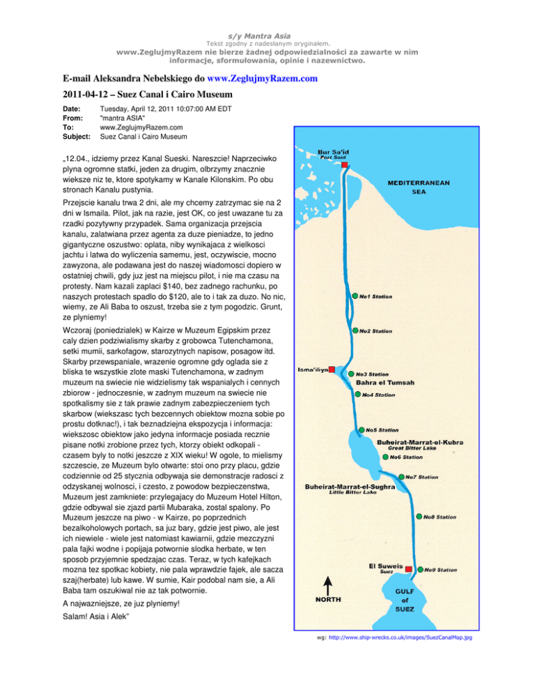 s/y Mantra Asia Tekst zgodny z nadesłanym oryginałem. www.ZeglujmyRazem nie bierze żadnej odpowiedzialności za zawarte w nim informacje, sformułowania, opinie i nazewnictwo. E-mail Aleksandra Nebelskiego do www.ZeglujmyRazem.com 2011-04-12 – Suez Canal i Cairo Museum Date: From: To: Subject: Tuesday, April 12, 2011 10:07:00 AM EDT "mantra ASIA" www.ZeglujmyRazem.com Suez Canal i Cairo Museum „12.04., idziemy przez Kanal Sueski. Nareszcie! Naprzeciwko plyna ogromne statki, jeden za drugim, olbrzymy znacznie wieksze niz te, ktore spotykamy w Kanale Kilonskim. Po obu stronach Kanalu pustynia. Przejscie kanalu trwa 2 dni, ale my chcemy zatrzymac sie na 2 dni w Ismaila. Pilot, jak na razie, jest OK, co jest uwazane tu za rzadki pozytywny przypadek. Sama organizacja przejscia kanalu, zalatwiana przez agenta za duze pieniadze, to jedno gigantyczne oszustwo: oplata, niby wynikajaca z wielkosci jachtu i latwa do wyliczenia samemu, jest, oczywiscie, mocno zawyzona, ale podawana jest do naszej wiadomosci dopiero w ostatniej chwili, gdy juz jest na miejscu pilot, i nie ma czasu na protesty. Nam kazali zaplaci $140, bez zadnego rachunku, po naszych protestach spadlo do $120, ale to i tak za duzo. No nic, wiemy, ze Ali Baba to oszust, trzeba sie z tym pogodzic. Grunt, ze plyniemy! Wczoraj (poniedzialek) w Kairze w Muzeum Egipskim przez caly dzien podziwialismy skarby z grobowca Tutenchamona, setki mumii, sarkofagow, starozytnych napisow, posagow itd. Skarby przewspaniale, wrazenie ogromne gdy oglada sie z bliska te wszystkie zlote maski Tutenchamona, w zadnym muzeum na swiecie nie widzielismy tak wspanialych i cennych zbiorow - jednoczesnie, w zadnym muzeum na swiecie nie spotkalismy sie z tak prawie zadnym zabezpieczeniem tych skarbow (wiekszasc tych bezcennych obiektow mozna sobie po prostu dotknac!), i tak beznadziejna ekspozycja i informacja: wiekszosc obiektow jako jedyna informacje posiada recznie pisane notki zrobione przez tych, ktorzy obiekt odkopali czasem byly to notki jeszcze z XIX wieku! W ogole, to mielismy szczescie, ze Muzeum bylo otwarte: stoi ono przy placu, gdzie codziennie od 25 stycznia odbywaja sie demonstracje radosci z odzyskanej wolnosci, i czesto, z powodow bezpieczenstwa, Muzeum jest zamkniete: przylegajacy do Muzeum Hotel Hilton, gdzie odbywal sie zjazd partii Mubaraka, zostal spalony. Po Muzeum jeszcze na piwo - w Kairze, po poprzednich bezalkoholowych portach, sa juz bary, gdzie jest piwo, ale jest ich niewiele - wiele jest natomiast kawiarnii, gdzie mezczyzni pala fajki wodne i popijaja potwornie slodka herbate, w ten sposob przyjemnie spedzajac czas. Teraz, w tych kafejkach mozna tez spotkac kobiety, nie pala wprawdzie fajek, ale sacza szaj(herbate) lub kawe. W sumie, Kair podobal nam sie, a Ali Baba tam oszukiwal nie az tak potwornie. A najwazniejsze, ze juz plyniemy! Salam! Asia i Alek” wg: http://www.ship-wrecks.co.uk/images/SuezCanalMap.jpg s/y Mantra Asia 2 wg: http://maps.google.com/maps?hl=en&ie=UTF8&ll=24.246965,28.081055&spn=21.729036,47.900391&t=h&z=5