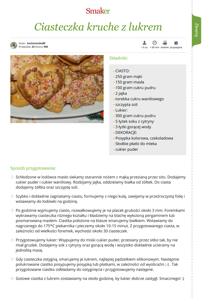 Ciasteczka kruche z lukrem Autor: kuchareczka89 Przepisów: 33 Ocena: 949 > 6 os. > 60 min średnie przystępne Składniki: CIASTO: 250 gram mąki 150 gram masła 100 gram cukru pudru 2 jajka torebka cukru waniliowego szczypta soli Lukier: 300 gram cukru pudru 5 łyżek soku z cytryny 3 łyżki gorącej wody DEKORACJE: Posypka kolorowa, czekoladowa Słodkie płatki do mleka cukier puder Sposób przygotowania: 1 Schłodzone w lodówce masło siekamy starannie nożem z mąką przesianą przez sito. Dodajemy cukier puder i cukier waniliowy. Rozbijamy jajka, oddzielamy białka od żółtek. Do ciasta dodajemy żółtka oraz szczyptę soli. 2 Szybko i dokładnie zagniatamy ciasto, formujemy z niego kulę, zawijamy w przeźroczystą folię i wstawiamy do lodówki na godzinę. 3 Po godzinie wyjmujemy ciasto, rozwałkowujemy je na placek grubości około 3 mm. Foremkami wykrawamy ciasteczka różnego kształtu i kładziemy na blachę wyłożoną pergaminem lub posmarowaną masłem. Ciastka położone na blasze smarujemy białkiem. Wstawiamy do nagrzanego do 175*C piekarnika i pieczemy około 10-15 minut. Z przygotowanego ciasta, w zależności od wielkości foremek, wychodzi około 30 ciasteczek. 4 Przygotowujemy lukier: Wsypujemy do miski cukier puder, przesiany przez sitko tak, by nie miał grudek. Dodajemy sok z cytryny oraz gorącą wodę i wszystko dokładnie ucieramy na jednolitą masę. 5 Gdy ciasteczka ostygną, smarujemy je lukrem, najlepiej pędzelkiem silikonowym. Następnie polukrowane ciastko posypujemy posypką lub płatkami, w zależności od wyobraźni ;-) . Tak przygotowane ciastko odkładamy do ostygnięcia i przygotowujemy następne. 6 Gotowe ciastka z lukrem zostawiamy na około godzinę, by lukier dobrze zastygł. Smacznego! :) Twoje notatki do przepisu: