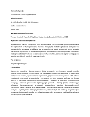 Nazwa instytucji: Ministerstwo Spraw Zagranicznych Adres instytucji: al. J. Ch. Szucha 23, 00-580 Warszawa Liczba pracowników: ponad 200 Nazwa stanowiska/menedżer: Tomasz Sadzioski-Naczelnik Wydziału Modernizacji, Sekretariat Ministra, MSZ Wyzwanie z zakresu zarządzania: Wyzwaniem z zakresu zarządzania było wykorzystanie zasobu innowacyjności pracowników do usprawnieo w funkcjonowaniu resortu. Tradycyjne metody zgłaszania pomysłów na usprawnienia wymagają przebijania się pracownika ze swoją propozycją przez szczeble hierarchii w organizacji, co może demotywowad pracowników. Ponadto problem silosowości może prowadzid do trudności w realizacji nowych pomysłów, ponieważ często wymagają one współpracy różnych komórek organizacyjnych. Typ projektu: Projekt organizacyjny Cel projektu: Stworzenie narzędzia i kanału, poprzez który pracownicy w efektywny sposób mogliby zgłaszad nowe pomysły organizacyjne. W konsekwencji realizacji pomysłów – zwiększenie efektywności resortu, wprowadzenie usprawnieo, poprawa warunków pracy w MSZ, a także zwiększenie motywacji pracowników i wywołanie w nich poczucia wpływu na decyzje resortu. Z założenia narzędzie miało uwzględniad: - łatwośd w zgłaszaniu pomysłów (nie obciążając czasowo pracownika zgłaszającego pomysł) - formę (mail) umożliwiającą zgłaszanie konstruktywnych propozycji pracowników (zamiast bezproduktywnych krytycznych uwag) - wiedzę właściwej komórki i planowane projekty w zakresie zgłaszanego pomysłu - wykorzystanie dostępnych zasobów pracowniczych do realizacji projektów (bez tworzenia dodatkowych etatów na realizację propozycji) - stworzenie możliwości wspierania innowacyjności pracowników. Liczba osób zaangażowanych w zmianę: 1 osoba dedykowana do projektu w ramach obowiązków służbowych, koordynator (naczelnik Wydziału Modernizacji) + 3-7 osób z departamentów czy biur zaangażowanych w realizację danego projektu w zależności od jego zakresu. Główne etapy projektu: Etapy projektu zgodne ze ścieżką – „od pomysłu do realizacji”: 1. Stworzenie narzędzia „skrzynki modernizacyjnej”, na którą pracownicy przesyłają propozycję modernizacyjną. 2. Stworzenie bazy danych z informacjami o propozycjach (strona w portalu) 3. Wstępna analiza propozycji 4. Skierowanie propozycji do dyrektora właściwej komórki / dyrektorów komórek 5. Ocena propozycji przez właściwą komórkę 6. Wyznaczenie przez dyrektora osoby / osób zaangażowanych w projekt (pracownicy, którzy mogą zrealizowad propozycję w ramach swojego zakresu obowiązków) 7. Wypracowanie modelu komunikacji z autorem propozycji (informacje o statusie pomysłu) 8. Wypracowanie komunikacji na temat wszystkich propozycji (komunikaty w intranecie, Biuletynie Pracowniczym) 9. Wypracowanie narzędzi motywujących do zgłaszania pomysłów - komunikacja propozycji komunikacja o statusie propozycji do autora - doroczna Nagroda Ministra (i osobiste podziękowanie autorowi przez Ministra) za najlepszy pomysł modernizacyjny. Czas trwania wdrożenia: od lipca 2012 Twarde rezultaty projektu: Ponad 100 zgłoszonych propozycji modernizacyjnych; 20 zrealizowanych, 30 odrzuconych, pozostałe w fazie wyjaśnieo i realizacji Efekty wybranych zrealizowanych pomysłów:Stworzenie szatni dla rowerzystów, z której każdego dnia korzysta 25 pracowników – w tygodniu pokonują oni średnio około 1230 km przemierzając drogę do/z pracy do/z domu. - Współpraca z Urzędem Miasta st. Warszawy w zakresie postawienia kolejnych stojaków na rowery dla pracowników ale i gości MSZ. - Stworzenie dodatkowych sal spotkao z dostępnych powierzchni komunikacyjnych – do momentu zgłoszenia propozycji ograniczenia czasowe i lokalowe. - Stworzenie zakładki bezpieczeostwo w intranecie (m.in. antykorupcja, BHP, bezpieczeostwo na placówkach) wraz ze wskazówkami dla pracowników – umożliwia szybki dostęp do zagadnieo – 10 000 wizyt na stronie od momentu jej stworzenia (2014 r.). - Stworzenie tematycznej skrzynki „konserwacja”, na którą pracownicy zgłaszają problemy techniczne – aktualnie zostało zgłoszonych i zrealizowanych (bądź w trakcie realizacji) 300 problemów technicznych; powstanie skrzynki znacznie przyśpieszyło realizację zgłoszeo. - Stworzenie zakładki „menu w intranecie” – dziennie około 150 odwiedzin strony; zakładka zawiera menu stołówki MSZ jak i stołówek resortów położonych w bliskiej odległości od MSZ. - Wyeksponowanie na witrynie MSZ map i infografik. Współpraca różnych biur / komórek przy realizacji pomysłów. Zewnętrzne oceny efektów wdrożenia: - satysfakcja pracowników z wdrożonych pomysłów (podziękowania wpływające na skrzynkę [email protected]); - większa motywacja do zgłaszania pomysłów – wzrost liczby zgłaszanych pomysłów; - motywowanie pracowników do zdrowego trybu życia (coraz więcej osób przyjeżdża do pracy na rowerze); - doroczna nagroda Ministra za najlepszy pomysł modernizacyjny (2012, 2013). Charakter zaangażowania menedżera: Tomasz Sadzioski – koordynator pomysłów modernizacyjnych, lider zespołów zadaniowych przy realizacji propozycji. Lista i opis wykonywanych czynności: - Dbałośd o skuteczną wymianę niezbędnych do pracy informacji z realizatorami i interesariuszami projektów przy wykorzystaniu odpowiednich metod. - Motywowanie osób zaangażowanych w projekt do pokonywania trudności oraz odpowiednich działao ukierunkowanych na realizację założonych celów. - Monitoring i organizowanie pracy projektowej realizowanej przez różne komórki. - Ocena i analiza danych, wnikliwośd i dostrzeganie zależności w procesie realizacji projektów. - Zarządzanie różnorodnymi zasobami.