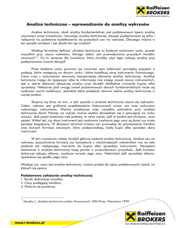 Analiza techniczna – wprowadzenie do analizy wykresów Analiza techniczna, obok analizy fundamentalnej, jest podstawowym typem analizy używanym przez Inwestorów. Używając analizy technicznej, decyzje podejmowane są tylko i wyłącznie na podstawie kształtowania się przeszłych cen na wykresie. Dlaczego można w ten sposób zarabiać i jak działa ten typ analizy? Według formalnej definicji „Analiza techniczna to badanie zachowań rynku, przede wszystkim przy użyciu wykresów, którego celem, jest przewidywanie przyszłych trendów cenowych”1. Co to oznacza dla Inwestora, który chciałby użyć tego rodzaju analizy przy podejmowaniu swoich decyzji? Przez badanie rynku powinno się rozumieć opis zależności pomiędzy popytem a podażą, które występują na danym rynku i które kształtują cenę instrumentu finansowego. Cena wraz z wolumenem stanowią najważniejsze elementy analizy technicznej. Analityk techniczny mając do dyspozycji tylko te informacje (nie znając nawet nazwy instrumentu!), jest w stanie dokonać obszernej analizy oraz określić dokładnie momenty kupna albo sprzedaży. Niebranie pod uwagę nawet podstawowych danych fundamentalnych może się wydawać czymś osobliwym, jednakże takie podejście stanowi sedno analizy technicznej w czystej postaci. Skupmy się teraz na tym, w jaki sposób w analizie technicznej używa się wykresów. Celem wykresu jest graficzne przedstawienie historycznych zmian cen oraz wolumenu wybranego instrumentu. Wykres przekazuje więc wszystkie potrzebne przy analizie technicznej dane! Patrząc na wykres można szybko dowiedzieć się o panującej na rynku sytuacji. Jeśli popyt przeważa nad podażą, to cena rośnie, jeśli to podaż jest silniejsza, cena spada. Widać też, czy dany instrument jest ryzykowny (wahania jego ceny są duże) czy może bardziej bezpieczny. W dłuższym terminie zmiany cen prowadzą do powstawania trendów oraz licznych formacji cenowych, które podpowiadają, kiedy kupić albo sprzedać dany instrument. W tym momencie należy określić główne zadanie analizy technicznej. Analiza cen na wykresie, poszukiwanie formacji czy korzystanie z najróżniejszych wskaźników ma na celu podanie jak najlepszego momentu do kupna albo sprzedaży instrumentu. Narzędzia stosowane w analizie technicznej mają pomóc w przewidywaniu przyszłości. Jeśli Inwestor dokonuje zakupu aktywa, oczekuje wzrostu jego ceny. Natomiast jeśli sprzedaje aktywo, spodziewa się spadku jego ceny. Wiedząc już, czym jest analiza techniczna, można przejść do opisu podstawowych zasad, na których się opiera. Podstawowe założenia analizy technicznej 1. Rynek dyskontuje wszystko, 2. Ceny podlegają trendom, 3. Historia się powtarza. 1 Murphy J., Analiza techniczna rynków finansowych, WIG-Press, Warszawa 1999 Ad. 1. W poprzedniej części wspomniano, że centralnym punktem analizy technicznej jest badanie ceny danego instrumentu. Aby analiza ta była skuteczna, cena powinna uwzględniać wszystkie elementy, które mają na nią wpływ. Oznacza to, że wszystkie czynniki psychologiczne, fundamentalne lub ekonomiczne znajdują pełne odbicie w aktualnej cenie. Dzięki temu analizując samą cenę, która jest skutkiem gry popytu i podaży na dany instrument, nie trzeba znać i badać poszczególnych elementów, które na nią wpływają. Ad. 2. Kolejnym założeniem analizy technicznej jest istnienie trendów. Trendy bada się w dwóch celach. Po pierwsze, zgodnie z twierdzeniem, że istnieje większe prawdopodobieństwo utrzymania się już istniejącego trendu, niż jego zmiany, należy szukać długoterminowego kierunku, w którym porusza się cena tak, aby dokonywać transakcji zgodnie z panującym trendem. Po drugie, można wypatrywać przesłanek sugerujących zmianę kierunku ceny, tak aby jak najwcześniej zająć pozycję zgodną z nowym trendem. Ad. 3. Ostatnią ważną dla analizy technicznej koncepcją jest powtarzalność historii. Badamy wykresy po to, aby znaleźć wzory, według których porusza się cena. Ich istnienie wynika z ludzkiej psychiki i powtarzalności zachowań – zakłada się, że jeśli dana formacja sprawdziła się w przeszłości, zadziała także i teraz. Analitycy znając najczęściej występujące wzory (formacje), starają się odnaleźć je w bieżących notowaniach i na tej podstawie prognozować przyszłość. Przykłady powtarzalności formacji Podwójne dno Przykład 1. Wykres dzienny EUR/USD z zaznaczonym podwójnym dnem (2009 rok). Źródło: Opracowanie własne w programie MetaTrader 4 Przykład 2. Wykres dzienny EUR/USD z zaznaczonym podwójnym dnem (2010 rok). Źródło: Opracowanie własne w programie MetaTrader 4 Trójkąt symetryczny Przykład 3. Trójkąt symetryczny na złocie w sierpniu 2010 roku, wykres godzinowy. Źródło: Opracowanie własne w programie MetaTrader 4 Przykład 4. Trójkąt symetryczny na złocie w czerwcu 2011 roku, wykres godzinowy. Źródło: Opracowanie własne w programie MetaTrader 4