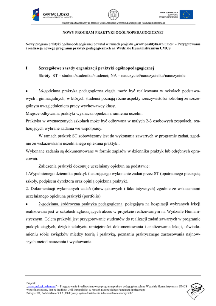 NOWY PROGRAM PRAKTYKI OGÓLNOPEDAGOGICZNEJ Nowy program praktyki ogólnopedagogicznej powstał w ramach projektu „www.praktyki.wh.umcs” - Przygotowanie i realizacja nowego programu praktyk pedagogicznych na Wydziale Humanistycznym UMCS. I. Szczegółowe zasady organizacji praktyki ogólnopedagogicznej Skróty: ST – student/studentka/studenci; NA – nauczyciel/nauczycielka/nauczyciele 36-godzinna praktyka pedagogiczna ciągła może być realizowana w szkołach podstawo- wych i gimnazjalnych, w których studenci poznają różne aspekty rzeczywistości szkolnej ze szczególnym uwzględnieniem pracy wychowawcy klasy. Miejsce odbywania praktyki wyznacza opiekun z ramienia uczelni. Praktyka w wyznaczonych szkołach może być odbywana w małych 2-3 osobowych zespołach, realizujących wybrane zadania we współpracy. W ramach praktyk ST zobowiązany jest do wykonania zawartych w programie zadań, zgodnie ze wskazówkami uczelnianego opiekuna praktyki. Wykonane zadania są dokumentowane w formie zapisów w dzienniku praktyk lub odrębnych opracowań. Zaliczenia praktyki dokonuje uczelniany opiekun na podstawie: 1.Wypełnionego dziennika praktyk ilustrującego wykonanie zadań przez ST (opatrzonego pieczęcią szkoły, podpisem dyrektora oraz opinią opiekuna praktyk). 2. Dokumentacji wykonanych zadań (obowiązkowych i fakultatywnych) zgodnie ze wskazaniami uczelnianego opiekuna praktyki (portfolio). 2-godzinna, śródroczna praktyka pedagogiczna, polegająca na hospitacji wybranych lekcji realizowana jest w szkołach zgłaszających akces w projekcie realizowanym na Wydziale Humanistycznym. Celem praktyki jest przygotowanie studentów do realizacji zadań zawartych w programie praktyk ciągłych, dzięki: zdobyciu umiejętności dokumentowania i analizowania lekcji, uświadomieniu sobie związków między teorią i praktyką, poznaniu praktycznego zastosowania najnowszych metod nauczania i wychowania. Projekt: „www.praktyki.wh.umcs” - Przygotowanie i realizacja nowego programu praktyk pedagogicznych na Wydziale Humanistycznym UMCS współfinansowany jest ze środków Unii Europejskiej w ramach Europejskiego Funduszu Społecznego Priorytet III, Poddziałanie 3.3.2 „Efektywny system kształcenia i doskonalenia nauczycieli” 1. Zakres obowiązków uczelnianego opiekuna praktyki ogólnopedagogicznej Opiekun praktyki zobowiązany jest: 1. Przy realizacji programu praktyk uwzględnić specyfikę danego kierunku oraz realizowane treści kształcenia na zajęciach z pedagogiki. Szczegółowy program powinien przygotowywać do zadań, jakie stoją przed nauczycielami-wychowawcami klasy. 2. Udostępnić ST i omówić z nimi szczegółowy program (wraz z materiałami pomocniczymi). 3. Ustalić zasady kontaktu ze ST i opiekunami praktyki w szkole (mailowy, telefoniczny, osobisty). Wskazane jest nawiązanie kontaktu z opiekunem w szkole przed rozpoczęciem praktyki oraz uzgodnienie możliwości realizacji programu praktyki w danej placówce. 4. Zaliczyć ST praktykę poprzez wpisanie zaliczenia w odpowiednich dokumentach w oparciu o materiały przygotowane przez ST (dokumentujące wykonanie zadań). 5. Omówić przebieg i efekty praktyki, zwracając szczególną uwagę na autorefleksję ST. 6. Sporządzić sprawozdanie z przebiegu praktyki dla Biura Projektu. 2. Zakres obowiązków opiekuna praktyki ogólnopedagogicznej w szkole Szkolny opiekun praktyki ogólnopedagogicznej powinien: 1. Zapoznać się ze szczegółowym programem praktyki i ustalić ze ST harmonogram jej przebiegu (przed jej rozpoczęciem). 2. Poinformować drogą e-mailową opiekuna praktyk z ramienia uczelni o stawieniu się ST na praktykę i o zakończeniu przez nich praktyki. 3. Zaproponować własne pomysły/oczekiwania dotyczące aktywności ST w czasie trwania praktyki. 4. Umożliwić ST wielowymiarowe poznawanie rzeczywistości szkolnej, a zwłaszcza realizację założonych zadań przy współpracy innych NA i pracowników szkoły (uzyskać zgodę innych NA na hospitację lekcji różnych przedmiotów w różnych klasach oraz zajęć pozalekcyjnych, na zapoznanie się z dokumentacją szkolną, przeprowadzanie badań). 5. Umożliwienie ST samodzielnego przeprowadzenia godziny wychowawczej poprzez wspólne przygotowanie scenariusza ( w przypadku, kiedy nie jest wychowawcą zorganizowanie takiej pomocy). 6. Monitorować przebieg praktyki, potwierdzając jej prawidłowy przebieg i realizację zadań podpisem na kartach pracy w „Dzienniku praktyk”. Projekt: „www.praktyki.wh.umcs” - Przygotowanie i realizacja nowego programu praktyk pedagogicznych na Wydziale Humanistycznym UMCS współfinansowany jest ze środków Unii Europejskiej w ramach Europejskiego Funduszu Społecznego Priorytet III, Poddziałanie 3.3.2 „Efektywny system kształcenia i doskonalenia nauczycieli” 7. W razie jakichkolwiek problemów związanych z realizacją praktyki przez ST niezwłocznie poinformować uczelnianych opiekunów praktyk i Biuro Projektu. 8. Omawiać na bieżąco doświadczenia ST. 9. Ocenić i zaopiniować przebieg praktyki w „Dzienniku praktyk”, z wykorzystaniem karty oceny praktykanta (wzór nr 2 w załączniku). 10.Nauczyciel-opiekun ma prawo korzystać z wyników badań prowadzonych przez ST, a odnoszących się do funkcjonowania uczniów i klasy, w której ma wychowawstwo, oraz do własnej pracy nauczyciela. Może również angażować ST do pomocy w zakresie określonym przez program praktyki. 3. Zakres obowiązków studentów podczas praktyki ogólnopedagogicznej 1. ST mogą dokonać wyboru szkoły tyko spośród szkół biorących udział w projekcie. Z wykazem szkół ST zostaną zapoznani przez opiekuna praktyk z ramienia uczelni oraz pracownika dziekanatu w semestrze zajęć dydaktycznych poprzedzających rozpoczęcie praktyki. 2. ST otrzymuje z Biura Projektu Skierowanie na praktykę, które przedkłada Dyrekcji szkoły. 3. ST przed rozpoczęciem praktyki ogólnopedagogicznej powinien nawiązać kontakt z na