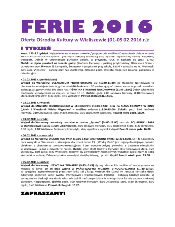 FERIE 2016 Oferta Ośrodka Kultury w Wieliszewie (01-05.02.2016 r.): I TYDZIEŃ ___________________________________________ Koszt: 175 zł / tydzień. Wyżywienie we własnym zakresie / po powrocie możliwość wykupienia obiadu w cenie 10 zł w bistro w GCK w Łajskach – prosimy o wstępną deklarację przy zapisach. Zapewniamy opiekę i bezpłatny transport. Odbiór w umówionych punktach zbiórki, w przypadku GCK w Łajskach do godz. 17:00. Zbiórki w pięciu punktach na terenie gminy (Janówek Pierwszy – parking przykościelny, Olszewnica Stara – przystanek przy Skwerze 11 Listopada, Skrzeszew – przystanek przy szkole, Łajski – zatoczka na ul. Moniuszki przy GCK, Wieliszew – parking przy hali sportowej). Założone godz. powrotu mogą ulec zmianie, podajemy je orientacyjnie. > 01.02.2016 r. (poniedziałek) Wyjazd do Warszawy: OCEANARIUM PREHISTORYCZNE 3D (10:00-11:30) na Stadionie Narodowym to pierwsze takie miejsce świecie, gdzie na wielkich ekranach 3D można oglądać dawno wymarłe gatunki morskich zwierząt, jak gdyby znów żyły obok nas. ŁYŻWY NA STADIONIE NARODOWYM (11:45-13:00) (łyżwy własne lub możliwość wypożyczenia na miejscu w cenie 10 zł). Zbiórki: godz. 8:00 Janówek Pierwszy, 8:10 Olszewnica Stara, 8:20 Skrzeszew, 8:30 Łajski, 8:40 Wieliszew. Powrót około godz. 14:30. > 02.02.2016 r. (wtorek) Wyjazd do MUZEUM HISTORYCZNEGO W LEGIONOWIE (10:00-12:00) oraz na SEANS FILMOWY W KINIE („Alvin i Wiewiórki: Wielka Wyprawa” – możliwa zmiana) (13:30-15:00). Zbiórki: godz. 9:00 Janówek Pierwszy, 9:10 Olszewnica Stara, 9:20 Skrzeszew, 9:30 Łajski, 9:40 Wieliszew. Powrót około godz. 16:00. > 03.02.2016 r. (środa) Wyjazd do Warszawy: warsztaty teatralne w teatrze „Syrena” (10:00-12:00) oraz do AQUAPARKU FALA w Stanisławowie (13:30-15:00). Zbiórki: godz. 8:00 Janówek Pierwszy, 8:10 Olszewnica Stara, 8:20 Skrzeszew, 8:30 Łajski, 8:40 Wieliszew. Zabieramy kosmetyki, strój kąpielowy, ręcznik i klapki! Powrót około godz. 16:00. > 04.02.2016 r. (czwartek) Wyjazd do Warszawy: DIGILOO FUN PARK (10:00-12:00) oraz WODNY PARK (12:30-13:30). DFP to największy park rozrywki w Warszawie z atrakcjami dla dzieci do lat 13. „Wodny Park” jest najpopularniejszym polskim obiektem o charakterze sportowo-rekreacyjnym i jest obecnie jedyną pływalnią z basenem olimpijskim w Warszawie i jedną z niewielu w Polsce. Zbiórki: godz. 8:00 Janówek Pierwszy, 8:10 Olszewnica Stara, 8:20 Skrzeszew, 8:30 Łajski, 8:40 Wieliszew. Prosimy, by ze względów higienicznych wszystkie dzieci miały ze sobą skarpetki na zmianę. Zabieramy także kosmetyki, strój kąpielowy, ręcznik i klapki! Powrót około godz. 15:00. > 05.02.2016 r. (piątek) Wyjazd do Warszawy: ŁYŻWY NA TOWARZE (9:45-10:45) (łyżwy własne lub możliwość wypożyczenia na miejscu w cenie 10 zł) oraz wizyta w PAŃSTWOWYM MUZEUM ETNOGRAFICZNYM (11:30-13:50). W specjalnie zaprojektowanej przestrzeni kilku sal / ksiąg Muzeum dla Dzieci im. Janusza Korczaka dzieci odkrywają bogactwo kultur świata, tradycyjnych i współczesnych. Oglądają i dotykają każdego obiektu, są zachęcane do dyskusji, wyrażania własnych opinii, twórczego działania – wszystko w formie zabawy, ciekawej przygody, niespodzianki. Zbiórki: godz. 8:00 Janówek Pierwszy, 8:10 Olszewnica Stara, 8:20 Skrzeszew, 8:30 Łajski, 8:40 Wieliszew. Powrót około godz. 15:20. ZAPRASZAMY! FERIE 2016 Oferta Ośrodka Kultury w Wieliszewie (08-12.02.2016 r.): II TYDZIEŃ __________________________________________ Koszt: 175 zł / tydzień. Wyżywienie we własnym zakresie / po powrocie możliwość wykupienia obiadu w cenie 10 zł w bistro w GCK w Łajskach – prosimy o wstępną deklarację przy zapisach. Zapewniamy opiekę i bezpłatny transport. Odbiór w umówionych punktach zbiórki, w przypadku GCK w Łajskach do godz. 17:00. Zbiórki w pięciu punktach na terenie gminy (Janówek Pierwszy – parking przykościelny, Olszewnica Stara – przystanek przy Skwerze 11 Listopada, Skrzeszew – przystanek przy szkole, Łajski – zatoczka na ul. Moniuszki przy GCK, Wieliszew – parking przy hali sportowej). Założone godz. powrotu mogą ulec zmianie, podajemy je orientacyjnie. > 08.02.2016 r. (poniedziałek) Wyjazd do Warszawy: ŁYŻWY NA TORWARZE (9:45-10:45) (łyżwy własne lub możliwość wypożyczenia na miejscu w cenie 10 zł) oraz ARENA WSPINACZKOWA MAKAK (11:30-13:00). Makak to centrum wspinaczkowe 2 z największą, najwyższą i najbardziej niepowtarzalną ścianą wspinaczkową w Polsce (19 m w pionie, 1000 m panelu, 43 stanowiska, 100 dróg do 30 m długości). Makak jest ścianą przyjazną zarówno początkującym jak i zaawansowanym wspinaczom. Dzieciaki odbędą podstawowy kurs wspinania z dużą porcją ruchu i zabawy. Zbiórki: godz. 7:45 Janówek Pierwszy, 7:55 Olszewnica Stara, 8:05 Skrzeszew, 8:15 Łajski, 8:25 Wieliszew. Zabieramy wygodne, nie krepujące ruchów (ale nie za luźne) ubrania oraz miękkie, sportowe buty, najlepiej na gumowej podeszwie! Powrót około godz. 14:30. > 09.02.2016 r. (wtorek) Wyjazd do MUZEUM HISTORYCZNEGO W LEGIONOWIE (10:00-12:00) oraz na WARSZTATY PIERNIKOWE w Jachrance (12:30-14:00). Zbiórki: godz. 9:00 Janówek Pierwszy, 9:10 Olszewnica Stara, 9:20 Skrzeszew, 9:30 Łajski, 9:40 Wieliszew. Powrót około godz. 14:30. > 10.02.2016 r. (środa) Wyjazd do Warszawy: CENTRUM NAUKI KOPERNIK (10:00-14:00) – wystawy stałe i Planetarium. Zbiórki: godz. 8:00 Janówek Pierwszy, 8:10 Olszewnica Stara, 8:20 Skrzeszew, 8:30 Łajski, 8:40 Wieliszew. Powrót około godz. 15:30. > 11.02.2016 r. (czwartek) Wyjazd do Warszawy: HANGAR 646 (10:00-12:00) oraz do AQUAPARKU FALA w Stanisławowie (13:30-15:00). Hangar 646 to pierwszy w Warszawie park trampolin – miejsce, które łączy rozrywkę ze sportem. Miłośnicy dobrej zabawy i skakania mają dla siebie aż 2700 metrów kwadratowych przestrzeni wypełnionych trampolinami, planszami i batutami. Zbiórki: godz. 8:00 Janówek Pier
