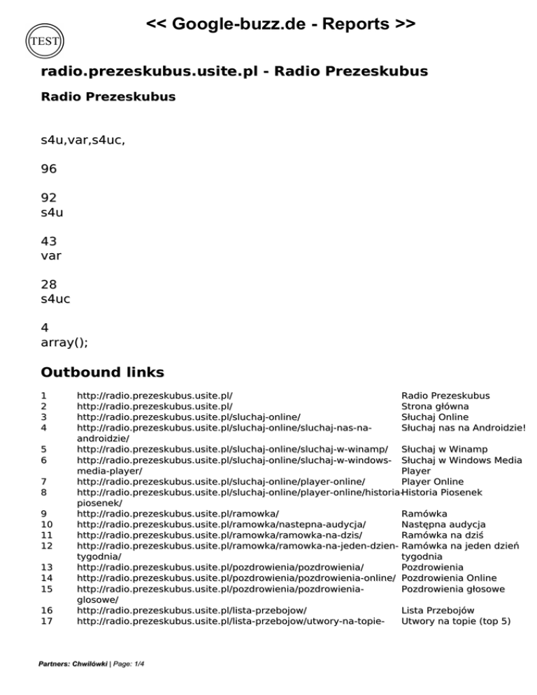 << Google-buzz.de - Reports >> radio.prezeskubus.usite.pl - Radio Prezeskubus Radio Prezeskubus s4u,var,s4uc, 96 92 s4u 43 var 28 s4uc 4 array(); Outbound links 1 2 3 4 5 6 7 8 9 10 11 12 13 14 15 16 17 http://radio.prezeskubus.usite.pl/ Radio Prezeskubus http://radio.prezeskubus.usite.pl/ Strona główna http://radio.prezeskubus.usite.pl/sluchaj-online/ Słuchaj Online http://radio.prezeskubus.usite.pl/sluchaj-online/sluchaj-nas-naSłuchaj nas na Androidzie! androidzie/ http://radio.prezeskubus.usite.pl/sluchaj-online/sluchaj-w-winamp/ Słuchaj w Winamp http://radio.prezeskubus.usite.pl/sluchaj-online/sluchaj-w-windows- Słuchaj w Windows Media media-player/ Player http://radio.prezeskubus.usite.pl/sluchaj-online/player-online/ Player Online http://radio.prezeskubus.usite.pl/sluchaj-online/player-online/historia-Historia Piosenek piosenek/ http://radio.prezeskubus.usite.pl/ramowka/ Ramówka http://radio.prezeskubus.usite.pl/ramowka/nastepna-audycja/ Następna audycja http://radio.prezeskubus.usite.pl/ramowka/ramowka-na-dzis/ Ramówka na dziś http://radio.prezeskubus.usite.pl/ramowka/ramowka-na-jeden-dzien- Ramówka na jeden dzień tygodnia/ tygodnia http://radio.prezeskubus.usite.pl/pozdrowienia/pozdrowienia/ Pozdrowienia http://radio.prezeskubus.usite.pl/pozdrowienia/pozdrowienia-online/ Pozdrowienia Online http://radio.prezeskubus.usite.pl/pozdrowienia/pozdrowieniaPozdrowienia głosowe glosowe/ http://radio.prezeskubus.usite.pl/lista-przebojow/ Lista Przebojów http://radio.prezeskubus.usite.pl/lista-przebojow/utwory-na-topieUtwory na topie (top 5) Partners: Chwilówki | Page: 1/4 << Google-buzz.de - Reports >> 18 19 20 21 22 23 24 25 26 27 28 29 30 31 32 33 34 35 36 37 38 39 40 41 42 43 44 45 46 47 48 49 50 51 55 56 top-5/ http://radio.prezeskubus.usite.pl/lista-przebojow/lista-przebojow/ http://radio.prezeskubus.usite.pl/lista-przebojow/utwory/ http://radio.prezeskubus.usite.pl/forum/ http://radio.prezeskubus.usite.pl/forum/czat/ http://radio.prezeskubus.usite.pl/wspolpraca/ http://radio.prezeskubus.usite.pl/poczta-webmail/ http://radio.prezeskubus.usite.pl/roundcube/ http://radio.prezeskubus.usite.pl/squirrelmail http://radio.prezeskubus.usite.pl:2222 http://radio.prezeskubus.usite.pl/phpmyadmin/ http://radioprezeskubus.blogspot.com/ http://radio.prezeskubus.usite.pl/wpis/2016/02/14/nowosc-gg-gadugadu-i-gg-gadu-gadu-widget/ http://radio.prezeskubus.usite.pl/wpis/2016/02/14/nowosc-gg-gadugadu-i-gg-gadu-gadu-widget/#respond http://radio.prezeskubus.usite.pl/kategoria/bez-kategorii/ http://radio.prezeskubus.usite.pl/wpis/2016/02/14/nowosc-gg-gadugadu-i-gg-gadu-gadu-widget/ http://radio.prezeskubus.usite.pl/wpis/2015/04/29/nowoscpozdrowienia-glosowe/ http://radio.prezeskubus.usite.pl/wpis/2015/04/29/nowoscpozdrowienia-glosowe/#respond http://radio.prezeskubus.usite.pl/pozdrowienia/pozdrowienia/pozdro wienia-glosowe/ http://radio.prezeskubus.usite.pl/kategoria/bez-kategorii/ http://radio.prezeskubus.usite.pl/wpis/2015/04/29/nowoscpozdrowienia-glosowe/ http://radio.prezeskubus.usite.pl/wpis/2015/01/18/radio-juz-nadajezapraszamy-do-sluchania/ http://radio.prezeskubus.usite.pl/wpis/2015/01/18/radio-juz-nadajezapraszamy-do-sluchania/#respond http://radio.prezeskubus.usite.pl/sluchaj-online/ http://radio.prezeskubus.usite.pl/sluchaj-online/player-online/ http://radio.prezeskubus.usite.pl/kategoria/bez-kategorii/ http://radio.prezeskubus.usite.pl/wpis/2015/01/18/radio-juz-nadajezapraszamy-do-sluchania/ http://radio.prezeskubus.usite.pl/wp-login.php?action=register http://radio.prezeskubus.usite.pl/wp-login.php?action=lostpassword http://play.google.com/store/apps/details?id=com.panelradiowy http://tunein.com/radio/Radio-Prezeskubus-s247536/ http://portalradiowy.pl Lista Przebojów Utwory Forum Czat Współpraca Poczta (Webmail) Roundcube Squirrelmail Panel (WebPanel) PhpMyAdmin Stara strona www Nowość GG (Gadu Gadu) i GG (Gadu Gadu) Widget Napisz odpowiedź Bez kategorii 14 lutego 2016 Nowość Pozdrowienia głosow Napisz odpowiedź http://radio.prezeskubus.usite http://radio.prezeskubus.usit l/pozdrowienia/pozdrowieniaglosowe/ Bez kategorii 29 kwietnia 2015 Radio Już nadaje. Zapraszam Do słuchania. Napisz odpowiedź Słuchaj Online Player Online Bez kategorii 18 stycznia 2015 Register Lost Password img => Radio Prezeskubus img => PortalRadiowy.pl Portal o Radiach, Jak załozyc radio http://radio.prezeskubus.usite.pl/wpis/2016/02/14/nowosc-gg-gadu- Nowość GG (Gadu Gadu) i GG gadu-i-gg-gadu-gadu-widget/ (Gadu Gadu) Widget http://radio.prezeskubus.usite.pl/wpis/2015/04/29/nowoscNowość Pozdrowienia głosow pozdrowienia-glosowe/ http://radio.prezeskubus.usite.pl/wpis/2015/01/18/radio-juz-nadaje- Radio Już nadaje. Zapraszam zapraszamy-do-sluchania/ Do słuchania. http://radio.prezeskubus.usite.pl/kategoria/bez-kategorii/ Bez kategorii http://radio.prezeskubus.usite.pl/wp-login.php?action=register Zarejestruj się Partners: Chwilówki | Page: 2/4 << Google-buzz.de - Reports >> 57 58 59 60 61 62 63 64 http://radio.prezeskubus.usite.pl/wp-login.php http://radio.prezeskubus.usite.pl/feed/ http://radio.prezeskubus.usite.pl/comments/feed/ https://pl.wordpress.org/ http://pagerank.czin.eu/ http://www.page-rank.pl https://www.youtube.com/channel/UCXK_WbBqRaMiToe81QIb_7g http://panelradiowy.pl 65 http://portalradiowy.pl 66 http://slotex.pl 67 68 69 70 71 72 73 http://radio.prezeskubus.usite.pl/forum/ http://radio.prezeskubus.usite.pl/forum/czat/ http://radio.prezeskubus.usite.pl/kontakt/ http://radio.prezeskubus.usite.pl/lista-przebojow/ http://radio.prezeskubus.usite.pl/lista-przebojow/lista-przebojow/ http://radio.prezeskubus.usite.pl/lista-przebojow/utwory/ http://radio.prezeskubus.usite.pl/lista-przebojow/utwory-na-topietop-5/ http://radio.prezeskubus.usite.pl/poczta-webmail/ Poczta (Webmail) http://radio.prezeskubus.usite.pl/poczta-webmail/roundcubeRoundcube (Roundcube roundcube-webmail/ Webmail) http://radio.prezeskubus.usite.pl/pozdrowienia/ Pozdrowienia http://radio.prezeskubus.usite.pl/p