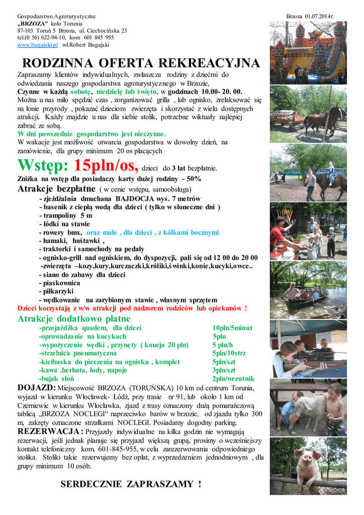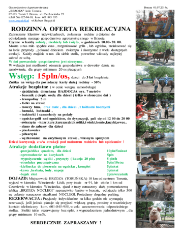 Gospodarstwo Agroturystyczne „BRZOZA” koło Torunia 87-103 Toruń 5 Brzoza, ul. Ciechocińska 23 tel.(0 56) 622-94-10, kom 601 845 955 www.bugajski.pl wł.Robert Bugajski RODZINNA OFERTA REKREACYJNA Zapraszamy klientów indywidualnych, zwłaszcza rodziny z dziećmi do odwiedzania naszego gospodarstwa agroturystycznego w Brzozie, Czynne w każdą sobotę, niedzielę lub święto, w godzinach 10.00- 20. 00. Można u nas miło spędzić czas , zorganizować grilla , lub ognisko, zrelaksować się na łonie przyrody , pokazać dzieciom zwierzęta i skorzystać z wielu dostępnych atrakcji. Każdy znajdzie u nas dla siebie stolik, potrzebne wiktuały najlepiej zabrać ze sobą. W dni powszednie gospodarstwo jest nieczynne. W wakacje jest możliwość otwarcia gospodarstwa w dowolny dzień, na zamówienie, dla grupy minimum 20 os płacących Wstęp: 15pln/os, dzieci do 3 lat bezpłatnie. Zniżka na wstęp dla posiadaczy karty dużej rodziny - 50% Atrakcje bezpłatne ( w cenie wstępu, samoobsługa) - zjeżdżalnia dmuchana BAJDOCJA wys. 7 metrów - basenik z ciepłą wodą dla dzieci ( tylko w słoneczne dni ) - trampoliny 5 m - łódki na stawie - rowery bmx, oraz małe , dla dzieci , z kółkami bocznymi - hamaki, huśtawki , - traktorki i samochody na pedały - ognisko-grill nad ogniskiem, do dyspozycji, pali się od 12 00 do 20 00 -zwierzęta –kozy,kury,kurczaczki,króliki,ś winki,konie,kucyki,owce.. - siano do zabawy dla dzieci - piaskownica - piłkarzyki - wędkowanie na zarybionym stawie , własnym sprzętem Dzieci korzystają z w/w atrakcji pod nadzorem rodziców lub opiekunów ! Atrakcje dodatkowo płatne -przejażdżka quadem, dla dzieci 10pln/5minut -oprowadzanie na kucykach 5pln -wypożyczenie wędki , przynęty ( kaucja 20 pln) 5 pln/h -strzelnica pneumatyczna 5pln/10strz -kiełbaska do pieczenia na ognisku , komplet 5pln/szt -kawa ,herbata, lody, napoje 3pln/szt -bujak słoń 2pln/wrzutnik DOJAZD: Miejscowość BRZOZA (TORUŃSKA) 10 km od centrum Torunia, wyjazd w kierunku Włocławek- Łódź, przy trasie nr 91, lub około 1 km od Czerniewic w kierunku Włocławka, zjazd z trasy oznaczony dużą pomarańczową tablicą „BRZOZA NOCLEGI“ naprzeciwko barów w brzozie, od zjazdu tylko 300 m, zakręty oznaczone strzałkami NOCLEGI. Posiadamy dogodny parking. REZERWACJA : Przyjazdy indywidualne na kilka godzin nie wymagają rezerwacji, jeśli jednak planuje się przyjazd większą grupą, prosimy o wcześniejszy kontakt telefoniczny kom. 601-845-955, w celu zarezerwowania odpowiedniego stolika. Stoliki takie rezerwujemy bez opłat, z wyprzedzeniem jednodniowym , dla grupy minimum 10 osób. SERDECZNIE ZAPRASZAMY ! Brzoza 01.07.2014r. OFERTY DODATKOWE URODZINY Wszystko tak jak w ofercie rekreacyjnej, rezerwujemy wybrany stolik , z wyprzedzeniem jednodniowym . Jest dostęp do kuchenki z lodówka , mikrofalówką , czajnikiem itp. Nie posiadamy animatora. Jest możliwość zorganizowania urodzin w każdy inny dzień tygodnia -minimalna opłata za urodziny w dni powszednie wynosi 300 pln. Urodziny do zorganizowania we własnym zakresie . PIKNIK FIRMOWY Dla firm udostępnimy teren gospodarstwa o powierzchni 2,75 ha, wraz z wyposażeniem ( trampoliny, dmuchańce , stoły ,rowery, itp. ) na organizację pikników pracowniczych, lub imprez integracyjnych dla 50-350 os . Wszystko tak jak w ofercie rekreacyjnej, z tym, ze może być dowolny dzień tygodnia . Koszt to 15 pln/os. Organizacja pikniku we własnym zakresie , lub przez współpracująca z nami specjalistyczna firmę od eventow Kontakt p. Adam Szulc kom 519 050 826 . www.adamszulc.eu WYCIECZKI SZKOLNE Szkoły zapraszamy na jednodniowe wycieczki szkolne do naszego gospodarstwa .Najlepiej na wycieczkach czują się u nas dzieci z klas 1 - 6 szkół podstawowych . Zapewniamy liczne atrakcje , bogaty program , pełną obsługę i bezpieczeństwo. Szczegółowa oferta na www.bugajski.pl Wycieczka odbywa się w godzinach 9:00-15:00 Wszystkie atrakcje ujęte są w cenie . Koszt od 25 do 45 pln/os w zależności od terminu, oraz liczebności grupy MAPKA DOJAZDU SERDECZNIE ZAPRASZAMY !