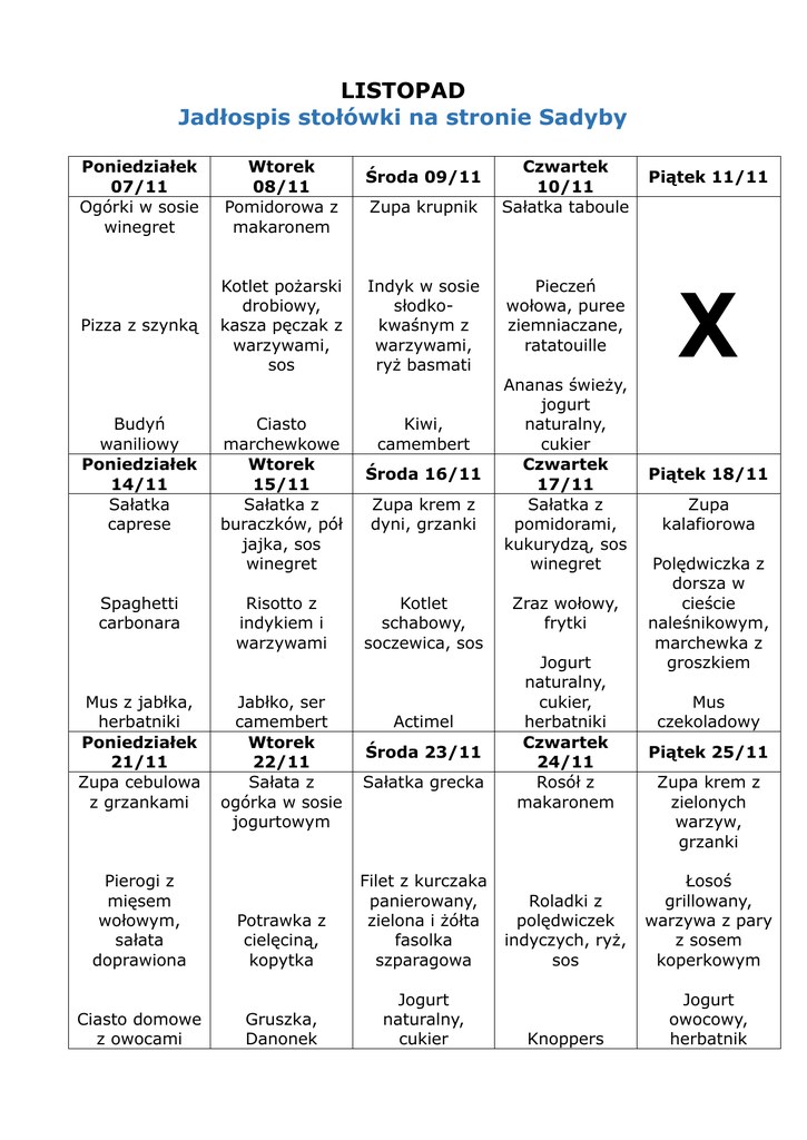 LISTOPAD Jadłospis stołówki na stronie Sadyby