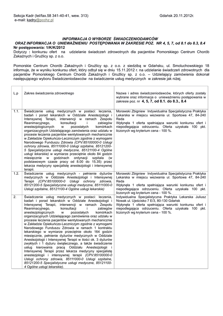 Sekcja Kadr (tel/fax.58 341-40-41, wew. 313) e-mail: [email protected] Gdańsk 20.11.2012r. INFORMACJA O WYBORZE ŚWIADCZENIODAWCÓW ORAZ INFORMACJA O UNIEWAŻNIENIU POSTĘPOWANIA W ZAKRESIE POZ. NR 4, 5, 7, od 8.1 do 8.3, 8.4 Nr postępowania: 1/K/K/2012 Dotyczy : konkursu ofert na udzielanie świadczeń zdrowotnych dla pacjentów Pomorskiego Centrum Chorób Zakaźnych i Gruźlicy sp. z o.o. Pomorskie Centrum Chorób Zakaźnych i Gruźlicy sp. z o.o. z siedzibą w Gdańsku, ul. Smoluchowskiego 18 informuje, że w wyniku konkursu ofert, który odbył się w dniu 15.11.2012 r. na udzielanie świadczeń zdrowotnych dla pacjentów Pomorskiego Centrum Chorób Zakaźnych i Gruźlicy sp. z o.o. – Udzielający zamówienia dokonał następującego wyboru Świadczeniodawców na świadczenie usług medycznych w zakresie jak niżej. L.p Zakres świadczenia zdrowotnego Nazwa i adres świadczeniodawców, których oferty zostały wybrane oraz informacja o unieważnieniu postępowania w zakresie poz. nr 4, 5, 7, od 8.1. do 8.3., 8.4 1.1. Świadczenie usług medycznych w postaci: leczenia, badań i porad lekarskich w Oddziale Anestezjologii i Intensywnej Terapii, interwencji w ramach Zespołu Reanimacyjnego, konsultacji i zabiegów anestezjologicznych w pozostałych komórkach organizacyjnych Udzielającego zamówienia oraz udziału w procesie leczenia pacjentów wentylowanych mechanicznie w Zakładzie Opiekuńczo-Leczniczym zgodnie z wymogami Narodowego Funduszu Zdrowia (CPV:85100000-0 Usługi ochrony zdrowia, 85111000-0 Usługi szpitalne, 851212005 Specjalistyczne usługi medyczne, 85121100-4 Ogólne usługi lekarskie) w wymiarze przeciętnie około 84 godzin miesięcznie w godzinach ordynacji szpitala (w podstawowym czasie pracy od 8.00 do 15.35) przez lekarza medycyny specjalistę anestezjologii i intensywnej terapii. Świadczenie usług medycznych - pełnienie dyżurów medycznych w Oddziale Anestezjologii i Intensywnej Terapii (CPV:85100000-0 Usługi ochrony zdrowia, 85121200-5 Specjalistyczne usługi medyczne, 85111000-0 Usługi szpitalne, 85121100-4 Ogólne usługi lekarskie) Morawski Zbigniew Indywidualna Specjalistyczna Praktyka Lekarska w miejscu wezwania ul. Sportowa 47, 84-240 Reda Wpłynęła 1 oferta spełniająca warunki konkursu ofert i niepodlegająca odrzuceniu. Oferta uzyskała 100 pkt. liczonych wg kryterium cena - 100 %. 1.2. 2. Świadczenie usług medycznych w postaci: leczenia, badań i porad lekarskich w Oddziale Anestezjologii i Intensywnej Terapii, interwencji w ramach Zespołu Reanimacyjnego, konsultacji i zabiegów anestezjologicznych w pozostałych komórkach organizacyjnych Udzielającego zamówienia oraz udziału w procesie leczenia pacjentów wentylowanych mechanicznie w Zakładzie Opiekuńczo-Leczniczym zgodnie z wymogami Narodowego Funduszu Zdrowia w ramach 1 kontraktu lekarskiego w wymiarze przeciętnie około 164 godzin miesięcznie, pełnienie dyżurów medycznych w Oddziale Anestezjologii i Intensywnej Terapii w ilości ok. 3 dyżurów zwykłych i 1 dyżuru świątecznego, a także świadczenie usług kierowania pracą Oddziału Anestezjologii i Intensywnej Terapii przez lekarza medycyny specjalistę anestezjologii i intensywnej terapii (CPV:85100000-0 Usługi ochrony zdrowia, 85111000-0 Usługi szpitalne, 85121200-5 Specjalistyczne usługi medyczne, 851211004 Ogólne usługi lekarskie). Morawski Zbigniew Indywidualna Specjalistyczna Praktyka Lekarska w miejscu wezwania ul. Sportowa 47, 84-240 Reda Wpłynęła 1 oferta spełniająca warunki konkursu ofert i niepodlegająca odrzuceniu. Oferta uzyskała 100 pkt. liczonych wg kryterium cena - 100 %. Indywidualna Specjalistyczna Praktyka Lekarska Juliusz Nowak ul. Ujeścisko 7 E/3, 80-130 Gdańsk Wpłynęła 1 oferta spełniająca warunki konkursu ofert i niepodlegająca odrzuceniu. Oferta uzyskała 100 pkt. liczonych wg kryterium cena - 100 %. 3. 4. 5. 6.1. Wykonywanie świadczeń zdrowotnych przez lekarza specjalistę radiologii i diagnostyki obrazowej w Pracowni Rentgenodiagnostyki ogólnej (CPV:85100000-0 Usługi ochrony zdrowia, 85121200-5 Specjalistyczne usługi medyczne, 85121100-4 Ogólne usługi lekarskie, 85111000-0 Usługi szpitalne, 85150000-5 Usługi obrazowania medycznego) w postaci:opisów zdjęć RTG – radiologia klasyczna (około 237 opisów miesięcznie), oraz koordynowanie pracą Pracowni RTG i Pracowni USG - w dni powszednie od poniedziałku do piątku – 1 godzinę dziennie, tj. przeciętnie 5 godzin tygodniowo. Wykonywanie świadczeń zdrowotnych przez lekarza w Pracowni USG (CPV:85100000-0 Usługi ochrony zdrowia, 85121200-5 Specjalistyczne usługi medyczne, 851211004 Ogólne usługi lekarskie, 85111000-0 Usługi szpitalne, 85150000-5 Usługi obrazowania medycznego) w postaci wykonywania badań USG i USG Doppler wraz z opisem tych badań. Udzielanie świadczeń zdrowotnych przez lekarza w postaci wykonywania badań endoskopowych: gastroskopii, kolonoskopii i opaskowania żylaków przełyku wraz z opisami w Pracowni Endoskopii Udzielającego zamówienia (CPV:85100000-0 Usługi ochrony zdrowia, 85121200-5 Specjalistyczne usługi medyczne, 85111000-0 Usługi szpitalne, 85121251-7, 85121100-4 Ogólne usługi lekarskie, 85121251-7 Usługi gastroenterologiczne) Specjalistyczne konsultacje medyczne: chirurgiczne dziecięce (CPV:85100000-0 Usługi ochrony zdrowia, 85121200-5 Specjalistyczne usługi medyczne 851500005, 85121100-4 Ogólne usługi lekarskie, 85111100-1 Usługi szpitalne chirurgiczne, 85121283-0 Usługi ortopedyczne). 6.2 Specjalistyczne konsultacje medyczne: ortopedii i traumatologii narządu ruchu u dzieci (CPV:85100000-0 Usługi ochrony zdrowia, 85121200-5 Specjalistyczne usługi medyczne 85150000-5, 85121100-4 Ogólne usługi lekarskie, 85111100-1 Usługi szpitalne chirurgiczne, 85121283-0 Usługi ortopedyczne). 6.3. Specjalistyczne konsultacje z ortopedii i traumatologii narządu ruchu u dorosłych (CPV:85100000-0 Usługi ochrony zdrowia, 85121200-5 Specjalistyczne usługi medyczne