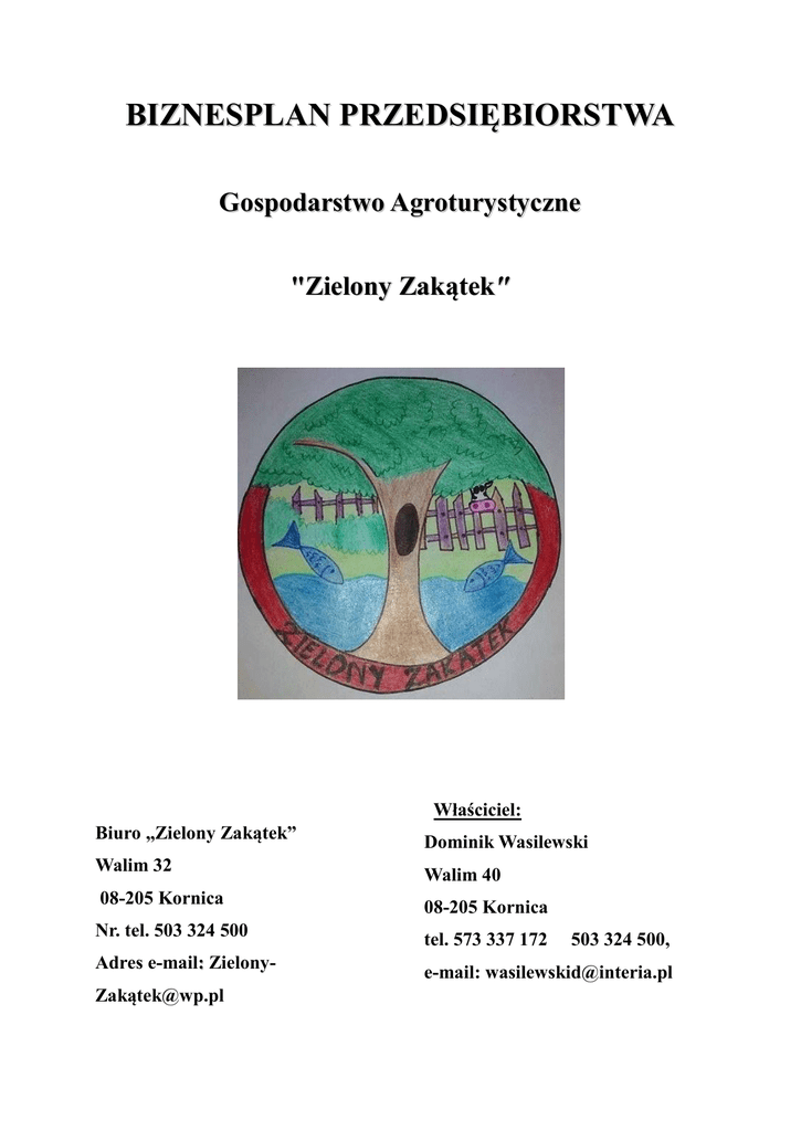 BIZNESPLAN PRZEDSIĘBIORSTWA Gospodarstwo Agroturystyczne "Zielony Zakątek" Właściciel: Biuro „Zielony Zakątek” Dominik Wasilewski Walim 32 Walim 40 08-205 Kornica 08-205 Kornica Nr. tel. 503 324 500 tel. 573 337 172 Adres e-mail: Zielony- e-mail: [email protected] Zaką[email protected] 503 324 500, I. Opis przedsięwzięcia Przedmiotem niniejszego biznesplanu jest przedsięwzięcie inwestycyjne polegające na adaptacji odziedziczonego domu mieszkalnego z zabudowaniami gospodarczymi przy działającym gospodarstwie rolnym. Wykorzystując istniejącą infrastrukturę zamierzam prowadzić gospodarstwo agroturystyczne. Goście przyjmowani będą przez cały rok. ,,Zielony Zakątek'' będzie idealnym miejscem wypoczynku na świeżym powietrzu. Położone jest w pięknej i spokojnej okolicy w Walimie. Dotychczasowe gospodarstwo rolne i zabudowania po częściowej modernizacji zostaną przekształcone w gospodarstwo agroturystyczne, oferujące swoje usługi przez cały rok. Zmodernizowany ośrodek będzie posiadał 5 pokoi gościnnych; 2, 3, 4, oraz 5 - osobowych z pełnym, wyżywieniem, łazienką i siecią Wi-Fi. Przygotowane będą boiska do gry w piłkę i wiele atrakcji dla dorosłych i dzieci. Można będzie poznać kuchnię regionalną, smaki ekologicznych warzyw i owoców oraz aktywnie wypoczywać na świeżym powietrzu zwiedzając okolice i zbierając runo leśne. Atutem firmy jest bliskość natury, czyste środowisko, domowa kuchnia regionalna, wiejska cisza i spokój oraz wiele form rozrywki znajdujących się w gospodarstwie i najbliższym otoczeniu. Oferowane ceny zapewne przyczynią się do zainteresowania klientów i korzystania z naszych usług. II. Firma Inwestorem jest osoba fizyczna - rolnik indywidualny, prowadząca jednoosobową działalność gospodarczą wpisaną w Centralną Ewidencję Działalności Gospodarczej. Siedziba firmy: Gospodarstwo "Zielony Zakątek" znajduje się w Walimie (gospodarstwo i biuro) gmina Stara Kornica, pow. Łosicki woj. mazowieckie. Firma posiada rachunek w Banku Spółdzielczym w Starej Kornicy. Wymagania formalnoprawne: Działalność będzie opodatkowana 8,5% ryczałtem od przychodów ewidencjonowanych. Właściciel: Dominik Wasilewski Walim 40 08-205 Kornica tel. 573 337 172 503 324 500, e-mail: [email protected] III. Ocena rynku Mocne strony Usługi naszego gospodarstwa są tak zróżnicowane by odpowiadały wszystkim naszym gościom, zarówno rodzinom z dziećmi, nowożeńcom, jak i osobom starszym. Budynek mieszkalny znajdujący się nieopodal lasu oraz stawu rybnego w pobliżu gospodarstwa. Nie ma bezpośredniej styczności z budynkami gospodarczymi. Można z niego obserwować oryginalne niepowtarzalne widoki przyrody wiejskiej oraz bezpośredni kontakt z naturą. Wokół sad, cisza i spokój. Poznanie kultury regionalnej, smaków kuchni i życia codziennego mieszkańców. Korzystanie z przygotowanej infrastruktury w gospodarstwie i aktywnego wypoczynku. Przygotowane są różne atrakcje dla rodzin z dziećmi. Właściciel ukończył szkolenie w zakresie agroturystyki (przepisy prawne w turystyce wiejskiej, produkt tradycyjny i ekologiczny w gospodarstwie agroturystycznym) i księgowości. W pobliżu nie ma żadnych obiektów agroturystycznych. Nie występuje konkurencja o podobnej działalności. W okolicy nie ma żadnego gospodarstwa agroturystycznego. Słabe strony Dalekie położenie wsi od dużych aglomeracji miejskich, słaba droga dojazdowa. IV. Plan finansowy gospodarstwa: 1. Koszty przekształcenia w gospodarstwo agroturystyczne: - przygotowanie pokoi gościnnych (remont, malowanie, zakup mebli i wyposażenia) – 50 tys. zł, - remont łazienek i kuchni – 30 tys. zł, - przygotowanie boiska i zakup sprzętu sportowego – 20 tys. zł. Część prac zostanie wykonana we własnym zakresie i nie przyczyni się do zwiększenia kosztów przedsięwzięcia. Łączny koszt planowanej inwestycji wyniesie ok. 100 tys. zł. 2. Pozyskanie środków finansowych na planowaną inwestycję: - zgromadzone własne środki finansowe – 40 tys. zł, - dotacja celowa z urzędu pracy na rozpoczęcie działalności gospodarczej – 25 tys. zł, - wsparcie rodziny w formie udzielonej pożyczki – 15 tys. zł, - pożyczka bankowa – 20 tys. zł. Suma pozyskanych środków wyniesie 100 tys. zł. Realizowane przedsięwzięcie zbilansuje się. V. Cennik oferowanych usług Zakwaterowania bez wyżywienia: • • dorośli – 30zł/doba dzieci od 3 lat do 10 lat - 10 zł Namiot 5 zł/ doba Wyżywienie: Wyżywienie całodzienne 40 zł za osobę, dzieci od 3 do 10 lat 20 zł. Śniadania, obiady, kolacje lub całodzienne wyżywienie, kuchnia domowa, potrawy regionalne. Istnieje możliwość - na żądanie gości - przygotowania przez gospodarzy szwedzkiego stołu (po wcześniejszym uzgodnieniu). Na miejscu w gospodarstwie można zaopatrzyć się w jajka, warzywa, owoce sezonowe, mleko, sery oraz wyroby masarskie. Upusty Oferujemy zniżki 5% przy powtórnym przyjeździe tych samych gości oraz 10% zniżki dla stałych klientów (kartę stałego klienta można uzyskać poprzez 3-krotne zakwaterowanie w ośrodku) VI. Plan zatrudnienia Zawód Kucharz Pomoc w kuchni Sprzątaczka/pokojówka Instruktor jazdy konnej Menadżer/Sekretarka Liczba i kwalifikacje pracowników Liczba Minimalne kwalifikacje pracowników 1 Technik kucharz, zawód kucharz, kurs kucharski 1 Technik kucharz, zawód kucharz 1 Brak szczególnych wymagań 1 Pełny kurs jazdy konnej 1 Wykształcenie wyższe Zarobki miesięczne 2000zł 1200 zł 1000 zł 1200 zł 3000 zł Poza swoimi obowiązkami właściciel wypełniał będzie prace konserwatora, a współwłaściciel recepcjonisty i kelnera. Informacja o kierownictwie - za organizację zakwaterowania odpowiedzialny będzie menadżer. Będzie on prowadził listę rezerwacji oraz zajmował się księgowością. VII. Planowany bilans za miesiąc sierpień 2016 r. Dochody: Zakłada się, że w miesiącach letnio-wakacyjnch będziemy mi