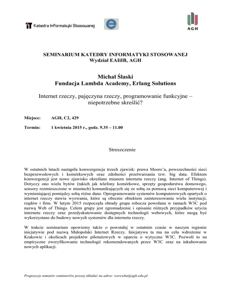 SEMINARIUM KATEDRY INFORMATYKI STOSOWANEJ Wydział EAIiIB, AGH Michał Ślaski Fundacja Lambda Academy, Erlang Solutions Internet rzeczy, pajęczyna rzeczy, programowanie funkcyjne – niepotrzebne skreślić? Miejsce: AGH, C2, 429 Termin: 1 kwietnia 2015 r., r. godz. 9.35 – 11.00 Streszczenie W ostatnich latach nastąpiła konwergencja trzech zjawisk: prawa Moore’a, powszechności sieci bezprzewodowych i komórkowych oraz zdolności przetwarzania tzw. big data. Efektem konwergencji jest nowe zjawisko określane mianem internetu rzeczy (ang. Internet of Things). Dotyczy ono wielu bytów (takich jak telefony komórkowe, sprzęty gospodarstwa domowego, sensory rozmieszczone w miastach) komunikujących się ze sobą za pomocą sieci komputerowej i wymieniającej pomiędzy sobą różne dane. Oprogramowanie systemów komputerowych komputerowych opartych o internet rzeczy stawia wyzwania, które są obecnie obiektem zainteresowania wielu instytucji, rządów i firm. W lutym 2015 rozpoczęła obrady grupa robocza powołana w ramach W3C pod nazwą Web of Things. Celem grupy jest zgromadzenie i opisanie różnych przypadków użycia internetu rzeczy oraz przedyskutowanie dostępnych technologii webowych, które mogą być wykorzystane do budowy nowych systemów dla internetu rzeczy. W trakcie seminarium opowiemy także o powstałej w ostatnim czasie w naszym regionie inicjatywie pod nazwą Małopolski Internet Rzeczy. Inicjatywa ta ma na celu wdrożenie w Krakowie i okolicach projektów pilotażowych w oparciu o wytyczne W3C. Pozwoli to na empiryczne mpiryczne zweryfikowanie technologii rekomendowanych przez W3C oraz na inkubowanie nowych aplikacji. Propozycje tematów seminariów proszę składać na adres: [email protected]. [email protected]