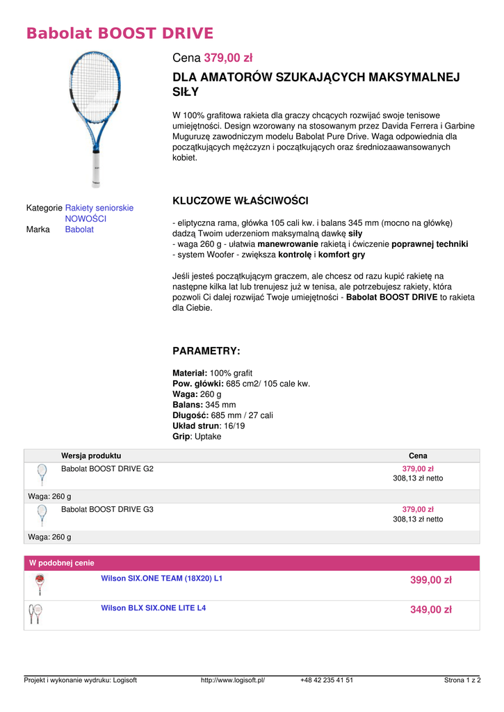 Babolat BOOST DRIVE Cena 379,00 zł DLA AMATORÓW SZUKAJĄCYCH MAKSYMALNEJ SIŁY W 100% grafitowa rakieta dla graczy chcących rozwijać swoje tenisowe umiejętności. Design wzorowany na stosowanym przez Davida Ferrera i Garbine Muguruzę zawodniczym modelu Babolat Pure Drive. Waga odpowiednia dla początkujących mężczyzn i początkujących oraz średniozaawansowanych kobiet. Kategorie Rakiety seniorskie NOWOŚCI Marka Babolat KLUCZOWE WŁAŚCIWOŚCI - eliptyczna rama, główka 105 cali kw. i balans 345 mm (mocno na główkę) dadzą Twoim uderzeniom maksymalną dawkę siły - waga 260 g - ułatwia manewrowanie rakietą i ćwiczenie poprawnej techniki - system Woofer - zwiększa kontrolę i komfort gry Jeśli jesteś początkującym graczem, ale chcesz od razu kupić rakietę na następne kilka lat lub trenujesz już w tenisa, ale potrzebujesz rakiety, która pozwoli Ci dalej rozwijać Twoje umiejętności - Babolat BOOST DRIVE to rakieta dla Ciebie. PARAMETRY: Materiał: 100% grafit Pow. główki: 685 cm2/ 105 cale kw. Waga: 260 g Balans: 345 mm Długość: 685 mm / 27 cali Układ strun: 16/19 Grip: Uptake Wersja produktu Cena Babolat BOOST DRIVE G2 379,00 zł 308,13 zł netto Waga: 260 g Babolat BOOST DRIVE G3 379,00 zł 308,13 zł netto Waga: 260 g W podobnej cenie Wilson SIX.ONE TEAM (18X20) L1 399,00 zł Wilson BLX SIX.ONE LITE L4 349,00 zł Projekt i wykonanie wydruku: Logisoft http://www.logisoft.pl/ +48 42 235 41 51 Strona 1 z 2 Wilson Steam 99LS L3 350,00 zł Yonex VCORE Si TEAM (275g) G1 345,00 zł Yonex VCORE Si TEAM (275g) G2 345,00 zł Yonex VCORE Si TEAM (275g) G3 345,00 zł Projekt i wykonanie wydruku: Logisoft Powered by TCPDF (www.tcpdf.org) http://www.logisoft.pl/ +48 42 235 41 51 Strona 2 z 2