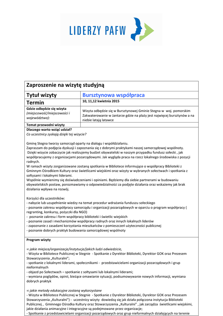 Zaproszenie na wizytę studyjną Tytuł wizyty Termin Gdzie odbędzie się wizyta (miejscowość/miejscowości i województwo): Bursztynowa współpraca 10, 11,12 kwietnia 2015 Wizyta odbędzie się w Bursztynowej Gminie Stegna w woj. pomorskim Zakwaterowanie w Jantarze gdzie na plaży jest najwięcej bursztynów a na niebie latają latawce Temat przewodni wizyty Dlaczego warto wziąć udział? Co uczestnicy zyskają dzięki tej wizycie? Gminę Stegna tworzy samorząd oparty na dialogu i współdziałaniu. Zapraszam do podjęcia dyskusji i zapoznania się z dobrymi praktykami naszej samorządowej wspólnoty. Dzięki wizycie zobaczycie jak realizujemy budżet obywatelski w naszym przypadku fundusz sołecki , jak współpracujemy z organizacjami pozarządowymi. Jak wygląda praca na rzecz lokalnego środowiska z pozycji radnych. W ramach wizyty zorganizowane zostaną spotkania w Bibliotece informujące o współpracy Biblioteki z Gminnym Ośrodkiem Kultury oraz świetlicami wiejskimi oraz wizyty w wybranych sołectwach i spotkania z sołtysami i lokalnymi liderami. Wspólnie wymienimy się doświadczeniami i opiniami. Będziemy dla siebie partnerami w budowaniu obywatelskich postaw, porozmawiamy o odpowiedzialności za podjęte działania oraz wskażemy jak brak działania wpływa na rozwój. Korzyści dla uczestników: - nabycie lub uzupełnienie wiedzy na temat procedur wdrażania funduszu sołeckiego - poznanie zakresu współpracy samorządu i organizacji pozarządowych w oparciu o program współpracy ( regranting, konkursy, pożyczki dla NGO) - poznanie zakresu i form współpracy biblioteki i świetlic wiejskich - poznanie zasad i mechanizmów współpracy radnych oraz innych lokalnych liderów - zapoznanie z zasadami korzystania mieszkańców z pomieszczeń użyteczności publicznej - poznanie dobrych praktyk budowania samorządowej wspólnoty Program wizyty • jakie miejsca/organizacje/instytucje/jakich ludzi odwiedzicie, - Wizyta w Bibliotece Publicznej w Stegnie - Spotkanie z Dyrektor Biblioteki, Dyrektor GOK oraz Prezesem Stowarzyszenia „Kulturalni”; - spotkanie z lokalnymi liderami, społecznikami - przedstawicielami organizacji pozarządowych i grup nieformalnych - objazd po Sołectwach – spotkanie z sołtysami lub lokalnymi liderami; - wymiana poglądów, opinii, bieżące omawianie sytuacji, podsumowywanie nowych informacji, wymiana dobrych praktyk • jakie metody edukacyjne zostaną wykorzystane - Wizyta w Bibliotece Publicznej w Stegnie - Spotkanie z Dyrektor Biblioteki, Dyrektor GOK oraz Prezesem Stowarzyszenia „Kulturalni”) - uczestnicy wizyty dowiedzą się jak działa połączona instytucja Biblioteki Publicznej , Gminnego Ośrodka Kultury oraz Stowarzyszenia „Kulturalni” , jak zarządza świetlicami wiejskimi, jakie działania animacyjne i integracyjne są podejmowane przez organizacje; - Spotkanie z przedstawicielami organizacji pozarządowych oraz grup nieformalnych działających na terenie gminy – wymiana doświadczeń, rozmowy o współpracy i wzajemnym dopełnianiu w tworzeniu samorządowej wspólnoty; - Objazd po wybranych sołectwach - Zapoznanie się z inwestycjami i przedsięwzięciami w poszczególnych sołectwach, rozmowy z sołtysami i lokalnymi liderami o realizacji funduszu i aktywizacji mieszkańców • jakie zagadnienia będą poruszane podczas wizyt - funkcjonowanie funduszu sołeckiego jako czynnika aktywizującego lokalną społeczność (wyodrębnianie funduszu sołeckiego, podejmowanie uchwał w sprawie przedsięwzięć do realizacji z funduszu, realizacja zadań, rozliczanie) - funkcjonowanie Gminnej Biblioteki Publicznej w ramach Gminnego Ośrodka Kultury oraz we współpracy ze Stowarzyszeniem „Kulturalni”; zarządzenie świetlicami wiejskimi; - odpowiedzialność w odniesieniu do budowania samorządowej wspólnoty - zawiązywanie koalicji, współpracy miedzy przedstawicielami grup formalnych i nieformalnych działających na terenie Gminy i nie tylko • dlaczego zostały wybrane te a nie inne miejsca do odwiedzenia Miejsca zostały wybrane dlatego że mają duży wpływ na kreowanie lokalnej rzeczywistości. Funkcjonowanie ich jest sprawdzone i może stanowić dobre praktyki dla innych osób czy instytucji. Kilka słów o organizatorze/organizatorce/organizatorach/organizatorkach Jolanta Kwiatkowska, VI edycja programu Liderzy PAFW Wójt Gminy Stegna w latach 2010- 2014 Obecnie przewodnicząca Rady Gminy Stegna , sekretarz i zastępca burmistrza miasta Krynica Morska Brygida Dragowska, IX edycja programu Liderzy PAFW Radna Gminy Stegna - Zastępczyni Przewodniczącej Rady Gminy Stegna, Zastępczyni Przewodniczącej Stowarzyszenia Wspierania Rozwoju –„Aktywni Razem” Dlaczego zdecydowałeś/zdecydowałaś się na organizację wizyty wokół tego tematu? Jaki ma on związek z Twoimi działaniami, Twoją miejscowością, regionem, dlaczego jest ważny? Funkcjonowanie samorządu i współpraca wokół samorządu to działanie które towarzyszą nam na co dzień. Jesteśmy radnymi nadmorskiej Gminy Stegna. Nasza pasja i praca to działania na rzecz naszej lokalnej wspólnoty oparte na obywatelskich postawach. Na co dzień współpracujemy z różnymi osobami i instytucjami osobami takimi jak radni gminy, rady sołeckie, organizacje pozarządowe, biblioteki, świetlice wiejskie itp. Chciałybyśmy podzielić się swoją wiedzą i doświadczeniem. Przekazać dobre praktyki współpracy i zachęcić do udziału w budowaniu szeroko rozumianych partnerstw. Oto co zobaczycie: Zapraszamy na wizytę studyjną pod hasłem „Bursztynowa współpraca ” To co zobaczycie jest specjalnie przygotowaną niespodzianką, zaklętą w bursztynie Do zobaczenia !!!!!