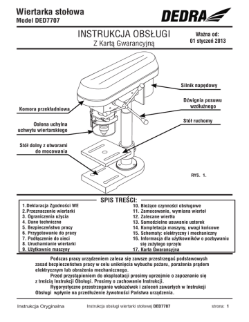 Wiertarka sto³owa Model DED7707 INSTRUKCJA OBS£UGI Z Kart¹ Gwarancyjn¹ Wa¿na od: 01 styczeñ 2013 Silnik napêdowy DŸwignia posuwu wzd³u¿nego Komora przek³adniowa Stó³ ruchomy Os³ona uchylna uchwytu wiertarskiego Stó³ dolny z otworami do mocowania RYS. 1. SPIS TREŒCI: 1.Deklaracja Zgodnoœci WE 2.Przeznaczenie wiertarki 3. Ograniczenia u¿ycia 4. Dane techniczne 5. Bezpieczeñstwo pracy 6. Przygotowanie do pracy 7. Pod³¹czenie do sieci 8. Uruchamianie wiertarki 9. U¿ytkownie maszyny 10. Bie¿¹ce czynnoœci obs³ugowe 11. Zamocowanie, wymiana wierte³ 12. Zalecane wiert³a 13. Samodzielne usuwanie usterek 14. Kompletacja maszyny, uwagi koñcowe 15. Schematy: elektryczny i mechaniczny 16. Informacja dla u¿ytkowników o pozbywaniu siê zu¿ytego sprzêtu 17. Karta Gwarancyjna Podczas pracy urz¹dzeniem zaleca siê zawsze przestrzegaæ podstawowych zasad bezpieczeñstwa pracy w celu unikniêcia wybuchu po¿aru, pora¿enia pr¹dem elektrycznym lub obra¿enia mechanicznego. Przed przyst¹pieniem do eksploatacji prosimy uprzejmie o zapoznanie siê z treœci¹ Instrukcji Obs³ugi. Prosimy o zachowanie Instrukcji. Rygorystyczne przestrzeganie wskazówek i zaleceñ zawartych w Instrukcji Obs³ugi wp³ynie na przed³u¿enie ¿ywotnoœci Pañstwa urz¹dzenia. Instrukcja Oryginalna Instrukcja obs³ugi wiertarki sto³owej DED7707 strona: 1 1. DEKLARACJA ZGODNOŒCI WE dla partii: 11300001-11300700 DEDRA EXIM Sp z o.o. 05-800 Pruszków ul. 3 Maja 8, deklaruje z pe³n¹ odpowiedzialnoœci¹, ¿e: Maszyna: Wiertarka sto³owa Nr katalogowy: DED7707 Funkcja: Patrz Instrukcja Obs³ugi Rok produkcji: 2013 do której odnosi siê niniejsza deklaracja spe³nia wymagania Dyrektyw WE (EC): 2004/108/EC w sprawie zbli¿enia przepisów pañstw cz³onkowskich dotycz¹cych kompatybilnoœci elektromagnetycznej (Electromagnetic compatibility) co potwierdzono certyfikatem nr.E8N 080941469409 wydanym przez TÜV SÜD RIDLERSTRASSE 65 80339 MUNCHEN GERMANY 2006/42/EC w sprawie zbli¿enia przepisów pañstw cz³onkowskich dotycz¹cych maszyn (Machinery safety) co potwierdzono certyfikatem nr.M8A 100141469488, wydanym przez TÜV SÜD RIDLERSTRASSE 65 80339 MUNCHEN GERMANY oraz wymagania zasadnicze w RP: Dz. U.2007 nr 82 poz. 556 Dz. U.2008 nr 199 poz. 1228 Ustawa z dnia 13.04.2007 r. o kompatybilnoœci elektromagnetycznej Rozporz¹dzenie Ministra Gospodarki z dnia 21.10.2008 r. w sprawie zasadniczych wymagañ dla maszyn Zastosowane normy zharmonizowane: EN 61029-1:2009; EN 55014-2:/A1:2001; EN 61000-3-3/A2:2005; EN 55014-1:2006; EN 61000-3-2:2006 12 Pruszków 2013-01-01 Deklaracja zgodnoœci WE traci swoj¹ wa¿noœæ, je¿eli maszyna zostanie zmieniona,przebudowana lub jest u¿ytkowana niezgodnie z Instrukcj¹ Obs³ugi. Osoba upowa¿niona do sporz¹dzania deklaracji zgodnoœci: kierownik dzia³u technicznego i serwisu: Grzegorz Ratyñski DEDRA EXIM Sp. z o.o. 05-800 Pruszków ul. 3 Maja 8 Dyrektor Techniczny mgr in¿ Waldemar £abudzki 2. Przeznaczenie wiertarki warsztatowej Wiertarka warsztatowa zasta³a zaprojektowana do prostych prac wiertarskich w ma³ych warsztatach i pracowniach typu hobby. Urz¹dzenie pozwala wykonywaæ operacje wiertarskie w materia³ach: drewno, materia³y drewnopochodne, tworzywa sztuczne, metale kolorowe, metale lekkie, stale konstrukcyjne ogólnego zastosowania, ¿eliwa. Mo¿liwe jest wykonywanie otworów w kompozytach i ceramice pod warunkiem zastosowania odpowiednich wierte³ . 3. Ograniczenia u¿ycia Wiertarka warsztatowa model DED7707 mo¿e byæ u¿ytkowana tylko zgodnie z zamieszczonymi poni¿ej “Dopuszczalnymi warunkami pracy”. Maszyna mo¿e byæ u¿ytkowana tylko i wy³¹cznie z wiert³ami z chwytem cylindrycznym np: typu NWKa. Szczegó³owe informacje zawarto w czêœci “Zalecane parametry skrawania”. Nie jest równie¿ dozwolone przy³¹czanie urz¹dzenia do systemów zasilania ch³odziw lub wody. W konstrukcji i budowie wiertarki nie przewidziano zastosowañ urz¹dzenia do celów profesjonalnych/zawodowych. Wiertarka przeznaczona jest wy³¹cznie dla majsterkowiczów i u¿ytku domowego. Samowolne zmiany w budowie mechanicznej i elektrycznej, wszelkie modyfikacje, czynnoœci obs³ugowe nie opisane w Instrukcji Obs³ugi bêd¹ traktowane za bezprawne i powoduj¹ natychmiastow¹ utratê Praw Gwarancyjnych. Niezgodne z przeznaczeniem, b¹dŸ z Instrukcj¹ Obs³ugi u¿ytkowanie spowoduje natychmiastow¹ utratê Praw Gwarancyjnych. DOPUSZCZALNE WARUNKI PRACY S2 praca dorywcza, czas pracy z obci¹¿eniem 10 min Maszyna mo¿e byæ u¿ytkowana tylko w pomieszczeniach zamkniêtych, o sprawnie dzia³aj¹cej wentylacji. Instrukcja obs³ugi wiertarki sto³owej DED7707 strona: 2 4. Dane techniczne Typ maszyny Silnik elektryczny Napiêcie pracy Moc znamionowa silnika Prêdkoœæ obrotowa Masa Uchwyt wiertarski: Zakres œrednic chwytu Liczba prêdkoœci obrotowych/ skok wrzeciona: Wymiary sto³u ruchomego Wymiary sto³u dolnego Zakres pochyleñ sto³u ruchomego Emisja ha³asu (wg ISO 7960 Aneks A 2/95) Poziom ciœnienia dŸwiêku LPA Poziom mocy dŸwiêku LWA DED7707 indukcyjny dwufazowy ( z faz¹ rozruchow¹) 230 V 50Hz 350 W 2650 obr/min 20,0 kg 3 - 13 mm, mocowanie na sto¿ku Morse’a 2 5/ 50 mm 160 mm x 160 mm 290 mm x 190 mm od 0 stopni do 45 stopni Pod obci¹¿eniem Bez obci¹¿enia 79,9,0 dB (A) 73,0 dB (A) 83,9 dB (A) 75,2 dB (A) 3-13 5 50 22 5. Bezpieczeñstwo pracy Prosimy uprzejmie o dok³adne zapoznanie siê z treœci¹ tego rozdzia³u celem maksymalnego ograniczenia mo¿liwoœci powstania urazu, b¹dŸ wypadku spowodowanego niew³aœciw¹ obs³ug¹, lub nieznajomoœci¹ Przepisów Bezpieczeñstwa Pracy. 1. Maszynê mo¿e u¿ytkowaæ osoba, która dok³adnie zapozna³a siê i zrozumia³a treœæ Instrukcji Obs³ugi. 2. W czasie pracy nale¿y stosowaæ œrodki ochrony osobistej: okulary ochronne. 3. Wszelkie regulacje, konserwacje lub czynnoœci obs³ugowe (np. zmiana prze³o¿eñ) nale¿y wykonywaæ przy wyjêtej z gniazdka wtyczce. 4. Narzêdzie, w które wyposa