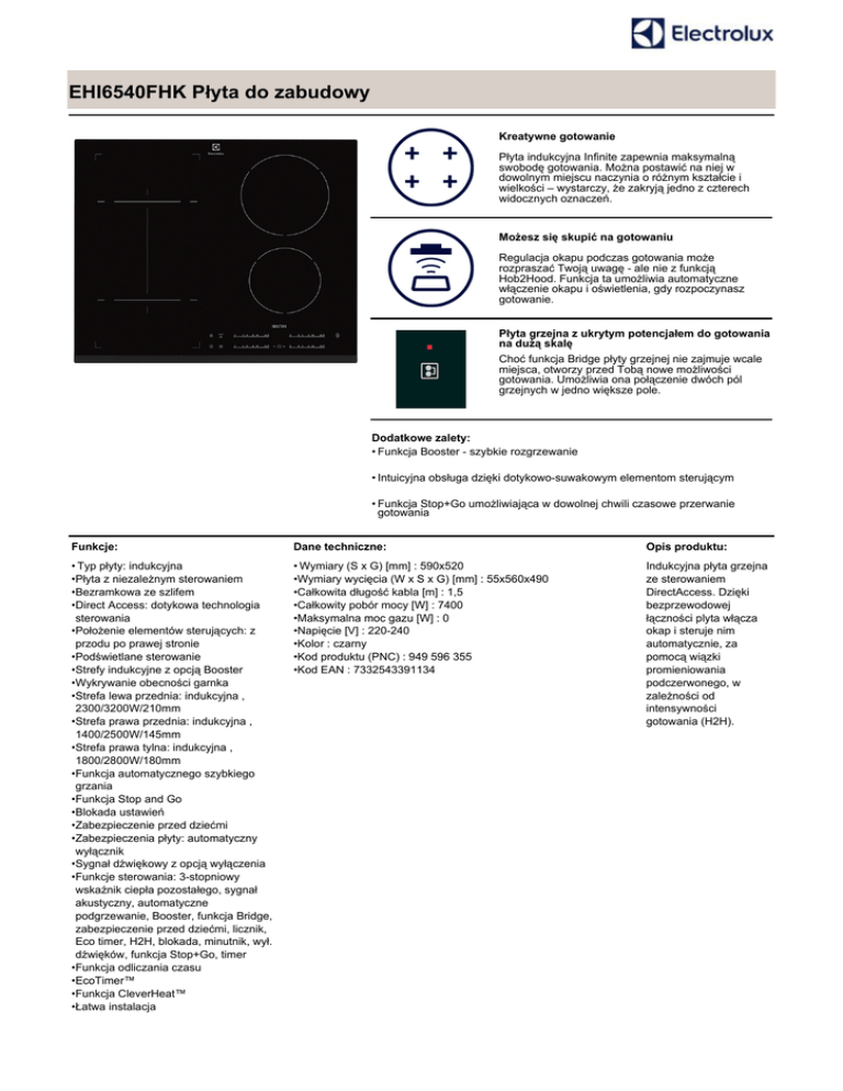 EHI6540FHK Płyta do zabudowy Kreatywne gotowanie Płyta indukcyjna Infinite zapewnia maksymalną swobodę gotowania. Można postawić na niej w dowolnym miejscu naczynia o różnym kształcie i wielkości – wystarczy, że zakryją jedno z czterech widocznych oznaczeń. Możesz się skupić na gotowaniu Regulacja okapu podczas gotowania może rozpraszać Twoją uwagę - ale nie z funkcją Hob2Hood. Funkcja ta umożliwia automatyczne włączenie okapu i oświetlenia, gdy rozpoczynasz gotowanie. Płyta grzejna z ukrytym potencjałem do gotowania na dużą skalę Choć funkcja Bridge płyty grzejnej nie zajmuje wcale miejsca, otworzy przed Tobą nowe możliwości gotowania. Umożliwia ona połączenie dwóch pól grzejnych w jedno większe pole. Dodatkowe zalety: • Funkcja Booster - szybkie rozgrzewanie • Intuicyjna obsługa dzięki dotykowo-suwakowym elementom sterującym • Funkcja Stop+Go umożliwiająca w dowolnej chwili czasowe przerwanie gotowania Funkcje: Dane techniczne: Opis produktu: • Typ płyty: indukcyjna •Płyta z niezależnym sterowaniem •Bezramkowa ze szlifem •Direct Access: dotykowa technologia sterowania •Położenie elementów sterujących: z przodu po prawej stronie •Podświetlane sterowanie •Strefy indukcyjne z opcją Booster •Wykrywanie obecności garnka •Strefa lewa przednia: indukcyjna , 2300/3200W/210mm •Strefa prawa przednia: indukcyjna , 1400/2500W/145mm •Strefa prawa tylna: indukcyjna , 1800/2800W/180mm •Funkcja automatycznego szybkiego grzania •Funkcja Stop and Go •Blokada ustawień •Zabezpieczenie przed dziećmi •Zabezpieczenia płyty: automatyczny wyłącznik •Sygnał dźwiękowy z opcją wyłączenia •Funkcje sterowania: 3-stopniowy wskaźnik ciepła pozostałego, sygnał akustyczny, automatyczne podgrzewanie, Booster, funkcja Bridge, zabezpieczenie przed dziećmi, licznik, Eco timer, H2H, blokada, minutnik, wył. dźwięków, funkcja Stop+Go, timer •Funkcja odliczania czasu •EcoTimer™ •Funkcja CleverHeat™ •Łatwa instalacja • Wymiary (S x G) [mm] : 590x520 •Wymiary wycięcia (W x S x G) [mm] : 55x560x490 •Całkowita długość kabla [m] : 1,5 •Całkowity pobór mocy [W] : 7400 •Maksymalna moc gazu [W] : 0 •Napięcie [V] : 220-240 •Kolor : czarny •Kod produktu (PNC) : 949 596 355 •Kod EAN : 7332543391134 Indukcyjna płyta grzejna ze sterowaniem DirectAccess. Dzięki bezprzewodowej łączności plyta włącza okap i steruje nim automatycznie, za pomocą wiązki promieniowania podczerwonego, w zależności od intensywności gotowania (H2H). EHI6540FHK Płyta do zabudowy