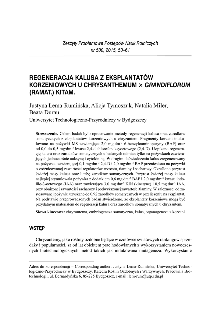 Zeszyty Problemowe Postępów Nauk Rolniczych nr 580, 2015, 53–61 REGENERACJA KALUSA Z EKSPLANTATÓW KORZENIOWYCH U CHRYSANTHEMUM × GRANDIFLORUM (RAMAT.) KITAM. Justyna Lema-Rumińska, Alicja Tymoszuk, Natalia Miler, Beata Durau Uniwersytet Technologiczno-Przyrodniczy w Bydgoszczy Streszczenie. Celem badań było opracowanie metody regeneracji kalusa oraz zarodków somatycznych z eksplantatów korzeniowych u chryzantem. Fragmenty korzeni inokulowano na pożywki MS zawierające 2,0 mg·dm–3 6-benzyloaminopuryny (BAP) oraz od 0,0 do 0,5 mg·dm–3 kwasu 2,4-dichlorofenoksyoctowego (2,4-D). Uzyskano regenerację kalusa oraz zarodków somatycznych u badanych odmian tylko na pożywkach zawierających jednocześnie auksynę i cytokininę. W drugim doświadczeniu kalus zregenerowany na pożywce zawierającej 0,1 mg·dm–3 2,4-D i 2,0 mg·dm–3 BAP przeniesiono na pożywki o zróżnicowanej zawartości regulatorów wzrostu, tiaminy i sacharozy. Określono przyrost świeżej masy kalusa oraz liczbę zarodków somatycznych. Przyrost świeżej masy kalusa najlepiej stymulowała pożywka z dodatkiem 0,6 mg·dm–3 BAP i 2,0 mg·dm–3 kwasu indolilo-3-octowego (IAA) oraz zawierająca 3,0 mg·dm-3 KIN (kinetynę) i 0,5 mg·dm–3 IAA, przy obniżonej zawartości sacharozy i podwyższonej zawartości tiaminy. W zależności od zastosowanej pożywki uzyskano do 0,92 zarodków somatycznych w przeliczeniu na eksplantat. Na podstawie przeprowadzonych badań stwierdzono, że eksplantaty korzeniowe mogą być przydatnym materiałem do regeneracji kalusa oraz zarodków somatycznych u chryzantem. Słowa kluczowe: chryzantema, embriogeneza somatyczna, kalus, organogeneza z korzeni WSTĘP Chryzantemy, jako rośliny ozdobne będące w czołówce światowych rankingów sprzedaży i popularności, są od lat obiektem prac hodowlanych z wykorzystaniem nowoczesnych biotechnologicznych metod takich jak indukowana mutageneza. Wykorzystanie Adres do korespondencji – Corresponding author: Justyna Lema-Rumińska, Uniwersytet Technologiczno-Przyrodniczy w Bydgoszczy, Katedra Roślin Ozdobnych i Warzywnych, Pracownia Biotechnologii, ul. Bernardyńska 6, 85-225 Bydgoszcz, e-mail: [email protected] 54 J. Lema-Rumińska, A. Tymoszuk, N. Miler, B. Durau mutacji jako źródła zmienności w procesie hodowlanym u chryzantem często prowadzi u tego gatunku do powstawania chimer peryklinalnych, czyli roślin o przynajmniej jednej warstwie histogenowej o genotypie odmiennym niż u pozostałych warstw [Tilney-Basset 1986, van Harten 1998]. Rozmnażanie wegetatywne in vitro odmian chryzantem będących chimerami peryklinalnymi może prowadzić do niepożądanego zjawiska separacji ich komponentów, co przejawia się w uzyskaniu roślin o innym od zamierzonego wyglądzie. Celowe jest zatem opracowanie metody pozwalającej na sprawdzenie, czy dana odmiana jest chimerą. W doświadczeniu Zalewskiej i innych [2007] wykorzystywano regenerację in vitro pędów przybyszowych z eksplantatów liściowych u 11 odmian chryzantem należących do jednej grupy. U pięciu z nich stwierdzono zmienność fenotypów u regenerantów w stosunku do roślin kontrolnych rozmnażanych in vitro z eksplantatów jednowęzłowych na pożywce bez regulatorów wzrostu. Stwierdzono, że uzyskana zmienność jest wynikiem separacji komponentów chimer peryklinalnych. Jednakże regeneracja z eksplantatów liściowych nie daje pewnej odpowiedzi, czy dana odmiana jest chimerą, ponieważ liść zbudowany jest z tkanek wywodzących się z wszystkich trzech warstw histogenowych [van Harten 1998]. Korzenie przybyszowe u chryzantem wywodzą się z histogenowej warstwy L3, zatem wykorzystanie ich jako eksplantatów, z których zregenerują rośliny, pozwoliłoby na uzyskanie wiarygodnej odpowiedzi na pytanie czy dana odmiana jest chimerą. Badania nad organogenezą przybyszową u chryzantem prowadzono z użyciem wielu różnych eksplantatów, jednak nie opracowano protokołu wydajnej regeneracji z eksplantatów korzeniowych [Taixeira da Silva 2004]. Yamaguchi i inni [2009] wykorzystali regenerację z korzeni do zbadania pod kątem chimeryzmu mutantów uzyskanych w wyniku napromieniania promieniowaniem jonizującym gamma oraz ciężkimi jonami helu i węgla. Badacze nie podają jednak wyników efektywności regeneracji z eksplantatów korzeniowych. Celem badań było opracowanie metody regeneracji kalusa oraz zarodków somatycznych z wykorzystaniem eksplantatów korzeniowych pochodzących z kultur in vitro u trzech odmian chryzantemy wielkokwiatowej. MATERIAŁ I METODY Do badań wybrano trzy polskie odmiany chryzantemy wielkokwiatowej (Chrysanthemum × grandiflorum (Ramat.) Kitam. należące do grupy ‘Lady’ (‘Lady Apricot’, ‘Lady Orange’ i ‘Lady Salmon’). Odmiany te zostały uzyskane w wyniku hodowli mutacyjnej z zastosowaniem promieniowania X i gamma [Jerzy i in. 1991, Zalewska i in. 2010]. Uzyskanie eksplantatów korzeniowych Mikrosadzonki badanych odmian namnożono metodą jednowęzłowych fragmentów pędów na zmodyfikowanej pożywce MS [Murashige i Skoog 1962], bez dodatku regulatorów wzrostu. Zastosowano standardową zawartość sacharozy (30 g·dm–3), glicyny Zeszyty Problemowe Postępów Nauk Rolniczych Regeneracja kalusa z eksplantatów korzeniowych... 55 (2 mg·dm–3), D-mioinozytolu (100 mg·dm-3) oraz pozostałych witamin (tiaminy, pirydoksyny oraz kwasu niktotynowego, odpowiednio 0,1, 0,5, 0,5 mg·dm–3). Modyfikacja pożywki polegała na zwiększeniu o połowę zawartość żelaza i wapnia. Do jej zestalenia użyto agaru Plant Propagation (firmy Biocorp, Polska) w ilości 8,0 g·dm–3. Dla każdej odmiany pobrano po 18 jednowęzłowych fragmentów pędów i inokulowano je polarnie, po 6 w jednym naczyniu szklanym o pojemności 350 ml zawierającym 40 ml pożywki. Po trzech tygodniach wyrastające pędy boczne przeniesiono na zmodyfikowaną pożywkę MS (1962) z dodatkiem 2,0 mg·dm–3 kwasu indolilo-3-octowego (IAA) w celu uzy