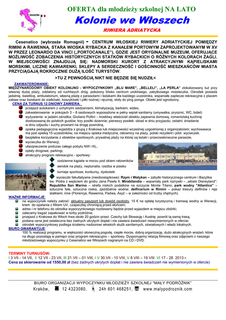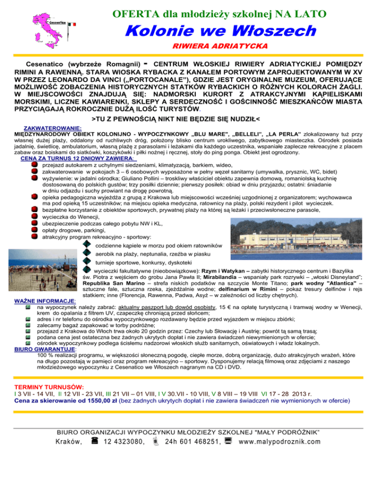 OFERTA dla młodzieży szkolnej NA LATO Kolonie we Włoszech RIWIERA ADRIATYCKA - Cesenatico (wybrzeże Romagnii) CENTRUM WŁOSKIEJ RIWIERY ADRIATYCKIEJ POMIĘDZY RIMINI A RAWENNĄ. STARA WIOSKA RYBACKA Z KANAŁEM PORTOWYM ZAPROJEKTOWANYM W XV W PRZEZ LEONARDO DA VINCI („PORTOCANALE”), GDZIE JEST ORYGINALNE MUZEUM, OFERUJĄCE MOŻLIWOŚĆ ZOBACZENIA HISTORYCZNYCH STATKÓW RYBACKICH O RÓŻNYCH KOLORACH ŻAGLI. W MIEJSCOWOŚCI ZNAJDUJĄ SIĘ: NADMORSKI KURORT Z ATRAKCYJNYMI KĄPIELISKAMI MORSKIMI, LICZNE KAWIARENKI, SKLEPY A SERDECZNOŚĆ I GOŚCINNOŚĆ MIESZKAŃCÓW MIASTA PRZYCIĄGAJĄ ROKROCZNIE DUŻĄ ILOŚĆ TURYSTÓW. >TU Z PEWNOŚCIĄ NIKT NIE BĘDZIE SIĘ NUDZIŁ< ZAKWATEROWANIE: MIĘDZYNARODOWY OBIEKT KOLONIJNO - WYPOCZYNKOWY „BLU MARE", „BELLELI”, „LA PERLA” zlokalizowany tuż przy własnej dużej plaży, oddalony od ruchliwych dróg, położony blisko centrum urokliwego, zabytkowego miasteczka. Ośrodek posiada jadalnię, świetlicę, ambulatorium, własną plażę z parasolami i leżakami dla każdego uczestnika, wspaniałe zaplecze rekreacyjne z placem zabaw oraz boiskami do siatkówki, koszykówki i piłki nożnej i ręcznej, stoły do ping ponga. Obiekt jest ogrodzony. CENA ZA TURNUS 12 DNIOWY ZAWIERA: przejazd autokarem z uchylnymi siedzeniami, klimatyzacją, barkiem, wideo, zakwaterowanie w pokojach 3 – 6 osobowych wyposażone w pełny węzeł sanitarny (umywalka, prysznic, WC, bidet) wyżywienie: w jadalni ośrodka; Giuliano Pollini – troskliwy właściciel obiektu zapewnia domową, romaniolską kuchnię dostosowaną do polskich gustów; trzy posiłki dziennie; pierwszy posiłek: obiad w dniu przyjazdu; ostatni: śniadanie w dniu odjazdu i suchy prowiant na drogę powrotną. opieka pedagogiczna wyjeżdża z grupą z Krakowa lub miejscowości wcześniej uzgodnionej z organizatorem; wychowawca ma pod opieką 15 uczestników; na miejscu opieka medyczna, ratownicy na plaży, polski rezydent i pilot wycieczek. bezpłatne korzystanie z obiektów sportowych, prywatnej plaży na której są leżaki i przeciwsłoneczne parasole, wycieczka do Wenecji, ubezpieczenie podczas całego pobytu NW i KL, opłaty drogowe, parkingi, atrakcyjny program rekreacyjno - sportowy: codzienne kąpiele w morzu pod okiem ratowników aerobik na plaży, neptunalia, rzeźba w piasku turnieje sportowe, konkursy, dyskoteki wycieczki fakultatywne (nieobowiązkowe): Rzym i Watykan – zabytki historycznego centrum i Bazylika św. Piotra z wejściem do grobu Jana Pawła II; Mirabilandia – wspaniały park rozrywki – „włoski Disneyland”; Republika San Marino – strefa niskich podatków na szczycie Monte Titano; park wodny "Atlantica" – sztuczne fale, sztuczna rzeka, zjeżdżalnie wodne; delfinarium w Rimini – pokaz tresury delfinów i rejs statkiem; inne (Florencja, Rawenna, Padwa, Asyż – w zależności od liczby chętnych). WAŻNE INFORMACJE: na wypoczynek należy zabrać: aktualny paszport lub dowód osobisty, 15 € na opłatę turystyczną i tramwaj wodny w Wenecji, krem do opalania z filtrem UV, czapeczkę chroniącą przed słońcem; adres i nr telefonu do ośrodka wypoczynkowego rozdawany będzie przed wyjazdem w miejscu zbiórki; zalecamy bagaż zapakować w torby podróżne; przejazd z Krakowa do Włoch trwa około 20 godzin przez: Czechy lub Słowację i Austrię; powrót tą samą trasą; podana cena jest ostateczna bez żadnych ukrytych dopłat i nie zawiera świadczeń niewymienionych w ofercie; ośrodek wypoczynkowy podlega ścisłemu nadzorowi włoskich służb sanitarnych, oświatowych i władz lokalnych. BIURO GWARANTUJE: 100 % realizacji programu, w większości słoneczną pogodę, ciepłe morze, dobrą organizację, dużo atrakcyjnych wrażeń, które na długo pozostają w pamięci oraz program rekreacyjno – sportowy. Dysponujemy relacją filmową oraz zdjęciami z naszego młodzieżowego wypoczynku z Cesenatico we Włoszech nagranym na CD i DVD. TERMINY TURNUSÓW: I 3 VII - 14 VII, II 12 VII - 23 VII, III 21 VII – 01 VIII, IIV 30.VII - 10 VIII, V 8 VIII – 19 VIII, VI 17 - 28 2013 r. Cena za skierowanie od 1550,00 zł (bez żadnych ukrytych dopłat i nie zawiera świadczeń nie wymienionych w ofercie) BIURO ORGANIZACJI WYPOCZYNKU MŁODZIEŻY SZKOLNEJ "MAŁY PODRÓŻNIK” Kraków, « 12 4323080, ª 24h 601 468251, ¡ www.malypodroznik.com