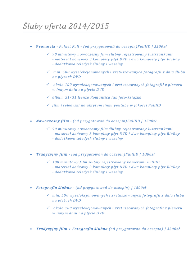 Śluby oferta 2014/2015 Promocja - Pakiet Full - (od przygotowań do oczepin)FullHD | 5200zł 90 minutowy nowoczesny film ślubny rejestrowany lustrzankami - materiał końcowy 3 komplety płyt DVD i dwa komplety płyt BluRay - dodatkowo teledysk ślubny i weselny min. 500 wyselekcjonowanych i zretuszowanych fotografii z dnia ślubu na płytach DVD około 100 wyselekcjonowanych i zretuszowanych fotografii z pleneru w innym dniu na płycie DVD album 31×31 Henzo Romantica lub foto-książka film i teledyski na ukrytym linku youtube w jakości FullHD Nowoczesny film - (od przygotowań do oczepin)FullHD | 3500zł 90 minutowy nowoczesny film ślubny rejestrowany lustrzankami - materiał końcowy 3 komplety płyt DVD i dwa komplety płyt BluRay - dodatkowo teledysk ślubny i weselny Tradycyjny film - (od przygotowań do oczepin)FullHD | 1800zł 180 minutowy film ślubny rejestrowany kamerami FullHD - materiał końcowy 3 komplety płyt DVD i dwa komplety płyt BluRay - dodatkowo teledysk ślubny i weselny Fotografia ślubna - (od przygotowań do oczepin) | 1800zł min. 500 wyselekcjonowanych i zretuszowanych fotografii z dnia ślubu na płytach DVD około 100 wyselekcjonowanych i zretuszowanych fotografii z pleneru w innym dniu na płycie DVD Tradycyjny film + Fotografia ślubna (od przygotowań do oczepin) | 3200zł