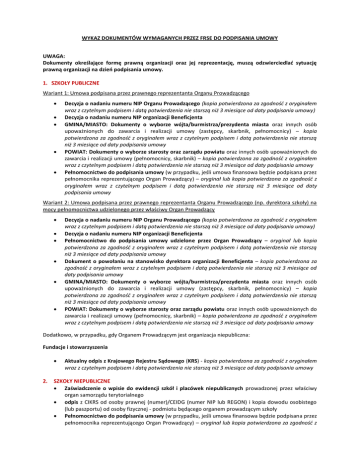 WYKAZ DOKUMENTÓW WYMAGANYCH PRZEZ FRSE DO PODPISANIA UMOWY UWAGA: Dokumenty określające formę prawną organizacji oraz jej reprezentację, muszą odzwierciedlać sytuację prawną organizacji na dzień podpisania umowy. 1. SZKOŁY PUBLICZNE Wariant 1: Umowa podpisana przez prawnego reprezentanta Organu Prowadzącego Decyzja o nadaniu numeru NIP Organu Prowadzącego (kopia potwierdzona za zgodność z oryginałem wraz z czytelnym podpisem i datą potwierdzenia nie starszą niż 3 miesiące od daty podpisania umowy) Decyzja o nadaniu numeru NIP organizacji Beneficjenta GMINA/MIASTO: Dokumenty o wyborze wójta/burmistrza/prezydenta miasta oraz innych osób upoważnionych do zawarcia i realizacji umowy (zastępcy, skarbnik, pełnomocnicy) – kopia potwierdzona za zgodność z oryginałem wraz z czytelnym podpisem i datą potwierdzenia nie starszą niż 3 miesiące od daty podpisania umowy POWIAT: Dokumenty o wyborze starosty oraz zarządu powiatu oraz innych osób upoważnionych do zawarcia i realizacji umowy (pełnomocnicy, skarbnik) – kopia potwierdzona za zgodność z oryginałem wraz z czytelnym podpisem i datą potwierdzenia nie starszą niż 3 miesiące od daty podpisania umowy Pełnomocnictwo do podpisania umowy (w przypadku, jeśli umowa finansowa będzie podpisana przez pełnomocnika reprezentującego Organ Prowadzący) – oryginał lub kopia potwierdzona za zgodność z oryginałem wraz z czytelnym podpisem i datą potwierdzenia nie starszą niż 3 miesiące od daty podpisania umowy Wariant 2: Umowa podpisana przez prawnego reprezentanta Organu Prowadzącego (np. dyrektora szkoły) na mocy pełnomocnictwa udzielonego przez właściwy Organ Prowadzący Decyzja o nadaniu numeru NIP Organu Prowadzącego (kopia potwierdzona za zgodność z oryginałem wraz z czytelnym podpisem i datą potwierdzenia nie starszą niż 3 miesiące od daty podpisania umowy) Decyzja o nadaniu numeru NIP organizacji Beneficjenta Pełnomocnictwo do podpisania umowy udzielone przez Organ Prowadzący – oryginał lub kopia potwierdzona za zgodność z oryginałem wraz z czytelnym podpisem i datą potwierdzenia nie starszą niż 3 miesiące od daty podpisania umowy Dokument o powołaniu na stanowisko dyrektora organizacji Beneficjenta – kopia potwierdzona za zgodność z oryginałem wraz z czytelnym podpisem i datą potwierdzenia nie starszą niż 3 miesiące od daty podpisania umowy GMINA/MIASTO: Dokumenty o wyborze wójta/burmistrza/prezydenta miasta oraz innych osób upoważnionych do zawarcia i realizacji umowy (zastępcy, skarbnik, pełnomocnicy) – kopia potwierdzona za zgodność z oryginałem wraz z czytelnym podpisem i datą potwierdzenia nie starszą niż 3 miesiące od daty podpisania umowy POWIAT: Dokumenty o wyborze starosty oraz zarządu powiatu oraz innych osób upoważnionych do zawarcia i realizacji umowy (pełnomocnicy, skarbnik) – kopia potwierdzona za zgodność z oryginałem wraz z czytelnym podpisem i datą potwierdzenia nie starszą niż 3 miesiące od daty podpisania umowy Dodatkowo, w przypadku, gdy Organem Prowadzącym jest organizacja niepubliczna: Fundacje i stowarzyszenia 2. Aktualny odpis z Krajowego Rejestru Sądowego (KRS) - kopia potwierdzona za zgodność z oryginałem wraz z czytelnym podpisem i datą potwierdzenia nie starszą niż 3 miesiące od daty podpisania umowy SZKOŁY NIEPUBLICZNE Zaświadczenie o wpisie do ewidencji szkół i placówek niepublicznych prowadzonej przez właściwy organ samorządu terytorialnego odpis z CIKRS od osoby prawnej (numer)/CEIDG (numer NIP lub REGON) i kopia dowodu osobistego (lub paszportu) od osoby fizycznej - podmiotu będącego organem prowadzącym szkoły Pełnomocnictwo do podpisania umowy (w przypadku, jeśli umowa finansowa będzie podpisana przez pełnomocnika reprezentującego Organ Prowadzący) – oryginał lub kopia potwierdzona za zgodność z oryginałem wraz z czytelnym podpisem i datą potwierdzenia nie starszą niż 3 miesiące od daty podpisania umowy 3. INNE KATEGORIE BENEFICJENTÓW Fundacje i stowarzyszenia Aktualny odpis z KRS Statut fundacji lub stowarzyszenia Uchwały lub inne akty wewnętrzne, jeżeli zgodnie ze statutem organizacji są wymagane do zawarcia Umowy Publiczne ośrodki kultury (lub inne ośrodki kultury, np. biblioteki) Dokument informujący o powołaniu dyrektora, Wyciąg ze statutu, Odpis z Wykazu Instytucji Kultury Ośrodki pomocy społecznej Kopia statutu (lub wyciąg) Kopia dokumentu informującego o powołaniu dyrektora placówki Kopia dokumentu informującego o wybraniu wójta/burmistrza/prezydenta miasta wydanego przez właściwą terenowo komisję wyborczą W przypadku powołania na dyrektora placówki przez przedstawicieli OP z poprzednich kadencji – potwierdzenie za zgodność z oryginałem przez obecnego przedstawiciela OP wraz z dokumentem j.w. Ochotnicze Hufce Pracy Dokument informujący o powołaniu Komendanta Głównego/Wojewódzkiego, Pełnomocnictwo dla Komendanta Wojewódzkiego wystawione przez Komendanta Głównego OHP Osoby fizyczne prowadzące działalność gospodarczą Odpis z CEIDG (numer NIP lub REGON) Kopia dowodu osobistego (lub paszportu) właściciela Spółki cywilne Odpis z CEIDG każdego ze wspólników (numer NIP lub REGON) Kopie dowodów osobistych wspólników (lub paszportów) Kopia aktualnej umowy spółki Pozostałe kategorie Beneficjentów Dokument urzędowy potwierdzający utworzenie instytucji, zawierający nazwę i adres siedziby instytucji Dokumenty potwierdzające reprezentację prawną, Wypis z właściwego rejestru