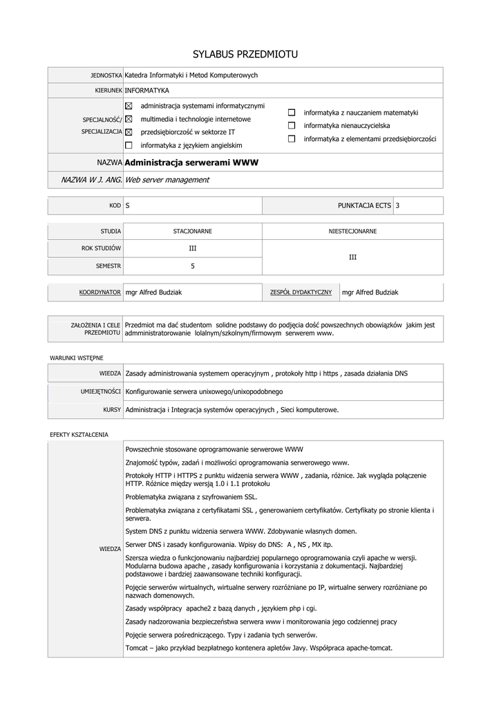 SYLABUS PRZEDMIOTU JEDNOSTKA Katedra Informatyki i Metod Komputerowych KIERUNEK INFORMATYKA administracja systemami informatycznymi SPECJALNOŚĆ/ multimedia i technologie internetowe SPECJALIZACJA przedsiębiorczość w sektorze IT informatyka z nauczaniem matematyki informatyka nienauczycielska informatyka z elementami przedsiębiorczości informatyka z językiem angielskim NAZWA Administracja serwerami WWW NAZWA W J. ANG. Web server management KOD S STUDIA PUNKTACJA ECTS 3 STACJONARNE NIESTECJONARNE III ROK STUDIÓW III 5 SEMESTR KOORDYNATOR mgr Alfred Budziak ZESPÓŁ DYDAKTYCZNY mgr Alfred Budziak ZAŁOŻENIA I CELE Przedmiot ma dać studentom solidne podstawy do podjęcia dość powszechnych obowiązków jakim jest PRZEDMIOTU admministratorowanie lolalnym/szkolnym/firmowym serwerem www. WARUNKI WSTĘPNE WIEDZA Zasady administrowania systemem operacyjnym , protokoły http i https , zasada działania DNS UMIEJĘTNOŚCI Konfigurowanie serwera unixowego/unixopodobnego KURSY Administracja i Integracja systemów operacyjnych , Sieci komputerowe. EFEKTY KSZTAŁCENIA Powszechnie stosowane oprogramowanie serwerowe WWW Znajomość typów, zadań i możliwości oprogramowania serwerowego www. Protokoły HTTP i HTTPS z punktu widzenia serwera WWW , zadania, różnice. Jak wygląda połączenie HTTP. Różnice między wersją 1.0 i 1.1 protokołu Problematyka związana z szyfrowaniem SSL. Problematyka związana z certyfikatami SSL , generowaniem certyfikatów. Certyfikaty po stronie klienta i serwera. System DNS z punktu widzenia serwera WWW. Zdobywanie własnych domen. WIEDZA Serwer DNS i zasady konfigurowania. Wpisy do DNS: A , NS , MX itp. Szersza wiedza o funkcjonowaniu najbardziej popularnego oprogramowania czyli apache w wersji. Modularna budowa apache , zasady konfigurowania i korzystania z dokumentacji. Najbardziej podstawowe i bardziej zaawansowane techniki konfiguracji. Pojęcie serwerów wirtualnych, wirtualne serwery rozróżniane po IP, wirtualne serwery rozróżniane po nazwach domenowych. Zasady współpracy apache2 z bazą danych , językiem php i cgi. Zasady nadzorowania bezpieczeństwa serwera www i monitorowania jego codziennej pracy Pojęcie serwera pośredniczącego. Typy i zadania tych serwerów. Tomcat – jako przykład bezpłatnego kontenera apletów Javy. Współpraca apache-tomcat. Połączenie się z serwerem www za pomocą dowolnego narzędzia pozwalającego na tekstową komunikację (telnet , nc itp.) następnie zaobserwowanie działania metod HTTP GET i POST przy współpracy z tym serwerem. Zaobserwowanie zachowania serwera po przesłaniu danych. Instalacja serwera WWW apache2 na własnym wirtualnym serwerze Linuxowym z pełnymi uprawnieniami administracyjnymi. Umiejętność korzystania z źródłowej dokumentacji projektu apache. Poruszanie się w strukturze plików konfiguracyjnych apache. Włączanie i wyłączanie ładowalnych modułów oraz wirtualnych serwerów. Konfiguracja serwowania własnego „miejsca sieciowego”. Umiejętność znajdowania i stosowania niezbędnych dyrektyw apache. Podstawowa wiedza o konfiguracji najbardziej popularnego serwera DNS bind (na poziomie pliku strefy). Umiejętność zdobycia aliasu , wpisu klasy A i delegacji na „własną” gałąź drzewa nazw DNS UMIEJĘTNOŚCI Przykładowe uruchomienie własnych nazw domenowych w strefie do której mamy delegacje. Zastosowanie tych domen do obsługi naszego serwera www a potem do obsługi na nim różnie skonfigurowanych serwerów wirtualnych Konfigurowanie serwerów wirtualnych rozróżnianych po nazwach i po IP. Uruchomienie wirtualnego hosta współpracującego z serwerem baz danych i językiem php. Konfiguracja php.ini Akceleracja php , instalacja wybranego akceleratora. Umiejętność sprawdzenia efektów takiej konfiguracji. Moduły mod_rewrite mod_redirect. Umiejętność zastosowania wyrażeń regularnych do konfiguracji apache. Uruchomienie transparentnego i anonimowego serwera PROXY na apache. Instalacja i używanie oprogramowania do monitorowania bieżącej pracy serwera (awstat) Testowanie wydajności serwera. Podstawowe zasady konfigurowania apache do współpracy z oprogramowaniem Tomcat. METODY NAUCZANIA WYKŁAD: ĆWICZENIA: informacyjny prelekcja dyskusja problemowy praca zespołowa – projekt instruktaż konwersatoryjny praca indywidualna – ćwiczenia praktyczne ćwiczenia produkcyjne inny (jaki) pokaz z objaśnieniem inne (jakie) Elementy kształcenia zdalnego: platforma Moodle inne (jakie) ORGANIZACJA FORMA ZAJĘĆ LICZBA GODZIN WYKŁAD (W) ĆWICZENIA W GRUPACH A K L STUDIA STACJONARNE 30 STUDIA NIESTACJONARNE 10 S P FORMY SPRAWDZANIA EFEKTÓW KSZTAŁCENIA W A K L Końcowe kolokwium polegające na zaprezentowaniu prowadzącemu, zainstalowanych i skonfigurowanych na kolejnych laboratoriach, rezydujących na wirtualnych maszynach serwerów WWW+mysql+php oraz odpowiedzi na pytania dotyczące jego konfiguracji i zasad działania. S P FORMA ZALICZENIA egzamin zaliczenie z oceną zaliczenie Ocena z kolokwium polegającego na zaprezentowaniu prowadzącemu, zainstalowanych i OCENA skonfigurowanych na kolejnych laboratoriach, rezydujących na wirtualnych maszynach serwerów WWW+mysql+php oraz odpowiedzi na pytania dotyczące jego konfiguracji i zasad działania. UWAGI PODSTAWOWA „Apache 2.0 dla zaawansowanych”, Peter Wainwright ,Helion 2003 „PHP5, Apache i MySQL Od podstaw” - Zespół autorów, O'Reilly 2005 LITERATURA ZMIANY: UZUPEŁNIAJĄCA ”Apache – administracja serwera” Mark Arnold , Clint Miller , Jeff D. Almeida , Read Me , 2002 http://httpd.apache.org – Apache Server Project „Apache 2.0 dla Windows. Ćwiczenia” Łukasz Sosna , Helion 2003 http://mediawiki.ilab.pl/index.php/SK_Modu%C5% 82_6 http://mediawiki.ilab.pl/index.php/AWWW-1st3.6w01.tresc-1.0-toc „Programowanie w shellu” L.J.Arthur ,Mikom 2003