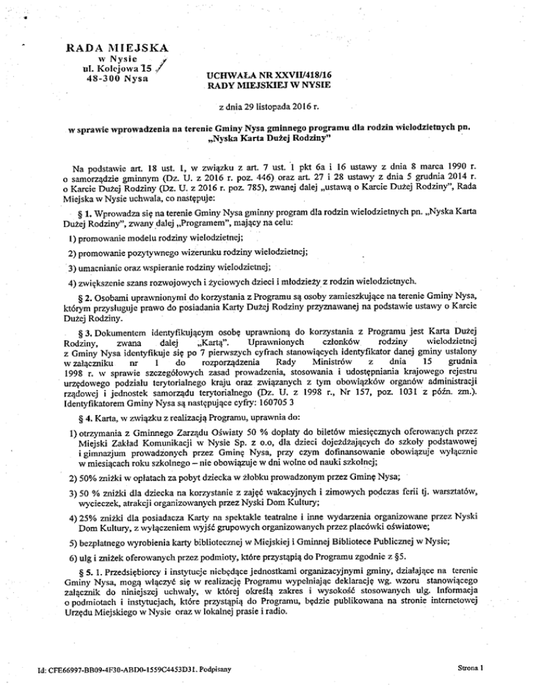 RADA MIEJSKA w Nysiej ni. Kolejowa 15 ./ 48-300 NysaUCHWAŁA NR XXVII/418/16 RADY MIEJSKIEJ W NYSIE z dnia 29 listopada 2016 r. w sprawie wprowadzenia na terenie Gminy Nysa gminnego programu dla rodzin wielodzietnych pn. „Nyska Karta Dużej Rodziny" Na podstawie art. 18 ust. 1, w związku z art. 7 ust. 1 pkt 6a i 16 ustawy z dnia 8 marca 1990 r. o samorządzie gminnym (Dz. U. z 2016 r. poz. 446) oraz art. 27 i 28 ustawy z dnia 5 grudnia 2014 r. o Karcie Dużej Rodziny (Dz. U. z 2016 r. poz. 785), zwanej dalej „ustawą o Karcie Dużej Rodziny", Rada Miejska w Nysie uchwala, co następuje: 1. Wprowadza się na terenie Gminy Nysa gminny program dla rodzin wielodzietnych pn. „Nyska Karta Dużej Rodziny", zwany dalej „Programem", mający na celu: 1)promowanie modelu rodziny wielodzietnej; 2)promowanie pozytywnego wizerunku rodziny wielodzietnej; 3)umacnianie oraz wspieranie rodziny wielodzietnej; 4)zwiększenie szans rozwojowych i życiowych dzieci i miodzieży z rodzin wielodzietnych. 2. Osobami uprawnionymi do korzystania z Programu są osoby zamieszkujące na terenie Gminy Nysa, którym przysługuje prawo do posiadania Karty Dużej Rodziny przyznawanej na podstawie ustawy o Karcie Dużej Rodziny. 3. Dokumentem identyfikującym osobę uprawnioną do korzystania z Programu jest Karta Dużej Rodziny, zwana dalej „Kartą". Uprawnionych członków rodziny wielodzietnej z Gminy Nysa identyfikuje się po 7 pierwszych cyfrach stanowiących identyfikator danej gminy ustalony w załączniku nr 1 do rozporządzenia Rady Ministrów z dnia 15 grudnia 1998 r. w sprawie szczegółowych zasad prowadzenia, stosowania i udostępniania krajowego rejestru urzędowego podziału terytorialnego kraju oraz związanych z tym obowiązków organów administracji rządowej i jednostek samorządu terytorialnego (Dz. U. z 1998 r., Nr 157, poz. 1031 z późn. zm.). Identyfikatorem Gminy Nysa są następujące cyfry: 160705 3 4. Karta, w związku z realizacją Programu, uprawnia do: 1)otrzymania z Gminnego Zarządu Oświaty 50 % dopłaty do biletów miesięcznych oferowanych przez Miejski Zakład Komunikacji w Nysie Sp. z o.o, dla dzieci dojeżdżających do szkoły podstawowej i gimnazjum prowadzonych przez Gminę Nysa, przy czym dofinansowanie obowiązuje wyłącznie w miesiącach roku szkolnego - nie obowiązuje w dni wolne od nauki szkolnej; 2)50% zniżki w opłatach za pobyt dziecka w żłobku prowadzonym przez Gminę Nysa; 3)50 % zniżki dla dziecka na korzystanie z zajęć wakacyjnych i zimowych podczas ferii tj. warsztatów, wycieczek, atrakcji organizowanych przez Nyski Dom Kultury; 4)25% zniżki dla posiadacza Karty na spektakle teatralne i inne wydarzenia organizowane przez Nyski Dom Kultury, z wyłączeniem wyjść grupowych organizowanych przez placówki oświatowe; 5)bezpłatnego wyrobienia karty bibliotecznej w Miejskiej i Gminnej Bibliotece Publicznej w Nysie; 6)ulg i zniżek oferowanych przez podmioty, które przystąpią do Programu zgodnie z 5. 5. 1. Przedsiębiorcy i instytucje niebędące jednostkami organizacyjnymi gminy, działające na terenie Gminy Nysa, mogą włączyć się w realizację Programu wypełniając deklarację wg. wzoru stanowiącego załącznik do niniejszej uchwały, w której określą zakres i wysokość stosowanych ulg. Informacja o podmiotach i instytucjach, które przystąpią do Programu, będzie publikowana na stronie internetowej Urzędu Miejskiego w Nysie oraz w lokalnej prasie i radio. Id: CFE66997-BB09-4F30-ABDO-1559C4453D31. Podpisany 2.Przedsiębiorcy i instytucje, o których mowa w ust. 1, informują o realizacji Programu w miejscu realizacji uprawnień, o których mowa w 4 pkt 6, umieszczając w widocznym miejscu znak graficzny, którego wzór określi Burmistrz Nysy. 3.Burmistrz Nysy może odmówić przedsiębiorcy lub instytucji, o których mowa w ust. 1, przystąpienia do Programu albo usunąć ten podmiot z Programu, w przypadku stwierdzenia sprzeczności oferowanych dóbr lub usług z celem Programu. 6. Koszt uprawnień przyznanych przez podmioty, o których mowa w 4 pkt 1-5, jest finansowany z budżetów tych podmiotów, zaś koszt uprawnień oferowanych przez podmioty wymienione w 5 ust. 1, finansowany jest przez te podmioty. 7. Uprawnienia wynikające z niniejszej uchwały nie naruszają prawa do ulg przyznanych na podstawie odrębnych przepisów. 8.1. Koordynatorem Programujest Burmistrz Nysy. 2.Gminne jednostki organizacyjne, w tym gminne osoby prawne, stosujące ulgi wynikające z Programu zobowiązane są do przedstawienia Burmistrzowi Nysy, jako Koordynatorowi Programu, informacji o kosztach realizacji Programu i liczbie osób korzystających z ulg, odpowiednio za okres od dnia 1 stycznia do dnia 30 czerwca - w terminie do 31 lipca danego roku oraz od dnia 1 lipca do dnia 31 grudnia danego roku - w terminie do dnia 31 stycznia roku następnego. 3.Burmistrz Nysy przedstawia Radzie Miejskiej w Nysie sprawozdanie z realizacji Programu za okres od dnia 1 stycznia do dnia 31 grudnia danego roku, w terminie do dnia 31 marca następnego roku. 9. Promocja działań podejmowanych w ramach Programu obejmować będzie w szczególności informacje oraz ogłoszenia na stronie internetowej Urzędu Miejskiego w Nysie, lokalnej prasie, radio, na tablicach ogłoszeniowych w Ośrodku Pomocy Społecznej w Nysie, a także poprzez placówki oświatowe. 10. Uprawnienia przewidziane w Programie będą obowiązywać od dnia 1 lutego 2017 roku. 11. Wykonanie uchwały powierza się Burmistrzowi Nysy. 12. Uchwała wchodzi w życie po upływie 14 dni od dnia ogłoszenia w Dzienniku Urzędowym Województwa Opolskiego. PRZEWODNICZĄCY RADY Paweł Nakonieczny Id: CFE66997-BB09-4F30-ABD0-1559C4453D31. Podpisany Załącznik do Uchwały Nr XXVII/418/16 Rady Miejskiej w Nysie z dnia 29 listopada 2016 r. Deklaracja przystąpienia do gminnego Programu dla rodzin wielodzietnych pn. „Nyska Karta Dużej Rodziny" (nazwa i adres przedsiębiorcy/instytucji) (NIP) (nr telefonu) Deklar