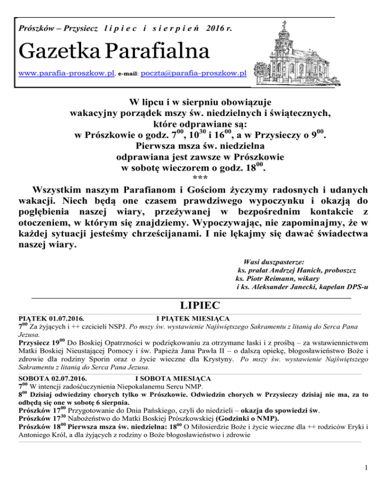 Prószków – Przysiecz l i p i e c i s i e r p i e ń 2016 r. Gazetka Parafialna www.parafia-proszkow.pl, e-mail: [email protected] W lipcu i w sierpniu obowiązuje wakacyjny porządek mszy św. niedzielnych i świątecznych, które odprawiane są: w Prószkowie o godz. 700, 1030 i 1600, a w Przysieczy o 900. Pierwsza msza św. niedzielna odprawiana jest zawsze w Prószkowie w sobotę wieczorem o godz. 1800. *** Wszystkim naszym Parafianom i Gościom życzymy radosnych i udanych wakacji. Niech będą one czasem prawdziwego wypoczynku i okazją do pogłębienia naszej wiary, przeżywanej w bezpośrednim kontakcie z otoczeniem, w którym się znajdziemy. Wypoczywając, nie zapominajmy, że w każdej sytuacji jesteśmy chrześcijanami. I nie lękajmy się dawać świadectwa naszej wiary. Wasi duszpasterze: ks. prałat Andrzej Hanich, proboszcz ks. Piotr Reimann, wikary i ks. Aleksander Janecki, kapelan DPS-u __________________________________________________________________________________ LIPIEC ___________________________________________________________________________________________________________________________________________________________________________________________________________________ PIĄTEK 01.07.2016. I PIĄTEK MIESIĄCA 00 7 Za żyjących i ++ czcicieli NSPJ. Po mszy św. wystawienie Najświętszego Sakramentu z litanią do Serca Pana Jezusa. Przysiecz 1900 Do Boskiej Opatrzności w podziękowaniu za otrzymane łaski i z prośbą – za wstawiennictwem Matki Boskiej Nieustającej Pomocy i św. Papieża Jana Pawła II – o dalszą opiekę, błogosławieństwo Boże i zdrowie dla rodziny Sporin oraz o życie wieczne dla Krystyny. Po mszy św. wystawienie Najświętszego Sakramentu z litanią do Serca Pana Jezusa. ___________________________________________________________________________________________________________________________________________________________________________________________________________________ SOBOTA 02.07.2016. I SOBOTA MIESIĄCA 700 W intencji zadośćuczynienia Niepokalanemu Sercu NMP. 800 Dzisiaj odwiedziny chorych tylko w Prószkowie. Odwiedzin chorych w Przysieczy dzisiaj nie ma, za to odbędą się one w sobotę 6 sierpnia. Prószków 1700 Przygotowanie do Dnia Pańskiego, czyli do niedzieli – okazja do spowiedzi św. Prószków 1730 Nabożeństwo do Matki Boskiej Prószkowskiej (Godzinki o NMP). Prószków 1800 Pierwsza msza św. niedzielna: 1800 O Miłosierdzie Boże i życie wieczne dla ++ rodziców Eryki i Antoniego Król, a dla żyjących z rodziny o Boże błogosławieństwo i zdrowie ___________________________________________________________________________________________________________________________________________________________________________________________________________________ 1 NIEDZIELA 03.07.2016. XIV NIEDZIELA ZWYKŁA 700 w języku niemieckim: O Miłosierdzie Boże i życie wieczne dla + ojca i męża Ernesta Tiszbierek w 4. rocznicę śmierci (z.) 1030 Msza św. dla dzieci z rodzicami: O Miłosierdzie Boże i życie wieczne dla + matki Elżbiety Wójcik w rocznicę śmierci, + ojca Huberta Wójcik, + ojca Ryszarda Piechota, ++ dziadków z obu stron i ++ pokrewieństwo i dusze w czyśćcu cierpiące 1530 Nieszpory niedzielne. W trakcie nabożeństwa nastąpi zmiana tajemnic modlitwy różańcowej na miesiąc lipiec dla członków naszych Róż Różańcowych. 1600 Do Anioła Stróża o zdrowie i błogosławieństwo dla rocznego dziecka Anastazji Gliniorz oraz o zdrowie i dalszą opiekę z okazji 2 rocznicy ślubu dla Patrycji i Michała. Po Mszy św. błogosławieństwo rocznego dziecka Anastazji Gliniorz oraz Tymoteusza Jurusik Przysiecz 830 Godzinki o NMP, a o 900: Do Boskiej Opatrzności w podziękowaniu za otrzymane łaski i z prośbą do Matki Boskiej Nieustającej Pomocy i św. papieża Jana Pawła II o dalsze Boże błogosławieństwo i zdrowie dla Patrycji i Grzegorza z okazji 15 rocznicy ślubu oraz dla Tobiasza z okazji kolejnej rocznicy urodzin Przysiecz 1400 Koronka do Miłosierdzia Bożego z nabożeństwem do św. Jana Pawła II i modlitwą o uzdrowienie. W trakcie nabożeństwa nastąpi zmiana tajemnic modlitwy różańcowej na miesiąc lipiec dla członków Róży Różańcowej. ___________________________________________________________________________________________________________________________________________________________________________________________________________________ PONIEDZIAŁEK 04.07.2016. 700 Do Boskiej Opatrzności w podziękowaniu za otrzymane łaski i za wstawiennictwem Matki Boskiej Nieustającej Pomocy i św. Papieża Jana Pawła II z prośbą o dary Ducha Świętego i dalszą opiekę Anioła Stróża dla Pawła z okazji 10-tej rocznicy urodzin oraz o zdrowie i pomyślność w rodzinie. Przysiecz 1900: Do Boskiej Opatrzności w podziękowaniu za otrzymane łaski i z prośbą do Matki Boskiej Nieustającej Pomocy i św. papieża Jana Pawła II o dalsze Boże błogosławieństwo i zdrowie dla Anny Olęckiej z okazji rocznicy urodzin i dla całej rodziny. (z.) ___________________________________________________________________________________________________________________________________________________________________________________________________________________ WTOREK 05.07.2016. 700 O Miłosierdzie Boże i życie wieczne dla + ojca Piotra Pietrzykowskiego, ++ dziadków Stanisławy i Władysława Szczepaniak, ++ dziadków Genowefy i Kazimierza Pietrzykowskich, i wszystkich ++ z tych rodzin oraz dla dusz w czyśćcu cierpiących. ___________________________________________________________________________________________________________________________________________________________________________________________________________________ ŚRODA 06.07.2016. WSPOMNIENIE BŁ. MARII TERESY LEDÓCHOWSKIEJ, ZAKONNICY 700 O Miłosierdzie Boże i życie wieczne dla ++ rodziców Anny i Maksymiliana Wybraniec, Elżbiety i Gerharda Niespor, dziadków z obu stron i ++ z