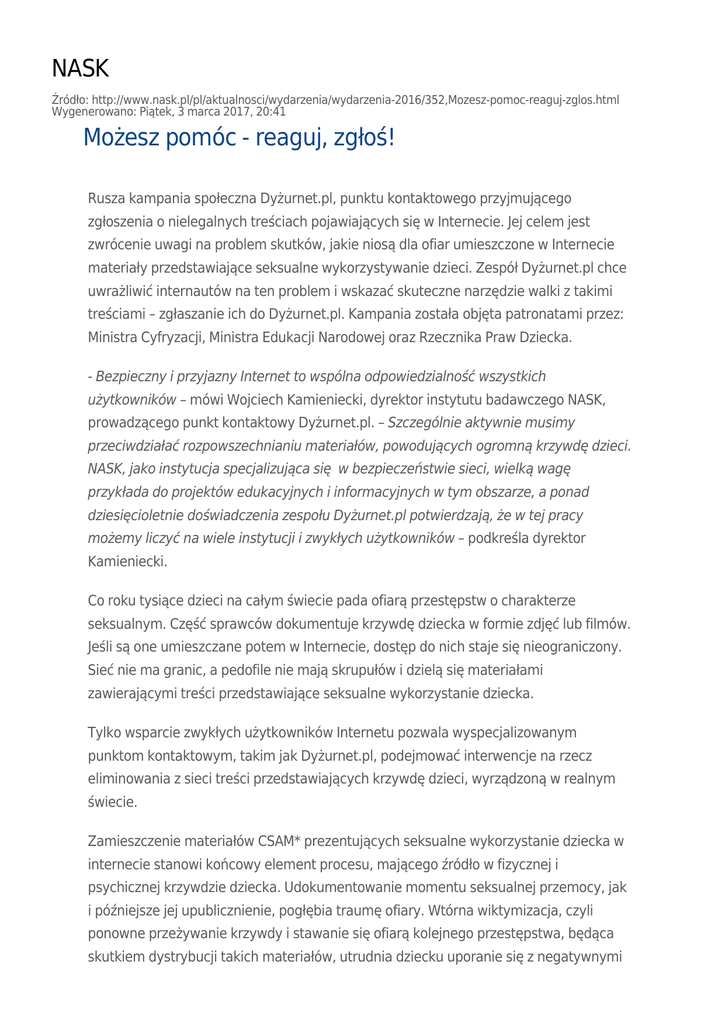 NASK Źródło: http://www.nask.pl/pl/aktualnosci/wydarzenia/wydarzenia-2016/352,Mozesz-pomoc-reaguj-zglos.html Wygenerowano: Piątek, 3 marca 2017, 20:41 Możesz pomóc - reaguj, zgłoś! Rusza kampania społeczna Dyżurnet.pl, punktu kontaktowego przyjmującego zgłoszenia o nielegalnych treściach pojawiających się w Internecie. Jej celem jest zwrócenie uwagi na problem skutków, jakie niosą dla ofiar umieszczone w Internecie materiały przedstawiające seksualne wykorzystywanie dzieci. Zespół Dyżurnet.pl chce uwrażliwić internautów na ten problem i wskazać skuteczne narzędzie walki z takimi treściami – zgłaszanie ich do Dyżurnet.pl. Kampania została objęta patronatami przez: Ministra Cyfryzacji, Ministra Edukacji Narodowej oraz Rzecznika Praw Dziecka. - Bezpieczny i przyjazny Internet to wspólna odpowiedzialność wszystkich użytkowników – mówi Wojciech Kamieniecki, dyrektor instytutu badawczego NASK, prowadzącego punkt kontaktowy Dyżurnet.pl. – Szczególnie aktywnie musimy przeciwdziałać rozpowszechnianiu materiałów, powodujących ogromną krzywdę dzieci. NASK, jako instytucja specjalizująca się w bezpieczeństwie sieci, wielką wagę przykłada do projektów edukacyjnych i informacyjnych w tym obszarze, a ponad dziesięcioletnie doświadczenia zespołu Dyżurnet.pl potwierdzają, że w tej pracy możemy liczyć na wiele instytucji i zwykłych użytkowników – podkreśla dyrektor Kamieniecki. Co roku tysiące dzieci na całym świecie pada ofiarą przestępstw o charakterze seksualnym. Część sprawców dokumentuje krzywdę dziecka w formie zdjęć lub filmów. Jeśli są one umieszczane potem w Internecie, dostęp do nich staje się nieograniczony. Sieć nie ma granic, a pedofile nie mają skrupułów i dzielą się materiałami zawierającymi treści przedstawiające seksualne wykorzystanie dziecka. Tylko wsparcie zwykłych użytkowników Internetu pozwala wyspecjalizowanym punktom kontaktowym, takim jak Dyżurnet.pl, podejmować interwencje na rzecz eliminowania z sieci treści przedstawiających krzywdę dzieci, wyrządzoną w realnym świecie. Zamieszczenie materiałów CSAM* prezentujących seksualne wykorzystanie dziecka w internecie stanowi końcowy element procesu, mającego źródło w fizycznej i psychicznej krzywdzie dziecka. Udokumentowanie momentu seksualnej przemocy, jak i późniejsze jej upublicznienie, pogłębia traumę ofiary. Wtórna wiktymizacja, czyli ponowne przeżywanie krzywdy i stawanie się ofiarą kolejnego przestępstwa, będąca skutkiem dystrybucji takich materiałów, utrudnia dziecku uporanie się z negatywnymi konsekwencjami seksualnej przemocy oraz naraża je na dodatkowy, bardzo poważny stres. Z tego względu tak ważne jest przekazywanie informacji o obecności nielegalnych materiałów do Dyżurnet.pl, który, podobnie jak inne zespoły na świecie, podejmuje działania zmierzające do jego usunięcia z sieci. *CSAM - Child Sexual Abuse Materials to termin określający materiały przedstawiające seksualne wykorzystanie dziecka - utożsamiany z terminem „pornografia dziecięca” ponieważ oznacza fakt wykorzystania dziecka w świecie realnym Narzędzia kampanii społecznej W kampanii społecznej wykorzystany zostanie m.in. spot internetowy oraz grafiki prezentujące sedno problemu – krzywdę dzieci, ofiar pedofilii. Czym jest Dyżurnet.pl Dyżurnet.pl, funkcjonujący w instytucie badawczym NASK, to jedyny w Polsce zespół przyjmujący informacje o publikowanych w Internecie treściach zabronionych prawem - przede wszystkim przedstawiających seksualne wykorzystanie dzieci. Zespół podejmuje działania na rzecz usunięcia tych materiałów z sieci. Internauci mogą zgłaszać się anonimowo do Dyżurnet.pl zawsze, gdy natrafią w sieci na niepokojące treści. Można to zrobić anonimowo za pomocą formularza znajdującego się pod adresem https://dyzurnet.pl/formularz.html lub kontaktując się z zespołem telefonicznie dzwoniąc na numer 801 615 005 lub pisząc na adres [email protected]. Według polskiego prawa, osoba, która produkuje, posiada albo rozpowszechnia treści pornograficzne z udziałem małoletniego podlega karze pozbawienia wolności od lat 2 do 12. Dyżurnet.pl należy do międzynarodowej sieci INHOPE, która zrzesza 51 zespołów interwencyjnych, działających w 45 krajach. Internauci mogą do nich anonimowo zgłaszać napotkane w sieci nadużycia. Zespoły te sprawdzają, czy doszło do przestępstwa i kierują sprawy do organów ścigania lub kontaktują się z administratorami serwisów. Przekazują też sobie wzajemnie informacje, co pozwala działać wtedy, gdy internauta napotyka szkodliwe lub nielegalne treści umieszczone na zagranicznym serwerze. Zespół Dyżurnet.pl funkcjonuje od 2005 roku, w tym czasie przeanalizował ponad 60 tysięcy zgłoszeń przesłanych przez użytkowników Internetu, instytucji oraz innych zespołów reagujących. Dyżurnet.pl współpracuje z Akademią NASK, specjalizującą się w prowadzeniu projektów edukacyjnych na rzecz bezpiecznego i przyjaznego Internetu. Możesz pomóc - reaguj, zgłoś!