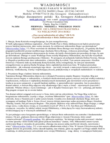 WIADOMOŚCI POLSKIEJ PARAFII W BEDFORD Tel/Fax: (01234 266901) Dom: (01234) 343105 Mobile: 07946773214 (Ks Grzegorz Aleksandrowicz) Wydaje duszpasterz polski Nr.1454 Ks. Grzegorz Aleksandrowicz www.ppb.org.uk oraz e-mail: [email protected] For Private Circulation Only Charity Reg.No.1119423 PIERWSZA NIEDZIELA WIELKIEGO POSTU ROK C ORĘDZIE OJCA ŚWIĘTEGO FRANCISZKA NA WIELKI POST 2016 ROKU „Chcę raczej miłosierdzia niż ofiary” (Mt 9,13) Uczynki miłosierdzia w Roku Jubileuszowym 1. Maryja, ikona Kościoła ewangelizującego, bo jest ewangelizowany. W bulli ogłaszającej Jubileusz napisałem: „Niech Wielki Post w Roku Jubileuszowym będzie przeżywany jeszcze bardziej intensywnie, jako ważny moment, by celebrować miłosierdzie Boga i go doświadczać” (Misericordiae Vultus, 17). Przez wezwanie do słuchania Słowa Bożego oraz inicjatywę „24 godziny dla Pana” pragnąłem podkreślić prymat modlitewnego słuchania Słowa Bożego, zwłaszcza prorockiego. Miłosierdzie Boże jest bowiem przesłaniem skierowanym do świata, ale każdy chrześcijanin jest powołany do tego, by sam go doświadczać. Dlatego w czasie Wielkiego Postu roześlę Misjonarzy Miłosierdzia, aby byli dla wszystkich żywym znakiem Bożego przebaczenia i bliskości. Po przyjęciu od archanioła Gabriela Dobrej Nowiny, Maryja w Magnificat profetycznie sławi miłosierdzie, z którym Bóg Ją wybrał. Tym samym zaręczona z Józefem Dziewica z Nazaretu stała się doskonałą ikoną Kościoła, który ewangelizuje, bo sam jest nieustannie ewangelizowany za sprawą Ducha Świętego, który zapłodnił jej dziewicze łono. W tradycji prorockiej miłosierdzie – jak wskazuje etymologia tego słowa – ma ścisły związek z matczynym łonem (rahamim) i z dobrocią wielkoduszną, wierną i współczującą (hesed), praktykowaną w związkach małżeńskich i w rodzinie. 2. Przymierze Boga z ludźmi: historia miłosierdzia. Tajemnica Bożego Miłosierdzia objawia się w dziejach Przymierza między Bogiem i Izraelem. Bóg jest bowiem zawsze bogaty w miłosierdzie, w każdych okolicznościach gotowy otoczyć swój lud wielką czułością i współczuciem, zwłaszcza w najbardziej dramatycznych momentach, gdy niewierność zrywa przymierze i trzeba je na nowo ustanowić, w sposób bardziej stabilny, w sprawiedliwości i prawdzie. Jest to prawdziwy dramat miłości, w którym Bóg odgrywa rolę zdradzonego Ojca i męża, a Izrael – niewiernych syna/córki i małżonki. Właśnie obrazy z życia rodzinnego – jak w Księdze Ozeasza (por. Oz 1-2) – pokazują, jak bardzo Bóg pragnie związać się ze swoim ludem. Ten dramat miłości osiągnął swój szczyt w Synu, który stał się człowiekiem. Na Niego Bóg wylał swe bezgraniczne miłosierdzie, czyniąc z niego „wcielone Miłosierdzie” (por. Misericordiae Vultus, 8). Jako człowiek, Jezus z Nazaretu jest w pełni synem Izraela. Uosabia owo doskonałe słuchanie Boga, które jest wymagane od każdego Żyda w Szema Jisrael, jeszcze dzisiaj stanowiące sedno przymierza Boga z Izraelem: “Słuchaj, Izraelu, Pan jest naszym Bogiem – Pan jedynie. Będziesz więc miłował Pana, Boga twojego, z całego swego serca, z całej duszy swojej, ze wszystkich swych sił” (Pwt 6, 4-5). Syn Boży jest Oblubieńcem czyniącym wszystko, by zdobyć miłość swojej Oblubienicy, z którą łączą Go więzy bezwarunkowej miłości, uwidoczniającej się w wiecznych zaślubinach z nią. To jest pulsujące serce kerygmatu apostolskiego, w którym Boże miłosierdzie ma centralne i fundamentalne miejsce. On jest „pięknem zbawczej miłości Boga objawionej w Jezusie Chrystusie, który umarł i zmartwychwstał” (Evangelii gaudium, 36), głównym orędziem, “do którego trzeba stale powracać i słuchać na różne sposoby i które trzeba stale głosić podczas katechezy” (tamże, 164). Miłosierdzie zatem wyraża zachowanie Boga w stosunku do grzesznika, ofiarując mu jeszcze jedną możliwość skruchy, nawrócenia i wiary” (Misericordiae Vultus, 21), a tym samym odbudowania relacji z Nim. W Jezusie Ukrzyżowanym Bóg pragnie dotrzeć do grzesznika, który odszedł najdalej, tam właśnie, gdzie się zagubił i od Niego oddalił. Robi to z nadzieją, że zdoła poruszyć zatwardziałe serce swojej Oblubienicy. (ciąg dalszy w następnym biuletynie). Niedziela,14.2.2016 r Godz. 9.30 Godz.11.00 Godz.18.00 Godz.19.00 Poniedziałek,15.2.2016 Godz. 9.30 Wtorek, 16.2.2016 Godz. 9.30 Środa, 17.2.2016 Godz. 9.30 PIERWSZA NIEDZIELA WIELKIEGO POSTU Rok C - GORZKIE ŻALE. O błogosławieństwo Boże dla Elżbiety i Czesława Osek z okazji 44 rocznicy ślubu. za dusze ś.p.Jana Porosa w 5-tą rocznicę śmierci– int. wnuczki z mężem i dziećmi - O zdrowie i błogosławieństwo Boże dla syna Miłosza - int. rodziców. - Intencja wolna. Godz.19.00 - Intencja wolna. - Intencja wolna. - Intencja wolna. Godz.19.00 - Intencja wolna. Czwartek, 18.2.2016 Godz. 9.30 - za dusze ś.p.Mrii Kręciszewskiej - int. rodziny. Godz.19.00 - Intencja wolna. Piątek, 19. 2. 2016 Godz.15.00 - DROGA KRZYŻOWA. - Intencja wolna. KORONKA DO MIŁOSIERDZIA BOŻEGO. Godz.19.00 - DROGA KRZYŻOWA. W pewnej intencji. Sobota, 20.2. 2016 Godz. 9.30 - za dusze ś.p. Wandy Sarad - int. G.T.Lovell z rodziną. Godz.10.00 - SPOWIEDŹ ŚWIĘTA. ADORACJA NAJŚWIĘTSZEGO SAKRAMENTU. Godz.19.00 - za dusze ś.p.Bolesława Stalmach w 10-tą rocznicę śmierci – int. córki z rodziną. Niedziela, 21.2.2016 DRUGA NIEDZIELA WIELKIEGO POSTU Rok C Godz. 9.15 - GORZKIE ŻALE. Godz. 9.30 - Intencja wolna. Godz.11.00 - Intencja wolna. Godz.19.00 - Intencja wolna. CHRZEST ŚW.: Sakrament Chrztu świętego otrzymał ALAN ADRIAN NOWAK w sobotę 13 lutego 2016 r. Nowo ochrzczonemu dziecku i jego rodzicom życzymy błogosławieństwa Bożego i opieki Bożej. OGŁOSZENIA PARAFIALNE: 1. W każdy piątek Wielkiegio Postu o godz. 15.00 i o godz.19.00 odprawiana będzie DROGA KRZYŻOWA. 2. W każdą niedzielę Wielkiego 