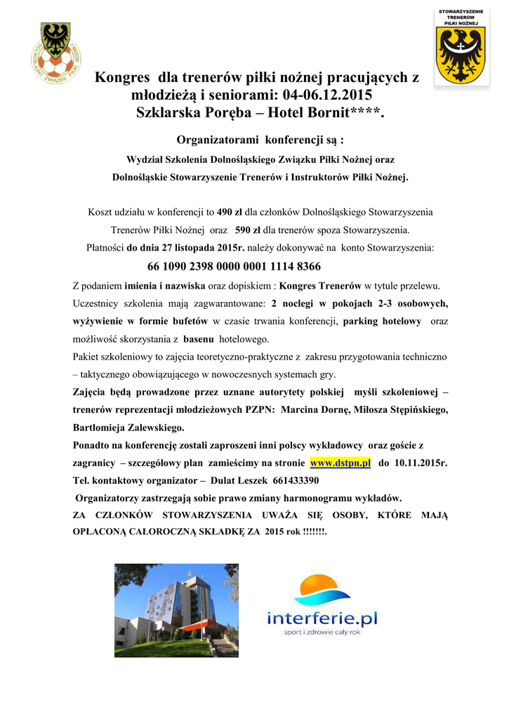 Kongres dla trenerów piłki nożnej pracujących z młodzieżą i seniorami: 04-06.12.2015 Szklarska Poręba – Hotel Bornit****. Organizatorami konferencji są : Wydział Szkolenia Dolnośląskiego Związku Piłki Nożnej oraz Dolnośląskie Stowarzyszenie Trenerów i Instruktorów Piłki Nożnej. Koszt udziału w konferencji to 490 zł dla członków Dolnośląskiego Stowarzyszenia Trenerów Piłki Nożnej oraz 590 zł dla trenerów spoza Stowarzyszenia. Płatności do dnia 27 listopada 2015r. należy dokonywać na konto Stowarzyszenia: 66 1090 2398 0000 0001 1114 8366 Z podaniem imienia i nazwiska oraz dopiskiem : Kongres Trenerów w tytule przelewu. Uczestnicy szkolenia mają zagwarantowane: 2 noclegi w pokojach 2-3 osobowych, wyżywienie w formie bufetów w czasie trwania konferencji, parking hotelowy oraz możliwość skorzystania z basenu hotelowego. Pakiet szkoleniowy to zajęcia teoretyczno-praktyczne z zakresu przygotowania techniczno – taktycznego obowiązującego w nowoczesnych systemach gry. Zajęcia będą prowadzone przez uznane autorytety polskiej myśli szkoleniowej – trenerów reprezentacji młodzieżowych PZPN: Marcina Dornę, Miłosza Stępińskiego, Bartłomieja Zalewskiego. Ponadto na konferencję zostali zaproszeni inni polscy wykładowcy oraz goście z zagranicy – szczegółowy plan zamieścimy na stronie www.dstpn.pl do 10.11.2015r. Tel. kontaktowy organizator – Dulat Leszek 661433390 Organizatorzy zastrzegają sobie prawo zmiany harmonogramu wykładów. ZA CZŁONKÓW STOWARZYSZENIA UWAŻA SIĘ OPŁACONĄ CAŁOROCZNĄ SKŁADKĘ ZA 2015 rok !!!!!!!. OSOBY, KTÓRE MAJĄ