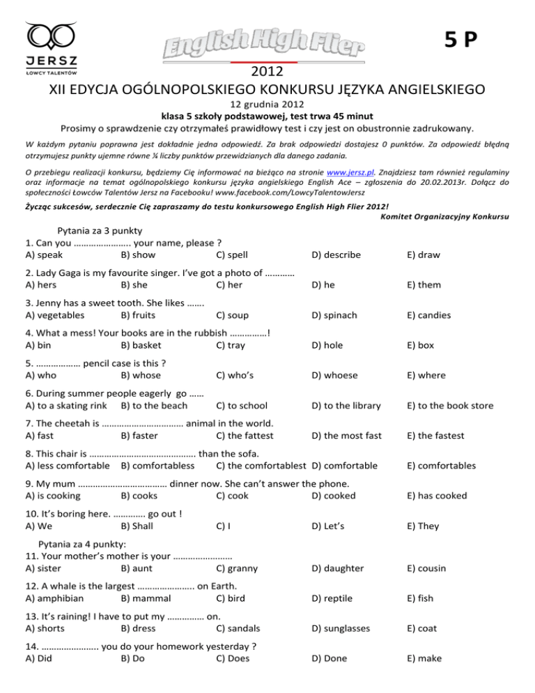 5 P 2012 XII EDYCJA OGÓLNOPOLSKIEGO KONKURSU JĘZYKA ANGIELSKIEGO 12 grudnia 2012 klasa 5 szkoły podstawowej, test trwa 45 minut Prosimy o sprawdzenie czy otrzymałeś prawidłowy test i czy jest on obustronnie zadrukowany. W każdym pytaniu poprawna jest dokładnie jedna odpowiedź. Za brak odpowiedzi dostajesz 0 punktów. Za odpowiedź błędną otrzymujesz punkty ujemne równe ¼ liczby punktów przewidzianych dla danego zadania. O przebiegu realizacji konkursu, będziemy Cię informować na bieżąco na stronie www.jersz.pl. Znajdziesz tam również regulaminy oraz informacje na temat ogólnopolskiego konkursu języka angielskiego English Ace – zgłoszenia do 20.02.2013r. Dołącz do społeczności Łowców Talentów Jersz na Facebooku! www.facebook.com/LowcyTalentowJersz Życząc sukcesów, serdecznie Cię zapraszamy do testu konkursowego English High Flier 2012! Komitet Organizacyjny Konkursu Pytania za 3 punkty 1. Can you ………………….. your name, please ? A) speak B) show C) spell D) describe 2. Lady Gaga is my favourite singer. I’ve got a photo of ………… A) hers B) she C) her D) he 3. Jenny has a sweet tooth. She likes ……. A) vegetables B) fruits C) soup D) spinach 4. What a mess! Your books are in the rubbish ……………! A) bin B) basket C) tray D) hole 5. ……………… pencil case is this ? A) who B) whose C) who’s D) whoese 6. During summer people eagerly go …… A) to a skating rink B) to the beach C) to school D) to the library 7. The cheetah is …………………………… animal in the world. A) fast B) faster C) the fattest D) the most fast 8. This chair is ……………………………………. than the sofa. A) less comfortable B) comfortabless C) the comfortablest D) comfortable 9. My mum ……………………………… dinner now. She can’t answer the phone. A) is cooking B) cooks C) cook D) cooked 10. It’s boring here. …………. go out ! A) We B) Shall C) I D) Let’s Pytania za 4 punkty: 11. Your mother’s mother is your …………………… A) sister B) aunt C) granny D) daughter 12. A whale is the largest ………………….. on Earth. A) amphibian B) mammal C) bird D) reptile 13. It’s raining! I have to put my …………… on. A) shorts B) dress C) sandals D) sunglasses 14. ………………….. you do your homework yesterday ? A) Did B) Do C) Does D) Done E) draw E) them E) candies E) box E) where E) to the book store E) the fastest E) comfortables E) has cooked E) They E) cousin E) fish E) coat E) make 15. Which of these words isn’t a fruit ? A) an aubergine B) a watermelon C) a leechee D) a pomergranade E) an orange 16. Look at the sky! It’s ……………… to rain! A) will B) going C) going to D) will be E) go 17. Which of these is a part of the body? A) a thumb B) a drawer C) a tray D) a dish E) a sock 18. When it’s winter, the temperature usually goes ……………………… 0 degrees. A) over B) next to C) below D) common E) up 19. People usually don’t choose to spend their summer holidays: A) at the seaside B) in the mountains C) in the city D) in the countryside E) abroad 20. It’s a deep lake. Don’t go there, you …………….. swim! A) can’t B) can C) don’t have to D) may E) mustn’t Pytania za 5 punktów: 21. I…………………. TV when the doorbell …………………… A) was watch/rang B) was watching/ring C) was watching/ rang D) watched / was ringing E) watched/rang 22. The computer doesn’t work. I think it’s …………………… A) fixed B) broke C) breaking D) going to break E) broken 23. At Christmas you ……………….. the Christmas tree with ornaments. A) trim B) put on C) hang D) paint E) decoration 24. What can you find outside your house ? A) a ceiling B) a cellar C) a pavement D) staircase E) a bath tube 25. What’s the name of Prince’s William wife ? A) Jaqueline B) Camilla C) Bernadette D) Catherine E) Diane 26. Who is the current president of the United States? A) George Washington B) George Bush C) Bill Clinton D) Hillary Clinton E) Barack Obama 27. Which of these doesn’t belong to the USA: E) Florida A) Greenland B) Hawaii C) Alaska D) Midway 28. What nickname did Norma Jane Baker, a famous American actress, choose? A) Marilyn Monroe B) Dita Von Teese C) Miley Cyrus D) Pola Negri E) Gwyneth Paltrow 29. What is the largest state in the USA ? A) California B) New Mexico C) Nevada D) Alaska E) Oregon 30. Which of these doesn’t belong to the United Kingdom? A) England B) Northern Ireland C) Ireland D) Scotland E) Wales PARTNERZY PATRONI © Copyright by ŁOWCY TALENTÓW – JERSZ, Wilczyn 2012, www.jersz.pl