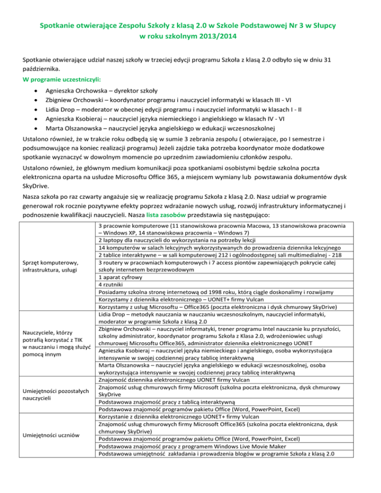 Spotkanie otwierające Zespołu Szkoły z klasą 2.0 w Szkole Podstawowej Nr 3 w Słupcy w roku szkolnym 2013/2014 Spotkanie otwierające udział naszej szkoły w trzeciej edycji programu Szkoła z klasą 2.0 odbyło się w dniu 31 października. W programie uczestniczyli: Agnieszka Orchowska – dyrektor szkoły Zbigniew Orchowski – koordynator programu i nauczyciel informatyki w klasach III - VI Lidia Drop – moderator w obecnej edycji programu i nauczyciel informatyki w klasach I - II Agnieszka Ksobieraj – nauczyciel języka niemieckiego i angielskiego w klasach IV - VI Marta Olszanowska – nauczyciel języka angielskiego w edukacji wczesnoszkolnej Ustalono również, że w trakcie roku odbędą się w sumie 3 zebrania zespołu ( otwierające, po I semestrze i podsumowujące na koniec realizacji programu) Jeżeli zajdzie taka potrzeba koordynator może dodatkowe spotkanie wyznaczyć w dowolnym momencie po uprzednim zawiadomieniu członków zespołu. Ustalono również, że głównym medium komunikacji poza spotkaniami osobistymi będzie szkolna poczta elektroniczna oparta na usłudze Microsoftu Office 365, a miejscem wymiany lub powstawania dokumentów dysk SkyDrive. Nasza szkoła po raz czwarty angażuje się w realizację programu Szkoła z klasą 2.0. Nasz udział w programie generował rok rocznie pozytywne efekty poprzez wdrażanie nowych usług, rozwój infrastruktury informatycznej i podnoszenie kwalifikacji nauczycieli. Nasza lista zasobów przedstawia się następująco: Sprzęt komputerowy, infrastruktura, usługi Nauczyciele, którzy potrafią korzystać z TIK w nauczaniu i mogą służyć pomocą innym Umiejętności pozostałych nauczycieli Umiejętności uczniów 3 pracownie komputerowe (11 stanowiskowa pracownia Macowa, 13 stanowiskowa pracownia – Windows XP, 14 stanowiskowa pracownia – Windows 7) 2 laptopy dla nauczycieli do wykorzystania na potrzeby lekcji 14 komputerów w salach lekcyjnych wykorzystywanych do prowadzenia dziennika lekcyjnego 2 tablice interaktywne – w sali komputerowej 212 i ogólnodostępnej sali multimedialnej - 218 3 routery w pracowniach komputerowych i 7 access piontów zapewniających pokrycie całej szkoły internetem bezprzewodowym 1 aparat cyfrowy 4 rzutniki Posiadamy szkolna stronę internetową od 1998 roku, którą ciągle doskonalimy i rozwijamy Korzystamy z dziennika elektronicznego – UONET+ firmy Vulcan Korzystamy z usług Microsoftu – Office365 (poczta elektroniczna i dysk chmurowy SkyDrive) Lidia Drop – metodyk nauczania w nauczaniu wczesnoszkolnym, nauczyciel informatyki, moderator w programie Szkoła z klasą 2.0 Zbigniew Orchowski – nauczyciel informatyki, trener programu Intel nauczanie ku przyszłości, szkolny administrator, koordynator programu Szkoła z Klasa 2.0, wdrożeniowiec usługi chmurowej Microsoftu Office365, administrator dziennika elektronicznego UONET Agnieszka Ksobieraj – nauczyciel języka niemieckiego i angielskiego, osoba wykorzystująca intensywnie w swojej codziennej pracy tablicę interaktywną Marta Olszanowska – nauczyciel języka angielskiego w edukacji wczesnoszkolnej, osoba wykorzystująca intensywnie w swojej codziennej pracy tablicę interaktywną Znajomość dziennika elektronicznego UONET firmy Vulcan Znajomość usług chmurowych firmy Microsoft (szkolna poczta elektroniczna, dysk chmurowy SkyDrive Podstawowa znajomość pracy z tablicą interaktywną Podstawowa znajomość programów pakietu Office (Word, PowerPoint, Excel) Korzystanie z dziennika elektronicznego UONET+ firmy Vulcan Znajomość usług chmurowych firmy Microsoft Office365 (szkolna poczta elektroniczna, dysk chmurowy SkyDrive) Podstawowa znajomość programów pakietu Office (Word, PowerPoint, Excel) Podstawowa znajomość pracy z programem Windows Live Movie Maker Podstawowa umiejętność zakładania i prowadzenia blogów w programie Szkoła z klasą 2.0 Spotkanie otwierające Zespołu Szkoły z klasą 2.0 w Szkole Podstawowej Nr 3 w Słupcy w roku szkolnym 2013/2014 Lista pytań i problemów Plan działania w roku szkolnym 2013/2014 Głównym naszym celem jest dążenie do podnoszenia kwalifikacji komputerowych nauczycieli, tak abyśmy uczyli w sposób nowoczesny, który pozwala zaciekawić uczniów i wykorzystać ich naturalną ciekawość świata. Nasze potrzeby są duże: wymiany wymagają komputery w klasach służące do prowadzenia dziennika elektronicznego, modernizacji lub wymiany wymaga pracownia w sali 212 z całą pewnością przydały by się kolejne tablice interaktywne. Jednak ograniczona ilość dostępnych środków powoduje, że zamierzenia te będą realizowane wolniej niż byśmy tego oczekiwali. Skupimy się więc głównie na zoptymalizowaniu wykorzystania posiadanego już sprzętu. Chcą wykorzystać nasz udział w programie zamierzamy wprowadzać zmiany, które nie będą generowały dużych kosztów, a pozwolą w sposób znaczący zwiększyć wykorzystanie TIK w nauczaniu. Działania dyrektora: Szkoła z Wi-Fi (I semestr): W bieżącym roku szkolnym dzięki wejściu w realizację projektu „Cyfrowa Dziecięca Encyklopedia Wielkopolan” będziemy mieli nową, profesjonalną sieć Wi-Fi w szkole, która zastąpi dotychczasową wysłużoną i nie spełniającą oczekiwań wydajnościowych. Nowa sieć pozwoli również na korzystanie z zasobów Internetów przez uczniów na własnych urządzeniach. Nasi e-nauczyciele (II semestr): organizowanie wparcia i szkoleń dla zainteresowanych nauczycieli w zakresie wykorzystania nowych technologii na lekcjach Szkolenie nauczycieli w ramach projektu Eduk@cyjna Rewolucja w Wielkopolsce w zakresie tworzenia prezentacji, korzystania z tablicy multimedialnej i platformy Fronter. Doskonalenie wewnątrz szkolne poprzez wzajemną wymianę doświadczeń. Działania koordynatora: Opracowanie planu działania szkoły (X 2013) Zorganizowanie Targów 2.0 (XI/XII 2013) Wspieranie nauczycieli i dyrektora w realizacji zadań (przez cały rok) Zorganizowanie 