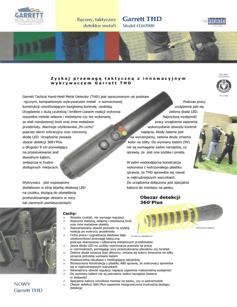 Zyskaj przewagę taktyczną z innowacyjnym wykrywaczem Garrett THD Garrett Tactical Hand-Held Metal Detector (THD) jest opracowanym od podstaw ręcznym, kompaktowym wykrywaczem metali o wzmocnionej Podczas pracy konstrukcji umoŜliwiającym bezgłośną kontrolę osobistą. Urządzenie z duŜą czułością i krótkim czasem reakcji wykrywa wszystkie metale Ŝelazne i nieŜelazne czy teŜ wykonaną ze stali nierdzewnej broń oraz inne metalowe przedmioty. Alarmuje uŜytkownika „Po cichu” poprzez alarm wibracyjny oraz czerwoną diodę LED. Urządzenie posiada obszar detekcji 360° Plus urządzenia pali się zielona dioda LED. NajwyŜszą wydajność pracy urządzenia zapewnia wykorzystanie obwodu kontroli napięcia. Kiedy bateria jest na wyczerpaniu, zielona dioda zmienia kolor na Ŝółty. Do wymiany baterii (9V) o długości 9 cm pozwalający nie są wymagane Ŝadne narzędzia, co na przeszukiwanie pod sprawia, Ŝe jest ona szybka i prosta. dowolnym kątem, zwłaszcza w trudno W pełni wodoodporna konstrukcja dostępnych miejscach. wykonana z wytrzymałego plastiku sprawia, Ŝe THD sprawdza się nawet w najtrudniejszych warunkach. Wykrywacz jest wyposaŜony Do urządzenia dołączona jest specjalna dodatkowo w silną latarkę diodową LED kabura do montaŜu na pasku. na czubku, słuŜącą do oświetlania przeszukiwanego obszaru w nocy lub ciemnych pomieszczeniach. Cechy: • • • • • • • • • • • • Wysoka czułość, nie wymaga regulacji Wykrywa stalową, Ŝelazną i nieŜelazną broń oraz inne metalowe obiekty Zaawansowany obwód pozwala na szybką reakcję po wykryciu przedmiotu Cicha praca i sygnalizacja diodowa daje uŜytkownikowi przewagę taktyczną podczas skanowania i odbierania metalowych przedmiotów Jasna dioda LED na czubku wykrywacza pozwala na pracę w ciemnościach, pomagając przy przeszukiwaniu plecaków czy torebek Zielona dioda oznacza stan aktywny, zmiana jej koloru świecenia na Ŝółty oznacza potrzebę wymiany baterii Wodoszczelna obudowa z nieślizgającą rękojeścią Wzmocniona konstrukcja z plastiku ABS sprawia, Ŝe wykrywacz sprawdza się w najtrudniejszych warunkach Wewnętrzny obwód regulacji napięcia zapewnia maksymalną wydajność Do wymiany baterii nie są potrzebne Ŝadne narzędzia (bateria w zestawie) Specjalna kabura umoŜliwia montaŜ na pasku, czy w samochodzie Obszar detekcji 360° Plus zapewnia nieograniczoną trudnością dostępu detekcję S pe c yf ika cj a tech n ic zna : Częstotliwość pracy: 95kHz Napięcie: 6-9VDC Prąd: 5 mA Regulacja: Automatyczna Wskaźniki: Cichy alarm wibracyjny, Czerwony LED- informuje o alarmie, Zielony/ śółty LED oznacza gotowość do pracy i niski stan baterii Ś rod ow isk o p ra cy: • Temperatura: -35°C do 70°C • Wilgotność: do 95% nieskroplona • Wodoszczelność: IEC 60529 Klasyfikacja IP66 I nfo rma cj e do da tk o we Ce ch y Standardy bezpieczeństwa publicznego: • Wnikliwe badania nie wykazały, by produkt ten miał wpływ na ciąŜę czy teŜ implanty medyczne • Institute of Electrical and Electronics Engineers: „A standard of Safety Levels with Respect to Human Exposure in Radio Frequency Electromagnetic Fields, 3 kHz do 300 GHz” IEEE C95.1 – 1991 sekcja 4,12 • Occupational and Safety Health Administration: Radiation Protection Guide, CFR 1910.97 section (2)i. • Canada Health and Welfare Radiation Protection Bureau Safety Code, RPB-S.C.-18 sekcja 3.2.2 badająca wpływ pola elektromagnetycznego na stymulatory serca. • International Comminssion for Non Ionizing Radiation Protection (ICNIRP) „Reference levels for general public exposure” Przyciski kontrolne: Załącz/ Wyłącz: Światło diodowe: Latarka: dioda LED (załączana chwilowo) Bateria: 9 V dołączona w zestawie pozwala na pracę do 70 godzin Gwarancja: ograniczona, 24 miesiące na części i wykonanie Standardy magnetycznych zapisów danych: • United States Departament of Commerce: „Care and Handling of Computer Magnetic Storage Media”, NBS Special Publication 500-101. Pole magnetyczne poniŜej 1 Gaussa nie wpływa na nośniki danych o zapisie magnetycznym włączając kasety i dyskietki. Standardy elektromagnetyczne: • THD spełnia wymagania wszystkich standardów EMC i jest zgodny z międzynarodowymi dyrektywami (certyfikat ) Zasilanie W ym iar y Długość: Grubość: Obszar detekcji: Waga: 22 cm 2,9-3,8 cm 9 cm, 360° Plus wskaźnik celu 0,2 kg Akc es o ria o pc jon a ln e Zestaw do ładowania z akumulatorami • Zawiera 2 przyjazne środowisku baterie NiMH z ładowarką • 220V zewnętrzna: Model 1618100 Dystrybucja w Polsce: 30-624 Kraków; ul. Alfreda Dauna 70 tel. 0-12 655-85-85, fax 0-12 425-63-68, kom. 0 501 704 101, e-mail: [email protected] ; http://www.talcomp.pl 2003 Garrett Electronics, Inc. 2004 Talcomp, Kraków