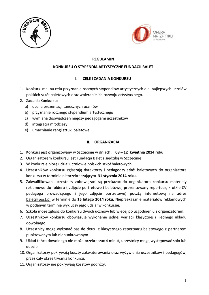REGULAMIN KONKURSU O STYPENDIA ARTYSTYCZNE FUNDACJI BALET I. CELE I ZADANIA KONKURSU 1. Konkurs ma na celu przyznanie rocznych stypendiów artystycznych dla najlepszych uczniów polskich szkół baletowych oraz wpieranie ich rozwoju artystycznego. 2. Zadania Konkursu: a) ocena prezentacji tanecznych uczniów b) przyznanie rocznego stypendium artystycznego c) wymiana doświadczeń między pedagogami uczestników d) integracja młodzieży e) umacnianie rangi sztuki baletowej II. ORGANIZACJA Konkurs jest organizowany w Szczecinie w dniach : 08 – 12 kwietnia 2014 roku Organizatorem konkursu jest Fundacja Balet z siedzibą w Szczecinie W konkursie biorą udział uczniowie polskich szkół baletowych. Uczestników konkursu zgłaszają dyrektorzy i pedagodzy szkół baletowych do organizatora konkursu w terminie nieprzekraczającym 31 stycznia 2014 roku. 5. Zakwalifikowani uczestnicy zobowiązani są przekazać do organizatora konkursu materiały reklamowe do folderu ( zdjęcie portretowe i baletowe, prezentowany repertuar, krótkie CV pedagoga prowadzącego i jego zdjęcie portretowe) pocztą internetową na adres [email protected] w terminie do 15 lutego 2014 roku. Nieprzekazanie materiałów reklamowych w podanym terminie wykluczy jego udział w konkursie. 6. Szkoła może zgłosić do konkursu dwóch uczniów lub więcej po uzgodnieniu z organizatorem. 7. Uczestników konkursu obowiązuje wykonanie jednej wariacji klasycznej i jednego układu dowolnego. 8. Uczestnicy mogą wykonać pas de deux z klasycznego repertuaru baletowego z partnerem punktowanym lub niepunktowanym. 9. Układ tańca dowolnego nie może przekraczać 4 minut, uczestnicy mogą występować solo lub duecie 10. Organizatorzy pokrywają koszty zakwaterowania oraz wyżywienia uczestników i pedagogów, przez cały okres trwania konkursu. 11. Organizatorzy nie pokrywają kosztów podróży. 1. 2. 3. 4. 1 1. 2. 3. 4. 5. III. JURY Uczestników ocenia Kapituła Fundacji Balet, powołana przez organizatora konkursu. Przewodniczącego Kapituły powołuje organizator. W Kapitule nie mogą zasiadać osoby, które przygotowywały uczestników do udziału w konkursie oraz dyrektorzy i wicedyrektorzy szkół uczniów uczestniczących w konkursie. Kapituła działa przez cały czas trwania konkursu. Do zadań Kapituły należy: a) ocena poziomu wykonania układów tanecznych z klasycznego repertuaru baletowego, z uwzględnieniem stylu i charakteru tańca oraz jego artystycznej formy, techniki, linii ciała, elegancji, wyrazu, muzykalności, b) ocena umiejętności wykonania układu tanecznego realizowanego w oparciu o techniki tańca współczesnego lub tańca demiklasycznego, ocena stylu, formy, charakteru ruchu wyrazu oraz osobowości artystycznej, c) przyznanie rocznego stypendium artystycznego na rok szkolny 2014/2015 d) uczestnicy konkursu oceniani są indywidualnie w skali od 1 – 10 punktów, niezależnie od tego, czy występują solo czy w duecie. e) w przypadku uzyskania przez uczestników równej liczby punktów, decyduje głos przewodniczącego Kapituły. f) uchwały Kapituły zapadają większością głosów, przy obecności co najmniej 2/3 składu. g) obrady Kapituły odbywają się po każdym dniu konkursowym. h) decyzje Kapituły są ostateczne i niepodważalne. IV. USTALENIA OGÓLNE 1. 2. 3. 4. 5. 6. 7. Uczestnicy konkursu występują solo lub w duecie. Partnerami w duecie mogą być osoby, które są uczestnikami konkursu lub nie. Kolejność występów uczestników według alfabetu. Prezentowane układy wykonywane są na scenie w kostiumach i w światłach scenicznych. Organizator konkursu nie odpowiada za prawa autorskie prezentowanych układów. Organizator konkursu zapewnia uczestnikom sale do ćwiczeń i próby na scenie. W każdym dniu odbywa się lekcja z pedagogiem. V. PLAN ORGANIZACJI KONKURSU 08.04.2014 – przyjazd uczestników 19.00 Inauguracja Konkursu – spektakl baletowy Opery na Zamku 09.04.2014 I Dzień Konkursowy Taniec Klasyczny 9. 00 – 10.00 lekcja na scenie dla uczestników konkursu 10.30 – 15.00 – próba dla uczestników konkursu 17.00 – 20.00 KONKURS 10.04.2014 II Dzień Konkursowy Taniec Współczesny 9. 00 – 10.00 lekcja na scenie dla uczestników konkursu 2 10.30 – 15.00 – próba dla uczestników konkursu 17.00 – 20.00 KONKURS 11.04.2014 Finał Konkursu 9.00 – 10.00 lekcja na scenie dla finalistów konkursu i gości gali 10 30 – 16.00 – próba na scenie dla finalistów konkursu i gości gali 19.00 – 21.00 – ogłoszenie wyników MIĘDZYNARODOWA GALA GWIAZD BALETU 2014 (w programie: laureaci konkursu, stypendyści, prezentacja uczniów Warszawskiej Szkoły Baletowej i zaproszeni Goście) 12.04.2014 Wyjazd uczestników. VI. NAGRODY, TYTUŁY I WYRÓŻNIENIA 1. Wszyscy uczestnicy biorący udział w konkursie i pedagodzy im towarzyszący, otrzymują dyplom lub medal uczestnictwa. 2. Liczba i wysokość przyznanych stypendiów artystycznych, uzależniona jest od zgromadzonych środków przez Fundację funduszy. VII. POSTANOWIENIA KOŃCOWE 1. Organizatorzy nie ponoszą żadnej odpowiedzialności za jakiekolwiek choroby i urazy uczestników konkursu. 2. Uczestnicy są odpowiedzialni za ubezpieczenie siebie od wypadków, choroby i kradzieży. 3. Nagrywanie i fotografowanie jest zabronione. Wszystkie utwory audiowizualne oraz zdjęcia wykonane podczas konkursu są własnością Fundacji. Kopiowanie ich bez pisemnej zgody Fundacji jest zabronione. 4. Uczestnicy zrzekają się wszelkich praw do utworów audiowizualnych i zdjęć wykonanych w imieniu Fundacji oraz ich rozpowszechniania (publikacji). 5. Uczestnicy wyrażają zgodę na używanie utworów audiowizualnych i zdjęć w celach reklamowych lub promocyjnych Fundacji. Ponadto, uczestnicy wyrażają zgodę na używanie wizerunku przez sponsorów konkursu, w swojej kampanii reklamowej. Takie przyznanie praw przez uczestników konkursu jest stałe i nieodwracalne bez żadnych geograficznych i czasowych ograniczeń. 6. Uczes