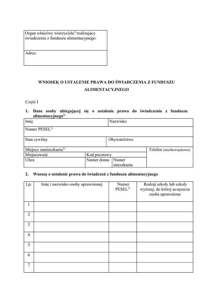 Organ właściwy wierzyciela1) realizujący świadczenia z funduszu alimentacyjnego: Adres: WNIOSEK O USTALENIE PRAWA DO ŚWIADCZENIA Z FUNDUSZU ALIMENTACYJNEGO Część I 1. Dane osoby ubiegającej się o ustalenie prawa do świadczenia z funduszu alimentacyjnego2) Imię Nazwisko Numer PESEL3) Stan cywilny Miejsce zamieszkania4) Miejscowość Ulica 2. Lp. 1 2 3 4 5 6 7 Obywatelstwo Telefon (nieobowiązkowo) Kod pocztowy Numer domu Numer mieszkania Wnoszę o ustalenie prawa do świadczeń z funduszu alimentacyjnego Imię i nazwisko osoby uprawnionej Numer PESEL3) Rodzaj szkoły lub szkoły wyższej, do której uczęszcza osoba uprawniona 3. Dane członków rodziny, w tym dzieci do ukończenia 25 lat, jeżeli pozostają na utrzymaniu rodziców, a także dziecka, które ukończyło 25. rok życia, otrzymującego świadczenia z funduszu alimentacyjnego lub legitymującego się orzeczeniem o znacznym stopniu niepełnosprawności, jeżeli w związku z tą niepełnosprawnością przysługuje świadczenie pielęgnacyjne lub specjalny zasiłek opiekuńczy, albo zasiłek dla opiekuna, a także osoby uprawnionej; do członków rodziny nie zalicza się: dziecka pozostającego pod opieką opiekuna prawnego, dziecka pozostającego w związku małżeńskim, rodzica osoby uprawnionej zobowiązanego tytułem wykonawczym pochodzącym lub zatwierdzonym przez sąd do alimentów na jej rzecz. W skład rodziny wchodzą: 1. ................................................................................................................................................ imię i nazwisko data urodzenia stopień pokrewieństwa ................................................................................................................................................ PESEL3) 2. urząd skarbowy ................................................................................................................................................ imię i nazwisko data urodzenia stopień pokrewieństwa ................................................................................................................................................ PESEL3) 3. urząd skarbowy ................................................................................................................................................ imię i nazwisko data urodzenia stopień pokrewieństwa ................................................................................................................................................ PESEL3) 4. urząd skarbowy ................................................................................................................................................ imię i nazwisko data urodzenia stopień pokrewieństwa ................................................................................................................................................ PESEL3) 5. urząd skarbowy ................................................................................................................................................ imię i nazwisko data urodzenia stopień pokrewieństwa ................................................................................................................................................ PESEL3) urząd skarbowy 4. Organ, do którego są opłacane składki na ubezpieczenie zdrowotne, o których mowa w art. 3 pkt 1 lit. a ustawy z dnia 28 listopada 2003 r. o świadczeniach rodzinnych (Dz. U. z 2015 r. poz. 114, z późn. zm.) w zw. z art. 2 pkt 4 ustawy z dnia 7 września 2007 r. o pomocy osobom uprawnionym do alimentów (Dz. U. z 2015 r. poz. 859, z późn. zm.), zwanej dalej „ustawą” (zakreślić odpowiedni kwadrat) □ Zakład Ubezpieczeń Społecznych □ Kasa Rolniczego Ubezpieczenia Społecznego □ Wojskowe Biuro Emerytalne □ Zakład Emerytalno-Rentowy Ministerstwa Spraw Wewnętrznych □ Biuro Emerytalne Służby Więziennej □ Jednostka organizacyjna wymiaru sprawiedliwości …………………………………………. …………………………………………………………………………………………………... (nazwa i adres właściwej jednostki) □ inne…………………………………………………………………………………………… ………………………………………………………………………………………………….. (nazwa i adres właściwej jednostki) 5. Inne dane 5.1. Łączna kwota alimentów świadczonych na rzecz innych osób wyniosła w roku ...........*) ........... zł ..... gr. 5.2. W roku kalendarzowym poprzedzającym okres świadczeniowy lub po tym roku nastąpiła/nie nastąpiła **) utrata dochodu***). 5.3. W roku kalendarzowym poprzedzającym okres świadczeniowy lub po tym roku nastąpiło/nie nastąpiło **) uzyskanie dochodu****). *) Wpisać rok, z którego dochód stanowi podstawę ustalenia dochodu rodziny. Niepotrzebne skreślić. ***) Utrata dochodu, zgodnie z art. 2 pkt 17 ustawy, oznacza utratę dochodu spowodowaną: − uzyskaniem prawa do urlopu wychowawczego, − utratą prawa do zasiłku lub stypendium dla bezrobotnych, − utratą zatrudnienia lub innej pracy zarobkowej, − utratą zasiłku przedemerytalnego lub świadczenia przedemerytalnego, nauczycielskiego świadczenia kompensacyjnego, a także emerytury lub renty, renty rodzinnej lub renty socjalnej, − wyrejestrowaniem pozarolniczej działalności gospodarczej lub zawieszeniem jej wykonywania w rozumieniu art. 14a ust. 1d ustawy z dnia 2 lipca 2004 r. o swobodzie działalności gospodarczej (Dz. U. z 2015 r. poz. 584, z późn. zm.), − utratą zasądzonych świadczeń alimentacyjnych w związku ze śmiercią osoby zobowiązanej do tych świadczeń, − utratą zasiłku chorobowego, świadczenia rehabilitacyjnego lub zasiłku macierzyńskiego, **) przysługujących po utracie zatrudnienia lub innej pracy zarobkowej, − utratą świadczenia rodzicielskiego, − utratą zasiłku macierzy