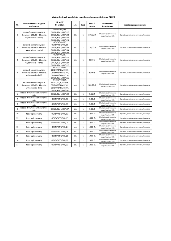Wykaz zbędnych składników majatku ruchomego - Gościniec OEIiZK Lp. Nazwa składnika majątku ruchomego 1 zestaw 5-elementowy (stół drewniany 120x80 + 4 krzesła, wybarwienie - olcha) 2 zestaw 5-elementowy (stół drewniany 130x80 + 4 krzesła, wybarwienie - olcha) 3 zestaw 5-elementowy (stół drewniany 120x80 + 4 krzesła, wybarwienie - olcha) 4 zestaw 5-elementowy (stół drewniany 130x80 + 4 krzesła, wybarwienie - buk) 5 zestaw 5-elementowy (stół drewniany 130x80 + 4 krzesła, wybarwienie - buk) 6 7 8 9 krzesło drewniane wybarwienie olcha krzesło drewniane wybarwienie olcha krzesło drewniane wybarwienie olcha krzesło drewniane wybarwienie olcha Nr serii/ Nr ewiden. J.m. Ilość Cena / sztuka Ocena stanu technicznego Sposób zagospodarowania szt. 1 110,00 zł Długi okres użytkowania, stopień zużycia 80% Sprzedaż, przekazanie darowizna, likwidacja szt. 1 120,00 zł Długi okres użytkowania, stopień zużycia 80% Sprzedaż, przekazanie darowizna, likwidacja szt. 1 90,00 zł Długi okres użytkowania, stopień zużycia 85% Sprzedaż, przekazanie darowizna, likwidacja szt. 1 80,00 zł Długi okres użytkowania, stopień zużycia 90% Sprzedaż, przekazanie darowizna, likwidacja szt. 1 100,00 zł Długi okres użytkowania, stopień zużycia 85% Sprzedaż, przekazanie darowizna, likwidacja OEIIZK/RZ/IL/VIII/109 szt. 1 5,00 zł Długi okres użytkowania, stopień zużycia 95% Sprzedaż, przekazanie darowizna, likwidacja OEIIZK/RZ/IL/VIII/97 szt. 1 5,00 zł Długi okres użytkowania, stopień zużycia 95% Sprzedaż, przekazanie darowizna, likwidacja OEIIZK/RZ/IL/VIII/99 szt. 1 5,00 zł Długi okres użytkowania, stopień zużycia 95% Sprzedaż, przekazanie darowizna, likwidacja 5,00 zł Długi okres użytkowania, stopień zużycia 95% Sprzedaż, przekazanie darowizna, likwidacja OEIIZK/VIII/188 OEIIZK/RZ/IL/VIII/117 OEIIZK/RZ/IL/VIII/120 OEIIZK/RZ/IL/VIII/125 OEIIZK/RZ/IL/VIII/126 OEIIZK/VIII/185 OEIIZK/RZ/IL/VIII/96 OEIIZK/RZ/IL/VIII/100 OEIIZK/RZ/IL/VIII/103 OEIIZK/RZ/IL/VIII/104 OEIIZK/VIII/187 OEIIZK/RZ/IL/VIII/112 OEIIZK/RZ/IL/VIII/116 OEIIZK/RZ/IL/VIII/124 OEIIZK/RZ/IL/VIII/127 OEIIZK/VIII/186, OEIIZK/RZ/IL/VIII/105, OEIIZK/RZ/IL/VIII/108, OEIIZK/RZ/IL/VIII/110, OEIIZK/RZ/IL/VIII/111 OEIIZK/VIII/184, OEIIZK/RZ/IL/VIII/98, OEIIZK/RZ/IL/VIII/102, OEIIZK/RZ/IL/VIII/106, OEIIZK/RZ/IL/VIII/101 OEIIZK/RZ/IL/VIII/107 szt. 1 10 fotel tapicerowany OEIIZK/RZ/IL/VIII/12 szt. 1 10,00 ZŁ 11 fotel tapicerowany OEIIZK/RZ/IL/VIII/19 szt. 1 10,00 ZŁ 12 fotel tapicerowany OEIIZK/RZ/IL/VIII/20 szt. 1 10,00 ZŁ 13 fotel tapicerowany OEIIZK/RZ/IL/VIII/24 szt. 1 10,00 ZŁ 14 fotel tapicerowany OEIIZK/RZ/IL/VIII/26 szt. 1 10,00 ZŁ 15 fotel tapicerowany OEIIZK/RZ/IL/VIII/28 szt. 1 10,00 ZŁ 16 fotel tapicerowany OEIIZK/RZ/IL/VIII/32 szt. 1 10,00 ZŁ 17 fotel tapicerowany OEIIZK/RZ/IL/VIII/33 szt. 1 10,00 ZŁ Długi okres użytkowania, stopień zużycia 95% Długi okres użytkowania, stopień zużycia 95% Długi okres użytkowania, stopień zużycia 95% Długi okres użytkowania, stopień zużycia 95% Długi okres użytkowania, stopień zużycia 95% Długi okres użytkowania, stopień zużycia 95% Długi okres użytkowania, stopień zużycia 95% Długi okres użytkowania, stopień zużycia 95% Sprzedaż, przekazanie darowizna, likwidacja Sprzedaż, przekazanie darowizna, likwidacja Sprzedaż, przekazanie darowizna, likwidacja Sprzedaż, przekazanie darowizna, likwidacja Sprzedaż, przekazanie darowizna, likwidacja Sprzedaż, przekazanie darowizna, likwidacja Sprzedaż, przekazanie darowizna, likwidacja Sprzedaż, przekazanie darowizna, likwidacja