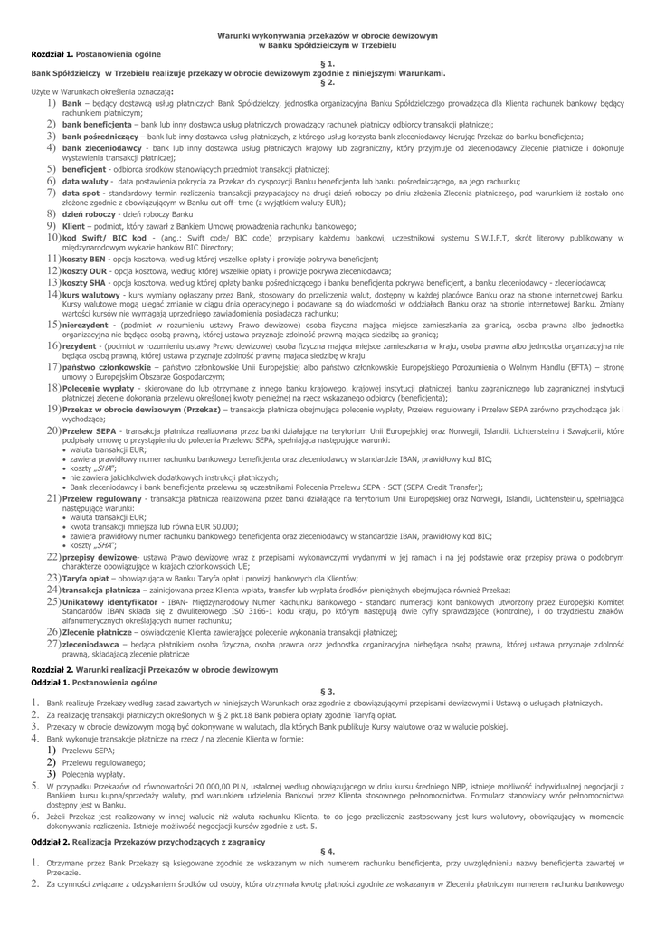 Rozdział 1. Postanowienia ogólne Warunki wykonywania przekazów w obrocie dewizowym w Banku Spółdzielczym w Trzebielu § 1. Bank Spółdzielczy w Trzebielu realizuje przekazy w obrocie dewizowym zgodnie z niniejszymi Warunkami. § 2. Użyte w Warunkach określenia oznaczają: 1) Bank – będący dostawcą usług płatniczych Bank Spółdzielczy, jednostka organizacyjna Banku Spółdzielczego prowadząca dla Klienta rachunek bankowy będący rachunkiem płatniczym; 2) 3) 4) bank beneficjenta – bank lub inny dostawca usług płatniczych prowadzący rachunek płatniczy odbiorcy transakcji płatniczej; 5) 6) 7) beneficjent - odbiorca środków stanowiących przedmiot transakcji płatniczej; bank pośredniczący – bank lub inny dostawca usług płatniczych, z którego usług korzysta bank zleceniodawcy kierując Przekaz do banku beneficjenta; bank zleceniodawcy - bank lub inny dostawca usług płatniczych krajowy lub zagraniczny, który przyjmuje od zleceniodawcy Zlecenie płatnicze i dokonuje wystawienia transakcji płatniczej; data waluty - data postawienia pokrycia za Przekaz do dyspozycji Banku beneficjenta lub banku pośredniczącego, na jego rachunku; data spot - standardowy termin rozliczenia transakcji przypadający na drugi dzień roboczy po dniu złożenia Zlecenia płatniczego, pod warunkiem iż zostało ono złożone zgodnie z obowiązującym w Banku cut-off- time (z wyjątkiem waluty EUR); 8) dzień roboczy - dzień roboczy Banku 9) Klient – podmiot, który zawarł z Bankiem Umowę prowadzenia rachunku bankowego; 10) kod Swift/ BIC kod - (ang.: Swift code/ BIC code) przypisany każdemu bankowi, uczestnikowi systemu S.W.I.F.T, skrót literowy publikowany w międzynarodowym wykazie banków BIC Directory; 11) koszty BEN - opcja kosztowa, według której wszelkie opłaty i prowizje pokrywa beneficjent; 12) koszty OUR - opcja kosztowa, według której wszelkie opłaty i prowizje pokrywa zleceniodawca; 13) koszty SHA - opcja kosztowa, według której opłaty banku pośredniczącego i banku beneficjenta pokrywa beneficjent, a banku zleceniodawcy - zleceniodawca; 14) kurs walutowy - kurs wymiany ogłaszany przez Bank, stosowany do przeliczenia walut, dostępny w każdej placówce Banku oraz na stronie internetowej Banku. Kursy walutowe mogą ulegać zmianie w ciągu dnia operacyjnego i podawane są do wiadomości w oddziałach Banku oraz na stronie internetowej Banku. Zmiany wartości kursów nie wymagają uprzedniego zawiadomienia posiadacza rachunku; 15) nierezydent - (podmiot w rozumieniu ustawy Prawo dewizowe) osoba fizyczna mająca miejsce zamieszkania za granicą, osoba prawna albo jednostka organizacyjna nie będąca osobą prawną, której ustawa przyznaje zdolność prawną mająca siedzibę za granicą; 16) rezydent - (podmiot w rozumieniu ustawy Prawo dewizowe) osoba fizyczna mająca miejsce zamieszkania w kraju, osoba prawna albo jednostka organizacyjna nie będąca osobą prawną, której ustawa przyznaje zdolność prawną mająca siedzibę w kraju 17) państwo członkowskie – państwo członkowskie Unii Europejskiej albo państwo członkowskie Europejskiego Porozumienia o Wolnym Handlu (EFTA) – stronę umowy o Europejskim Obszarze Gospodarczym; 18) Polecenie wypłaty - skierowane do lub otrzymane z innego banku krajowego, krajowej instytucji płatniczej, banku zagranicznego lub zagranicznej instytucji płatniczej zlecenie dokonania przelewu określonej kwoty pieniężnej na rzecz wskazanego odbiorcy (beneficjenta); 19) Przekaz w obrocie dewizowym (Przekaz) – transakcja płatnicza obejmująca polecenie wypłaty, Przelew regulowany i Przelew SEPA zarówno przychodzące jak i wychodzące; 20) Przelew SEPA - transakcja płatnicza realizowana przez banki działające na terytorium Unii Europejskiej oraz Norwegii, Islandii, Lichtensteinu i Szwajcarii, które podpisały umowę o przystąpieniu do polecenia Przelewu SEPA, spełniająca następujące warunki: waluta transakcji EUR; zawiera prawidłowy numer rachunku bankowego beneficjenta oraz zleceniodawcy w standardzie IBAN, prawidłowy kod BIC; koszty „SHA”; nie zawiera jakichkolwiek dodatkowych instrukcji płatniczych; Bank zleceniodawcy i bank beneficjenta przelewu są uczestnikami Polecenia Przelewu SEPA - SCT (SEPA Credit Transfer); 21) Przelew regulowany - transakcja płatnicza realizowana przez banki działające na terytorium Unii Europejskiej oraz Norwegii, Islandii, Lichtensteinu, spełniająca następujące warunki: waluta transakcji EUR; kwota transakcji mniejsza lub równa EUR 50.000; zawiera prawidłowy numer rachunku bankowego beneficjenta oraz zleceniodawcy w standardzie IBAN, prawidłowy kod BIC; koszty „SHA”; 22) przepisy dewizowe- ustawa Prawo dewizowe wraz z przepisami wykonawczymi wydanymi w jej ramach i na jej podstawie oraz przepisy prawa o podobnym charakterze obowiązujące w krajach członkowskich UE; 23) Taryfa opłat – obowiązująca w Banku Taryfa opłat i prowizji bankowych dla Klientów; 24) transakcja płatnicza – zainicjowana przez Klienta wpłata, transfer lub wypłata środków pieniężnych obejmująca również Przekaz; 25) Unikatowy identyfikator - IBAN- Międzynarodowy Numer Rachunku Bankowego - standard numeracji kont bankowych utworzony przez Europejski Komitet Standardów IBAN składa się z dwuliterowego ISO 3166-1 kodu kraju, po którym następują dwie cyfry sprawdzające (kontrolne), i do trzydziestu znaków alfanumerycznych określających numer rachunku; 26) Zlecenie płatnicze – oświadczenie Klienta zawierające polecenie wykonania transakcji płatniczej; 27) zleceniodawca – będąca płatnikiem osoba fizyczna, osoba prawna oraz jednostka organizacyjna niebędąca osobą prawną, której ustawa przyznaje z dolność prawną, składającą zlecenie płatnicze Rozdział 2. Warunki realizacji Przekazów w obrocie dewizowym Oddział 1. Postanowienia ogólne 1. 2. 3. 4. § 3. Bank realizuje Przekazy według zasad zawartych w niniejszych Warunkach oraz z