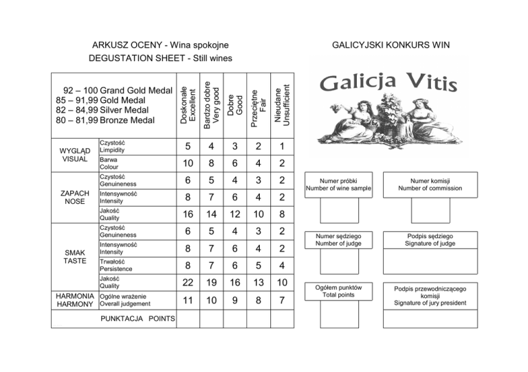 92 – 100 Grand Gold Medal 85 – 91,99 Gold Medal 82 – 84,99 Silver Medal 80 – 81,99 Bronze Medal Bardzo dobre Very good Dobre Good Przeciętne Fair Nieudane Unsufficient GALICYJSKI KONKURS WIN Doskonałe Excellent ARKUSZ OCENY - Wina spokojne DEGUSTATION SHEET - Still wines Czystość Limpidity 5 4 3 2 1 WYGLĄD VISUAL ZAPACH NOSE Barwa Colour 10 8 6 4 2 Czystość Genuineness 6 5 4 3 2 Intensywność Intensity 8 7 6 4 2 16 14 12 10 8 Czystość Genuineness 6 5 4 3 2 Intensywność Intensity 8 7 6 4 2 Trwałość Persistence 8 7 6 5 4 22 19 16 13 10 11 10 9 8 7 Jakość Quality SMAK TASTE Jakość Quality HARMONIA Ogólne wrażenie HARMONY Overall judgement PUNKTACJA POINTS WiR 2014 Numer próbki Number of wine sample Numer komisji Number of commission Numer sędziego Number of judge Podpis sędziego Signature of judge Ogółem punktów Total points Podpis przewodniczącego komisji Signature of jury president