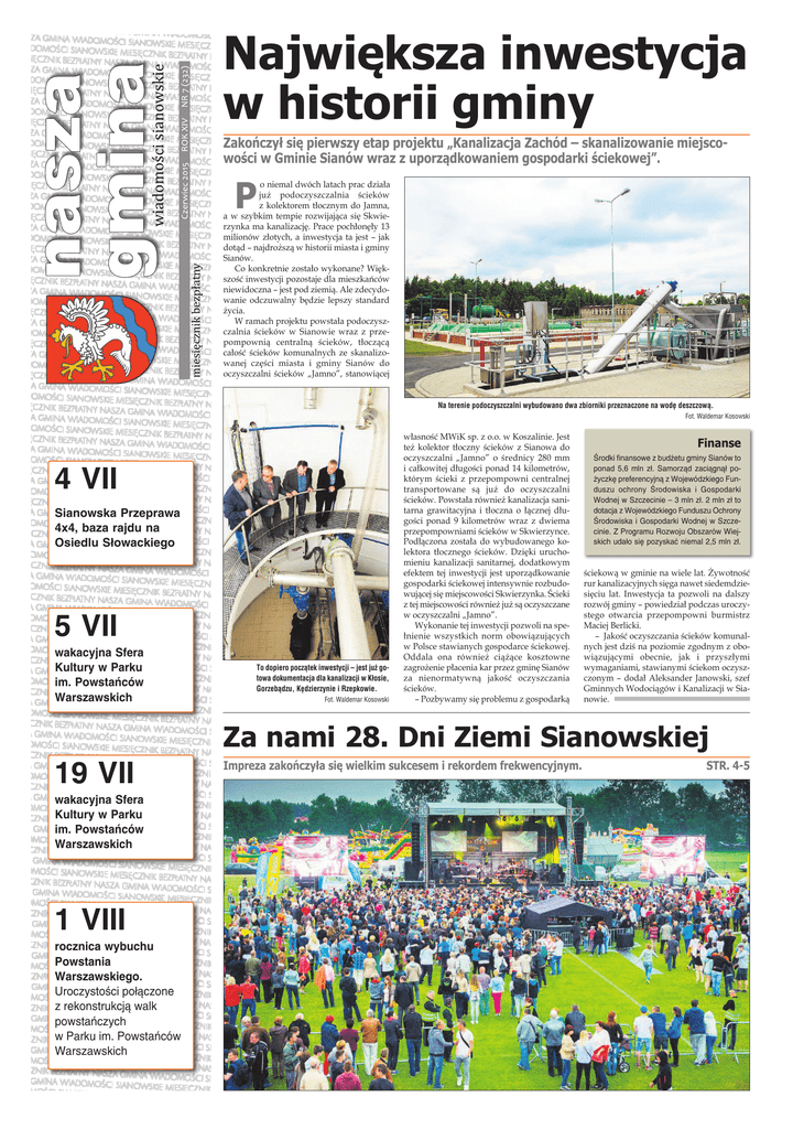Największa inwestycja w historii gminy Zakończył się pierwszy etap projektu „Kanalizacja Zachód – skanalizowanie miejscowości w Gminie Sianów wraz z uporządkowaniem gospodarki ściekowej”. P o niemal dwóch latach prac działa już podoczyszczalnia ścieków z kolektorem tłocznym do Jamna, a w szybkim tempie rozwijająca się Skwierzynka ma kanalizację. Prace pochłonęły 13 milionów złotych, a inwestycja ta jest – jak dotąd – najdroższą w historii miasta i gminy Sianów. Co konkretnie zostało wykonane? Większość inwestycji pozostaje dla mieszkańców niewidoczna – jest pod ziemią. Ale zdecydowanie odczuwalny będzie lepszy standard życia. W ramach projektu powstała podoczyszczalnia ścieków w Sianowie wraz z przepompownią centralną ścieków, tłoczącą całość ścieków komunalnych ze skanalizowanej części miasta i gminy Sianów do oczyszczalni ścieków „Jamno”, stanowiącej Na terenie podoczyszczalni wybudowano dwa zbiorniki przeznaczone na wodę deszczową. Fot. Waldemar Kosowski 4 VII Sianowska Przeprawa 4x4, baza rajdu na Osiedlu Słowackiego 5 VII wakacyjna Sfera Kultury w Parku im. Powstańców Warszawskich To dopiero początek inwestycji – jest już gotowa dokumentacja dla kanalizacji w Kłosie, Gorzebądzu, Kędzierzynie i Rzepkowie. Fot. Waldemar Kosowski własność MWiK sp. z o.o. w Koszalinie. Jest też kolektor tłoczny ścieków z Sianowa do oczyszczalni „Jamno” o średnicy 280 mm i całkowitej długości ponad 14 kilometrów, którym ścieki z przepompowni centralnej transportowane są już do oczyszczalni ścieków. Powstała również kanalizacja sanitarna grawitacyjna i tłoczna o łącznej długości ponad 9 kilometrów wraz z dwiema przepompowniami ścieków w Skwierzynce. Podłączona została do wybudowanego kolektora tłocznego ścieków. Dzięki uruchomieniu kanalizacji sanitarnej, dodatkowym efektem tej inwestycji jest uporządkowanie gospodarki ściekowej intensywnie rozbudowującej się miejscowości Skwierzynka. Ścieki z tej miejscowości również już są oczyszczane w oczyszczalni „Jamno”. Wykonanie tej inwestycji pozwoli na spełnienie wszystkich norm obowiązujących w Polsce stawianych gospodarce ściekowej. Oddala ona również ciążące kosztowne zagrożenie płacenia kar przez gminę Sianów za nienormatywną jakość oczyszczania ścieków. – Pozbywamy się problemu z gospodarką Finanse Środki finansowe z budżetu gminy Sianów to ponad 5,6 mln zł. Samorząd zaciągnął pożyczkę preferencyjną z Wojewódzkiego Funduszu ochrony Środowiska i Gospodarki Wodnej w Szczecinie – 3 mln zł. 2 mln zł to dotacja z Wojewódzkiego Funduszu Ochrony Środowiska i Gospodarki Wodnej w Szczecinie. Z Programu Rozwoju Obszarów Wiejskich udało się pozyskać niemal 2,5 mln zł. ściekową w gminie na wiele lat. Żywotność rur kanalizacyjnych sięga nawet siedemdziesięciu lat. Inwestycja ta pozwoli na dalszy rozwój gminy – powiedział podczas uroczystego otwarcia przepompowni burmistrz Maciej Berlicki. – Jakość oczyszczania ścieków komunalnych jest dziś na poziomie zgodnym z obowiązującymi obecnie, jak i przyszłymi wymaganiami, stawianymi ściekom oczyszczonym – dodał Aleksander Janowski, szef Gminnych Wodociągów i Kanalizacji w Sianowie. Za nami 28. Dni Ziemi Sianowskiej 19 VII wakacyjna Sfera Kultury w Parku im. Powstańców Warszawskich 1 VIII rocznica wybuchu Powstania Warszawskiego. Uroczystości połączone z rekonstrukcją walk powstańczych w Parku im. Powstańców Warszawskich Impreza zakończyła się wielkim sukcesem i rekordem frekwencyjnym. Str. 4-5 2 Czerwiec 2015 Rok XIV nr 7 (232) WyDarZeNIa Z ratuSZa Lato, lato, lato czeka...! www.sianow.pl b Ćwierć wieku samorządu 2 czerwca w hali widowisko-sportowej przy Szkole Podstawowej nr 2 w Sianowie odbyła się uroczystość z okazji 25-lecia polskiej samorządności. K oniec roku szkolnego to jak zwykle czas podsumowań, szczególnie dla młodych osób – uczniów, studentów. Po roku nauki wszystkim należy się trochę relaksu, odpoczynku. Wiem, że nie wszyscy idealnie przepracowali rok szkolny, ale to możemy już zostawić indywidualnym ocenom. Gmina od kilku lat stara się w lipcu i sierpniu przygotować ofertę wypoczynku dla osób młodych. Nie inaczej jest w tym roku, wyjazdy szlakami polskich zamków, półkolonie – to oferta, którą możemy się pochwalić dzięki świetnej współpracy z naszymi organizacjami pozarządowymi. Na miejscu pełna ofertę przygotowało nasze Centrum Kultury – zajęcia tematyczne tak w centrum, jak i w filiach bibliotecznych i świetlicach. Będzie wiele seansów w Kinie Zorza. Po raz kolejny w naszej gminie organizujemy więcej, niż w innych samorządach. Wakacje są jednak również dla dorosłych, więc kolejny raz w lipcu zapraszamy na Sferę Kultury w sianowskim parku, a w sierpniu na dużą uroczystość związana z kolejną rocznicą wybuchu Powstania Warszawskiego (w końcu nazwa parku zobowiązuje), a po dwóch tygodniach na drugi już Folk Film Festiwal. Wakacje zakończymy Dożynkami Gminnymi w Bielkowie. Jeśli dodamy do tego wiele imprez w sołectwach, wszystko wygląda imponująco. Wiem, że są głosy „po co to wszystko?”. Przede wszystkim dla każdego mieszkańca naszej gminy. Oderwijmy się od komputerów, telewizorów, nie zawsze jest też pora na plażę. Spędźcie ten czas z nami, zapraszamy! Naprawdę warto :). Nasza Gmina Wydawca: UGiM w Sianowie Redaguje: BESO-MEDIA www.sianow.pl e-mail: promocjaĂsianow.pl Druk: Media Regionalne Urząd Gminy i Miasta w Sianowie 94 318 52 81 (Sekretariat), 94 318 68 18 (Biuro Obsługi Interesantów). Gminny Punkt Informacji dla Osób Niepełnosprawnych Sianów, ul. Słowackiego 3a, tel. 94 318 55 12 niepelnosprawniĂsianow.pl Na spotkaniu pojawili się m.in. byli burmistrzowie, ich zastępcy oraz radni wszystkich kadencji. Fot. Waldemar Kosowski S potkanie rozpoczął specjalnie przygotowany film, w który