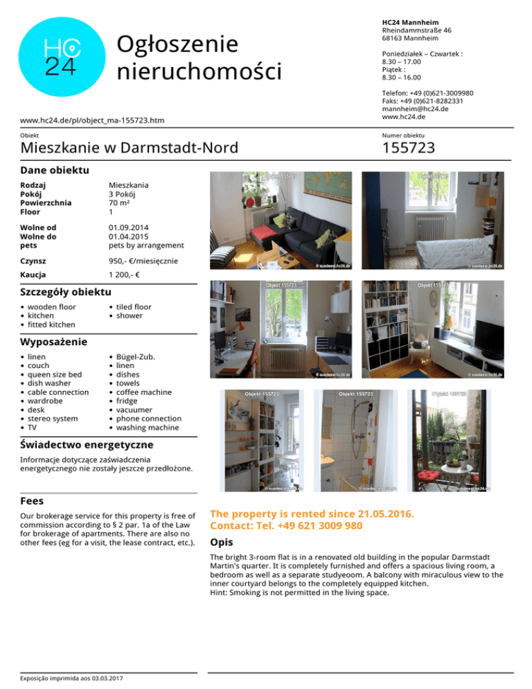 Ogłoszenie nieruchomości HC24 Mannheim Rheindammstraße 46 68163 Mannheim Poniedziałek – Czwartek : 8.30 – 17.00 Piątek : 8.30 – 16.00 Telefon: +49 (0)621-3009980 Faks: +49 (0)621-8282331 [email protected] www.hc24.de www.hc24.de/pl/object_ma-155723.htm Obiekt Numer obiektu Mieszkanie w Darmstadt-Nord 155723 Dane obiektu Rodzaj Pokój Powierzchnia Floor Mieszkania 3 Pokój 70 m² 1 Wolne od Wolne do pets 01.09.2014 01.04.2015 pets by arrangement Czynsz 950,- €/miesięcznie Kaucja 1 200,- € Szczegóły obiektu wooden floor kitchen fitted kitchen tiled floor shower Wyposażenie linen couch queen size bed dish washer cable connection wardrobe desk stereo system TV Bügel-Zub. linen dishes towels coffee machine fridge vacuumer phone connection washing machine Świadectwo energetyczne Informacje dotyczące zaświadczenia energetycznego nie zostały jeszcze przedłożone. Fees Our brokerage service for this property is free of commission according to § 2 par. 1a of the Law for brokerage of apartments. There are also no other fees (eg for a visit, the lease contract, etc.). The property is rented since 21.05.2016. Contact: Tel. +49 621 3009 980 Opis The bright 3-room flat is in a renovated old building in the popular Darmstadt Martin's quarter. It is completely furnished and offers a spacious living room, a bedroom as well as a separate studyeoom. A balcony with miraculous view to the inner courtyard belongs to the completely equipped kitchen. Hint: Smoking is not permitted in the living space. Exposição imprimida aos 03.03.2017 Powered by TCPDF (www.tcpdf.org)