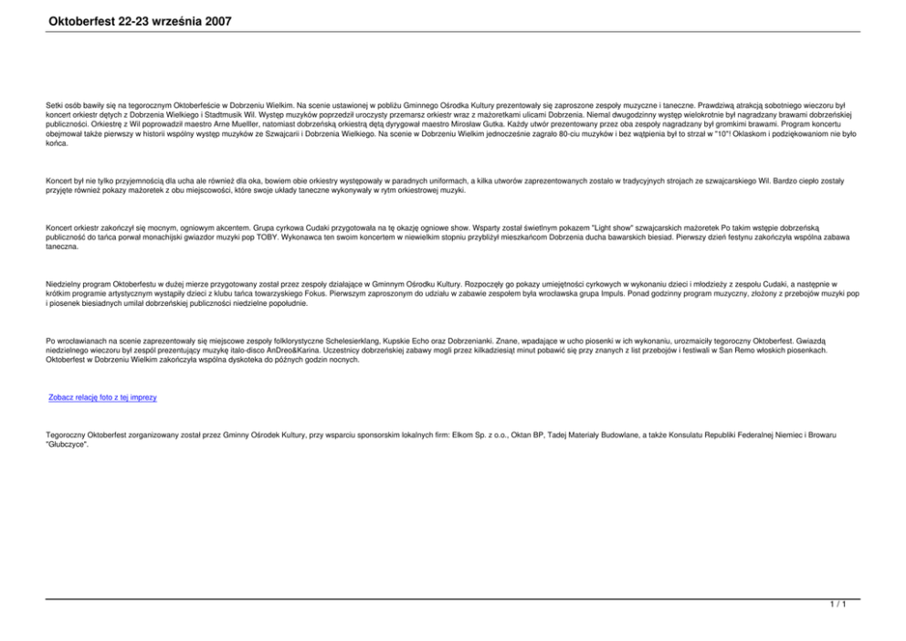 Oktoberfest 22-23 września 2007 Setki osób bawiły się na tegorocznym Oktoberfeście w Dobrzeniu Wielkim. Na scenie ustawionej w pobliżu Gminnego Ośrodka Kultury prezentowały się zaproszone zespoły muzyczne i taneczne. Prawdziwą atrakcją sobotniego wieczoru był koncert orkiestr dętych z Dobrzenia Wielkiego i Stadtmusik Wil. Występ muzyków poprzedził uroczysty przemarsz orkiestr wraz z mażoretkami ulicami Dobrzenia. Niemal dwugodzinny występ wielokrotnie był nagradzany brawami dobrzeńskiej publiczności. Orkiestrę z Wil poprowadził maestro Arne Muelller, natomiast dobrzeńską orkiestrą dętą dyrygował maestro Mirosław Gutka. Każdy utwór prezentowany przez oba zespoły nagradzany był gromkimi brawami. Program koncertu obejmował także pierwszy w historii wspólny występ muzyków ze Szwajcarii i Dobrzenia Wielkiego. Na scenie w Dobrzeniu Wielkim jednocześnie zagrało 80-ciu muzyków i bez wątpienia był to strzał w "10"! Oklaskom i podziękowaniom nie było końca. Koncert był nie tylko przyjemnością dla ucha ale również dla oka, bowiem obie orkiestry występowały w paradnych uniformach, a kilka utworów zaprezentowanych zostało w tradycyjnych strojach ze szwajcarskiego Wil. Bardzo ciepło zostały przyjęte również pokazy mażoretek z obu miejscowości, które swoje układy taneczne wykonywały w rytm orkiestrowej muzyki. Koncert orkiestr zakończył się mocnym, ogniowym akcentem. Grupa cyrkowa Cudaki przygotowała na tę okazję ogniowe show. Wsparty został świetlnym pokazem "Light show" szwajcarskich mażoretek Po takim wstępie dobrzeńską publiczność do tańca porwał monachijski gwiazdor muzyki pop TOBY. Wykonawca ten swoim koncertem w niewielkim stopniu przybliżył mieszkańcom Dobrzenia ducha bawarskich biesiad. Pierwszy dzień festynu zakończyła wspólna zabawa taneczna. Niedzielny program Oktoberfestu w dużej mierze przygotowany został przez zespoły działające w Gminnym Ośrodku Kultury. Rozpoczęły go pokazy umiejętności cyrkowych w wykonaniu dzieci i młodzieży z zespołu Cudaki, a następnie w krótkim programie artystycznym wystąpiły dzieci z klubu tańca towarzyskiego Fokus. Pierwszym zaproszonym do udziału w zabawie zespołem była wrocławska grupa Impuls. Ponad godzinny program muzyczny, złożony z przebojów muzyki pop i piosenek biesiadnych umilał dobrzeńskiej publiczności niedzielne popołudnie. Po wrocławianach na scenie zaprezentowały się miejscowe zespoły folklorystyczne Schelesierklang, Kupskie Echo oraz Dobrzenianki. Znane, wpadające w ucho piosenki w ich wykonaniu, urozmaiciły tegoroczny Oktoberfest. Gwiazdą niedzielnego wieczoru był zespól prezentujący muzykę italo-disco AnDreo&Karina. Uczestnicy dobrzeńskiej zabawy mogli przez kilkadziesiąt minut pobawić się przy znanych z list przebojów i festiwali w San Remo włoskich piosenkach. Oktoberfest w Dobrzeniu Wielkim zakończyła wspólna dyskoteka do późnych godzin nocnych. Zobacz relację foto z tej imprezy Tegoroczny Oktoberfest zorganizowany został przez Gminny Ośrodek Kultury, przy wsparciu sponsorskim lokalnych firm: Elkom Sp. z o.o., Oktan BP, Tadej Materiały Budowlane, a także Konsulatu Republiki Federalnej Niemiec i Browaru "Głubczyce". 1/1