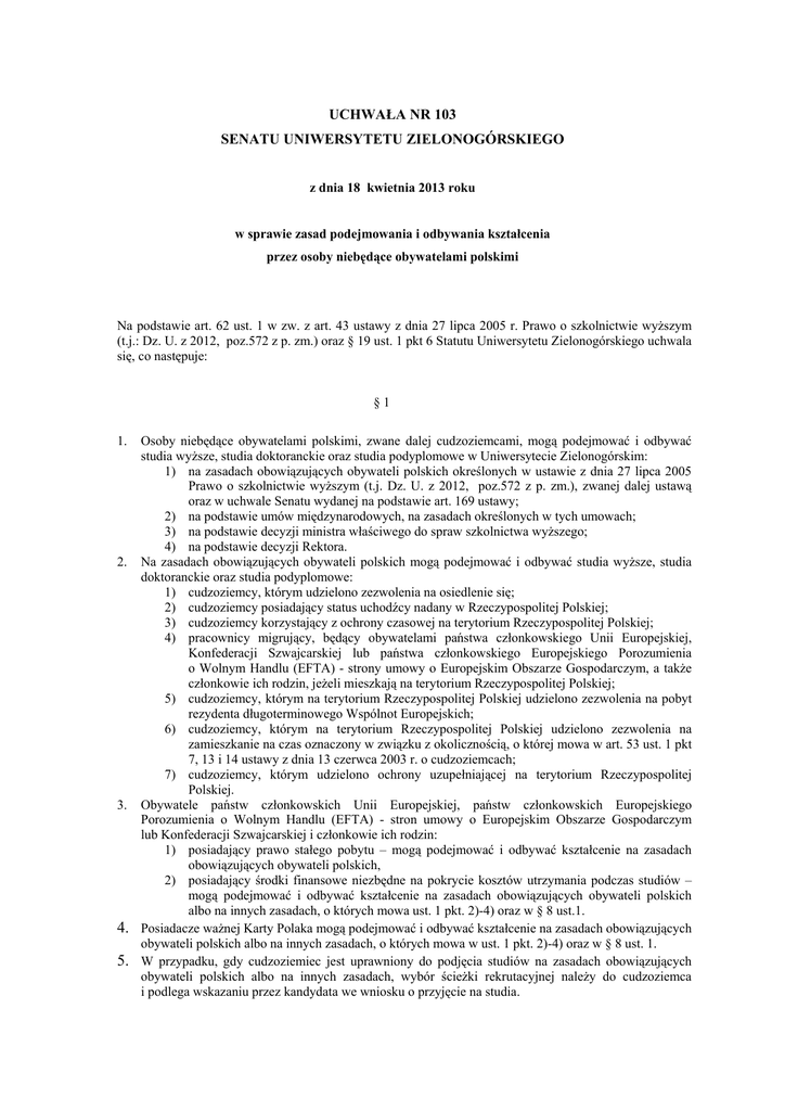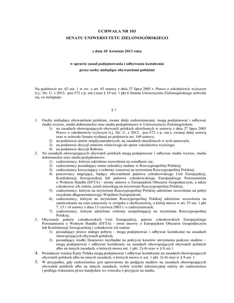 UCHWAŁA NR 103 SENATU UNIWERSYTETU ZIELONOGÓRSKIEGO z dnia 18 kwietnia 2013 roku w sprawie zasad podejmowania i odbywania kształcenia przez osoby niebędące obywatelami polskimi Na podstawie art. 62 ust. 1 w zw. z art. 43 ustawy z dnia 27 lipca 2005 r. Prawo o szkolnictwie wyższym (t.j.: Dz. U. z 2012, poz.572 z p. zm.) oraz § 19 ust. 1 pkt 6 Statutu Uniwersytetu Zielonogórskiego uchwala się, co następuje: §1 1. Osoby niebędące obywatelami polskimi, zwane dalej cudzoziemcami, mogą podejmować i odbywać studia wyższe, studia doktoranckie oraz studia podyplomowe w Uniwersytecie Zielonogórskim: 1) na zasadach obowiązujących obywateli polskich określonych w ustawie z dnia 27 lipca 2005 Prawo o szkolnictwie wyższym (t.j. Dz. U. z 2012, poz.572 z p. zm.), zwanej dalej ustawą oraz w uchwale Senatu wydanej na podstawie art. 169 ustawy; 2) na podstawie umów międzynarodowych, na zasadach określonych w tych umowach; 3) na podstawie decyzji ministra właściwego do spraw szkolnictwa wyższego; 4) na podstawie decyzji Rektora. 2. Na zasadach obowiązujących obywateli polskich mogą podejmować i odbywać studia wyższe, studia doktoranckie oraz studia podyplomowe: 1) cudzoziemcy, którym udzielono zezwolenia na osiedlenie się; 2) cudzoziemcy posiadający status uchodźcy nadany w Rzeczypospolitej Polskiej; 3) cudzoziemcy korzystający z ochrony czasowej na terytorium Rzeczypospolitej Polskiej; 4) pracownicy migrujący, będący obywatelami państwa członkowskiego Unii Europejskiej, Konfederacji Szwajcarskiej lub państwa członkowskiego Europejskiego Porozumienia o Wolnym Handlu (EFTA) - strony umowy o Europejskim Obszarze Gospodarczym, a także członkowie ich rodzin, jeżeli mieszkają na terytorium Rzeczypospolitej Polskiej; 5) cudzoziemcy, którym na terytorium Rzeczypospolitej Polskiej udzielono zezwolenia na pobyt rezydenta długoterminowego Wspólnot Europejskich; 6) cudzoziemcy, którym na terytorium Rzeczypospolitej Polskiej udzielono zezwolenia na zamieszkanie na czas oznaczony w związku z okolicznością, o której mowa w art. 53 ust. 1 pkt 7, 13 i 14 ustawy z dnia 13 czerwca 2003 r. o cudzoziemcach; 7) cudzoziemcy, którym udzielono ochrony uzupełniającej na terytorium Rzeczypospolitej Polskiej. 3. Obywatele państw członkowskich Unii Europejskiej, państw członkowskich Europejskiego Porozumienia o Wolnym Handlu (EFTA) - stron umowy o Europejskim Obszarze Gospodarczym lub Konfederacji Szwajcarskiej i członkowie ich rodzin: 1) posiadający prawo stałego pobytu – mogą podejmować i odbywać kształcenie na zasadach obowiązujących obywateli polskich, 2) posiadający środki finansowe niezbędne na pokrycie kosztów utrzymania podczas studiów – mogą podejmować i odbywać kształcenie na zasadach obowiązujących obywateli polskich albo na innych zasadach, o których mowa ust. 1 pkt. 2)-4) oraz w § 8 ust.1. 4. Posiadacze ważnej Karty Polaka mogą podejmować i odbywać kształcenie na zasadach obowiązujących obywateli polskich albo na innych zasadach, o których mowa w ust. 1 pkt. 2)-4) oraz w § 8 ust. 1. 5. W przypadku, gdy cudzoziemiec jest uprawniony do podjęcia studiów na zasadach obowiązujących obywateli polskich albo na innych zasadach, wybór ścieżki rekrutacyjnej należy do cudzoziemca i podlega wskazaniu przez kandydata we wniosku o przyjęcie na studia. 6. 7. Osoby posiadające kilka obywatelstw, w tym polskie, mogą podejmować i odbywać studia wyższe, studia doktoranckie oraz studia podyplomowe wyłącznie na zasadach obowiązujących obywateli polskich. Ilekroć w uchwale jest mowa o „studiach” bez bliższego określenia, rozumie się przez to studia wyższe, studia doktoranckie i studia podyplomowe. §2 1. 2. Cudzoziemcy mogą być przyjmowani na studia wyższe, studia doktoranckie oraz studia podyplomowe, jeżeli: 1) posiadają wizę lub kartę pobytu albo inny dokument uprawniający do pobytu na terytorium RP, 2) wykazują się dobrym stanem zdrowia, udokumentowanym zaświadczeniem lekarskim, stwierdzającym brak przeciwwskazań do podjęcia kształcenia na obranym kierunku i formie kształcenia, 3) posiadają polisę ubezpieczeniową na wypadek choroby lub następstw nieszczęśliwych wypadków na okres kształcenia w Polsce, albo Europejską Kartę Ubezpieczenia Zdrowotnego, lub przystąpią do ubezpieczenia w Narodowym Funduszu Zdrowia niezwłocznie po rozpoczęciu studiów. Cudzoziemcy mogą być przyjmowani na studia wyższe, studia doktoranckie oraz studia podyplomowe prowadzone w języku polskim, jeżeli: 1) ukończą roczny kurs przygotowawczy do podjęcia nauki w języku polskim w jednostkach wyznaczonych przez ministra właściwego do spraw szkolnictwa wyższego lub, 2) posiadają certyfikat znajomości języka polskiego wydany przez Państwową Komisję Poświadczania Znajomości Języka Polskiego jako Obcego lub, 3) uzyskają potwierdzenie przez wydziałową komisję rekrutacyjną wydziału prowadzącego studia w języku polskim, że ich przygotowanie oraz stopień znajomości języka polskiego pozwala na podjęcie studiów w języku polskim. §3 1. 2. 3. O przyjęcie na studia pierwszego stopnia lub jednolite studia magisterskie mogą ubiegać się cudzoziemcy, którzy legitymują się: 1) polskim świadectwem dojrzałości albo, 2) zalegalizowanym lub opatrzonym apostille świadectwem lub innym dokumentem uzyskanym za granicą, uprawniającym do ubiegania się o przyjęcie na studia w uczelniach każdego typu w państwie, w którego systemie działała instytucja wydająca świadectwo, uznanym za równoważny odpowiedniemu polskiemu świadectwu dojrzałości, zgodnie z przepisami w sprawie nostryfikacji świadectw szkolnych i świadectw maturalnych uzyskanych za granicą, albo uznanym, na podstawie umowy międzynarodowej, za równoważny odpowiedniemu polskiemu świadectwu dojrzałości lub za uprawniający do podjęcia takich studiów w Rzeczypospolitej Polskiej, 3) wykażą wymagane szczególne predysp