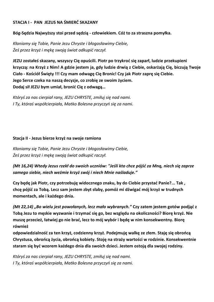 STACJA I - PAN JEZUS NA ŚMIERĆ SKAZANY Bóg-Sędzia Najwyższy stoi przed sędzią - człowiekiem. Cóż to za straszna pomyłka. Kłaniamy się Tobie, Panie Jezu Chryste i błogosławimy Ciebie, Żeś przez krzyż i mękę swoją świat odkupić raczył. JEZU zostałeś skazany, wszyscy Cię opuścili. Piotr po trzykroć się zaparł, ludzie przekupieni krzyczą: na Krzyż z Nim! A gdzie jestem ja, gdy ludzie drwią z Ciebie, oskarżają Cię, biczują Twoje Ciało - Kościół Święty !!! Czy mam odwagę Cię Bronic! Czy jak Piotr zaprę się Ciebie. Jego Serce czeka na naszą decyzje, co zrobię ze swoim życiem. Dodaj sił JEZU bym umiał, bronić Cię z odwagą… Któryś za nas cierpiał rany, JEZU CHRYSTE, zmiłuj się nad nami. I Ty, któraś współcierpiała, Matko Bolesna przyczyń się za nami. Stacja II - Jezus bierze krzyż na swoje ramiona Kłaniamy się Tobie, Panie Jezu Chryste i błogosławimy Ciebie, Żeś przez krzyż i mękę swoją świat odkupić raczył. (Mt 16,24) Wtedy Jezus rzekł do swoich uczniów: "Jeśli kto chce pójść za Mną, niech się zaprze samego siebie, niech weźmie krzyż swój i niech Mnie naśladuje.” Czy będę jak Piotr, czy potrzebuję widocznego znaku, by do Ciebie przystać Panie?... Tak , chcę pójść za Tobą. Lecz sam jestem zbyt słaby, pomóż mi dźwigać mój krzyż w trudnych momentach, ale i każdego dnia. (Mt 22,14) „Bo wielu jest powołanych, lecz mało wybranych.” Czy zatem jestem gotów podjąć z Tobą Jezu to męskie wyzwanie i trzymać się go, bez względu na okoliczności? Biorę krzyż. Nie muszę przecież, łatwiej go nie brać, lecz to mój wybór i będę w nim konsekwentny. Biorę również odpowiedzialność za ten krzyż, codzienny krzyż. Podejmuję walkę ze złem. Staję się obrońcą Chrystusa, obrońcą życia, obrońcą kobiety. Stoję na straży wartości w rodzinie. Konsekwentnie staram się być wzorem każdego dnia dla swoich dzieci. Jestem ostoją dla swojej rodziny. Któryś za nas cierpiał rany, JEZU CHRYSTE, zmiłuj się nad nami. I Ty, któraś współcierpiała, Matko Bolesna przyczyń się za nami. STACJA III - JEZUS UPADA POD KRZYŻEM Kłaniamy się Tobie, Panie Jezu Chryste i błogosławimy Ciebie, Żeś przez krzyż i mękę swoją świat odkupić raczył. Jezus upada pod ciężarem krzyża. My w naszym życiu upadamy pod ciężarem naszych własnych krzyży: słabości, grzechów, choroby, nieszczęśliwego wypadku. Ważne by tak jak Jezus powstać i iść dalej. By odnaleźć siłę w upadku. Któryś za nas cierpiał rany, JEZU CHRYSTE, zmiłuj się nad nami. I Ty, któraś współcierpiała, Matko Bolesna przyczyń się za nami. Stacja IV – Spotkanie z Matką Kłaniamy się Tobie, Panie Jezu Chryste i błogosławimy Ciebie, Żeś przez krzyż i mękę swoją świat odkupić raczył. Jezus Chrystus patrzy w oczy swojej Matce, bo jest wierny Prawdzie do końca. Ta, która wspólnie ze Świętym Józefem Go wychowała rozumie, że to cierpienie ma sens, rozumie, że tak trzeba, bo takie są zasady życia w Prawdzie. W tym spotkaniu Syn Boży pokazuje nam, jak mężczyzna ma być wierny zasadom i wartościom, które uważa za prawdziwe. I że wprowadzenie do życia w tej prawdzie muszą dać rodzice, poprzez wychowanie syna do wierności jednolitemu systemowi niezmiennych wartości, które pochodzą od Boga. Ta stacja mówi nam o naszych korzeniach rodzinnych. Najświętsza Maryja Panna jest wzorem macierzyńskiej miłości, podobnie jak Św. Józef był symbolem ojcowskiej siły ducha. Tylko na takim zdrowym fundamencie rodziny może wyrosnąć dobrze uformowany człowiek, tylko wychowanie w takiej rodzinie jest zdrowe i daje mężczyźnie prawdziwą męskość. Ilu jest ojców zbuntowanych i aroganckich, walczących z własną żoną, z własną rodziną, zamiast się nimi opiekować? – jak często ich synowie stają się naśladowcami tych zachowań i sami krzywdzą kobiety i dzieci. Ilu jest ojców wycofanych, zmuszających swoje żony do brania całego ciężaru odpowiedzialności za wychowanie synów? – ich synowie są słabi, łatwo wchodzą w uzależnienia, gubią swoją tożsamość, nieraz tak bardzo, że toną w chorobie homoseksualizmu. Niech to spotkanie z Matką naszego Pana Jezusa Chrystusa nam przypomina, że jeśli chcemy, aby nasze relacje z rodzicami czy z dziećmi, w obliczu ich lub naszej śmierci, w obliczu przekroczenia progu wieczności, były do końca prawdziwe i pełne miłości, a życie uwolnione od ciężaru nierozwiązanych konfliktów, musimy dołożyć wszelkich starań, aby ostatecznie uporządkować te relacje i wzajemnie wszystko sobie wybaczyć. Któryś za nas cierpiał rany, JEZU CHRYSTE, zmiłuj się nad nami. I Ty, któraś współcierpiała, Matko Bolesna przyczyń się za nami. STACJA V - SZYMON Z CYRENY POMAGA NIEŚĆ KRZYŻ JEZUSOWI Kłaniamy się Tobie, Panie Jezu Chryste i błogosławimy Ciebie, Żeś przez krzyż i mękę swoją świat odkupić raczył. Jeśli kto chce iść za Mną, niech weźmie krzyż swój i niech pójdzie za Mną. Tyle teoria. A praktyka? I przymusili niejakiego Szymona z Cyreny, żeby niósł krzyż Jego. A wszyscy stali z boku. Biedny Szymon, wpadł, miał pecha. Dobrze, że nie ja. Ja mam pracę, dom, rodzinę, obowiązki, plany. On nie ma nic do stracenia, to tylko rolnik. On może niosącemu krzyż pomóc. Zresztą on się bardziej nadaje, ja jestem za słaby. Jak wygląda moja męska Droga Krzyżowa z Jezusem? Czy nie tak, że to Szymon pomaga Mu nieść Krzyż? Jezu, wiesz, że normalnie pomógłbym Ci, ale… Do czego Jezus mnie wzywa, a ja się zasłaniam Szymonem? A Szymon, choć zmuszony, poszedł z Nim i miał udział w Jego zbawieniu. Mnie też Jezus o to prosi. Długo jeszcze będę stał z boku? Któryś za nas cierpiał rany, JEZU CHRYSTE, zmiłuj się nad nami. I Ty, któraś współcierpiała, Matko Bolesna przyczyń się za nami. STACJA VI - POMOC WERONIKI Kłaniamy się Tobie, Panie Je