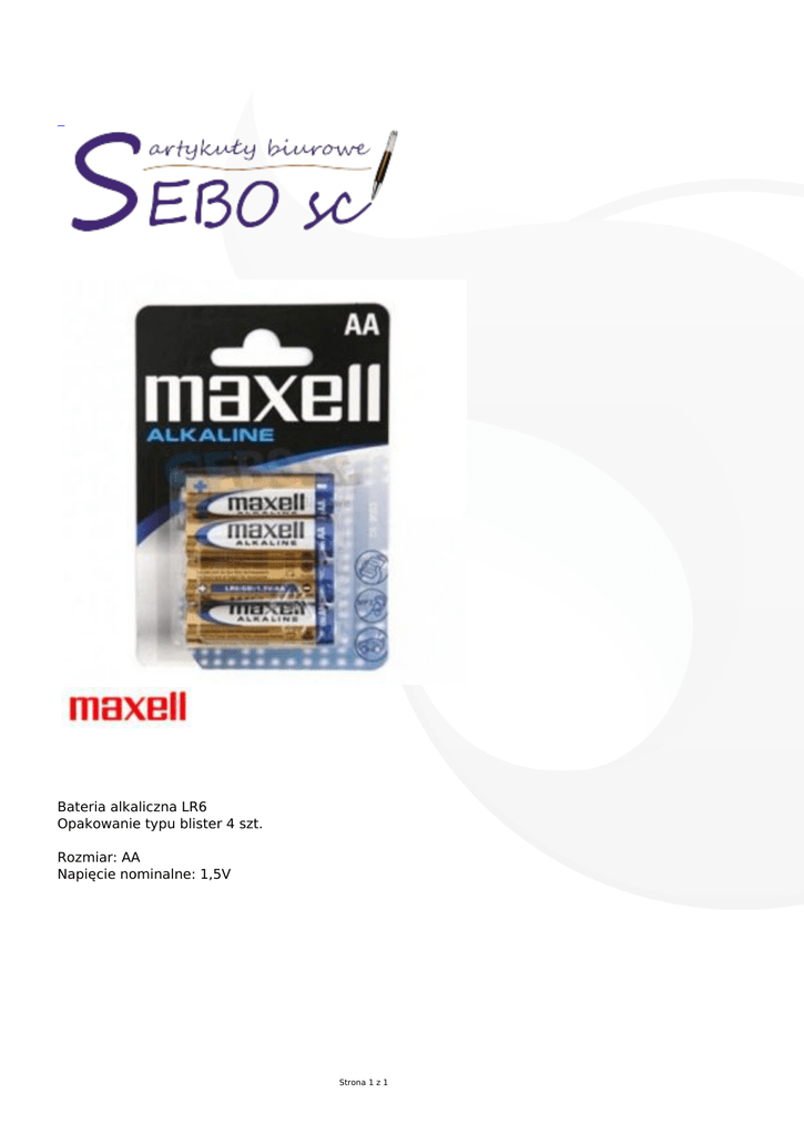 Bateria alkaliczna LR6 Opakowanie typu blister 4 szt. Rozmiar: AA Napięcie nominalne: 1,5V Strona 1 z 1