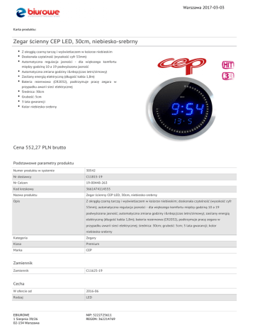 Warszawa 2017-03-03 Karta produktu: Zegar ścienny CEP LED, 30cm, niebiesko-srebrny Z okrągłą czarną tarczą i wyświetlaczem w kolorze niebieskim Doskonała czytelność (wysokość cyfr 53mm) Automatyczna regulacja jasności - dla większego komfortu między godziną 10 a 19 podwyższona jasność Automatyczna zmiana godziny i (czas letni/zimowy) Zasilany energią elektryczną (długość kabla 1,8m) Bateria rezerwowa (CR2032), podtrzymuje pracę zegara w przypadku awarii sieci elektrycznej Średnica: 30cm Grubość: 5cm 3 lata gwarancji Kolor niebiesko-srebrny Cena 552,27 PLN brutto Podstawowe parametry produktu Numer produktu w systemie 30542 Nr dostawcy C11815-19 Nr Celcen 19-00448-263 Kod kreskowy 3661474114555 Nazwa produktu Zegar ścienny CEP LED, 30cm, niebiesko-srebrny Opis Z okrągłą czarną tarczą i wyświetlaczem w kolorze niebieskim; doskonała czytelność (wysokość cyfr 53mm); automatyczna regulacja jasności - dla większego komfortu między godziną 10 a 19 podwyższona jasność; automatyczna zmiana godziny i (czas letni/zimowy); zasilany energią elektryczną (długość kabla 1,8m); bateria rezerwowa (CR2032), podtrzymuje pracę zegara w przypadku awarii sieci elektrycznej; średnica: 30cm; grubość: 5cm; 3 lata gwarancji; kolor niebiesko-srebrny Kategoria Zegary Klasa Premium Marka CEP Zamiennik Zamiennik C11625-19 Cecha W ofercie od 2016-06 Rodzaj LED EBIUROWE 1 Sierpnia 39/26 02-134 Warszawa NIP: 5222725611 REGON: 362214769 Warszawa 2017-03-03 Karta katalogowa produktu cd. Zegar ścienny CEP LED, 30cm, niebiesko-srebrny Typ Niebieska tarcza/srebrna rama Produkt Zegar ścienny Materiał Polistyren Wymiary Rozmiar Śr 30cm Wspólny słownik zamówień CPV 39254120-4 Wyposażenie domowe Kolor Kolor Niebieski/srebrny Certyfikaty Ilość lat gwarancji 3 Hit Hit Nowy produkt w ofercie Standard Serdecznie zapraszamy do współpracy EBIUROWE zespół. EBIUROWE 1 Sierpnia 39/26 02-134 Warszawa NIP: 5222725611 REGON: 362214769