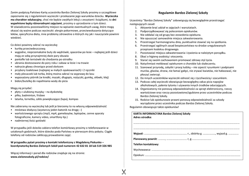 Zanim podpiszą Państwo Kartę uczestnika Bardzo Zielonej Szkoły prosimy o szczegółowe zapoznanie się z regulaminem wycieczki i przekazanie jego warunków dziecku. Wycieczka ma charakter edukacyjny, choć nie będzie zwykłych lekcji z zeszytami i książkami, to dni wypełnione będą różnorodnymi zajęciami, prosimy o uprzedzenie o tym dzieci. W oświadczeniu pozostawiliśmy miejsce na wpisanie ewentualnych uwag, które mogą okazać się ważne podczas wycieczki: alergie pokarmowe, przeciwwskazania dotyczące leków, specyficzna dieta, inne problemy zdrowotne o których my jak i nauczyciele powinni wiedzieć. Regulamin Bardzo Zielonej Szkoły Uczestnicy “Bardzo Zielonej Szkoły” zobowiązują się bezwzględnie przestrzegać następujących zasad: 1. Aktywnie brać udział w zajęciach i warsztatach. 2. Podporządkowywać się poleceniom opiekunów. 3. Nie oddalać się od grupy bez zezwolenia opiekuna. 4. Nie opuszczać samowolnie miejsca zakwaterowania. 5. Przestrzegać harmonogramu dnia, punktualnie stawiać się na spotkania. 6. Przestrzegać ogólnych zasad bezpieczeństwa na drodze uregulowanych przepisami kodeksu drogowego. 7. Pozostawiać miejsca zakwaterowania i żywienia w należytym porządku. 8. Dbać o higienę osobistą i otoczenia. 9. Starać się swoim zachowaniem promować zdrowy styl życia. 10. Natychmiast meldować opiekunom o chorobie lub skaleczeniu. 11. Szanować przyrodę, zabytki i pracę ludzką – nie szpecić rysunkami i podpisami murów, głazów, drzew, nie łamać gałęzi, nie zrywać kwiatów, nie hałasować, nie płoszyć zwierząt. 12. Do innych uczestników wycieczki odnosić się z życzliwością i szacunkiem. 13. Podczas całej wycieczki obowiązuje bezwzględny zakaz picia napojów alkoholowych, palenia tytoniu i używania innych środków odurzających. 14. Organizatorzy nie ponoszą odpowiedzialności za sprzęt elektroniczny, rzeczy wartościowe oraz rzeczy pozostawione/zgubione przez uczestników podczas Bardzo Zielonej Szkoły. 15. Rodzice lub opiekunowie prawni ponoszą odpowiedzialność za szkody wyrządzone przez uczestnika podczas Bardzo Zielonej Szkoły. Regulamin obowiązuje także opiekunów! Co dzieci powinny zabrać na wycieczkę: • kurtkę przeciwdeszczową • wygodne, nieprzemakalne buty do wędrówki, spacerów po lesie – najlepiej jeśli dzieci mają ze sobą przynajmniej dwie pary obuwia • pantofle lub tenisówki do chodzenia po ośrodku • ubrania dostosowane do pory roku i zabaw w lesie i na trawie • nakrycie głowy chroniące przed słońcem • przybory toaletowe (najlepiej w małych opakowaniach) i 2 ręczniki • mały plecaczek lub torba, którą można zabrać na wyprawę do lasu • wyposażony piórnik (w kredki, mazaki, długopis, nożyczki, gumkę, ołówki, klej) • bidon/butelkę do napełniania wody do picia Mogą się przydać: • płyty z ulubioną muzyką – na dyskotekę • piłka, badminton, frisbee • latarka, lornetka, szkło powiększające (lupa), kompas Nie zabieramy na wycieczkę lub jeśli je bierzemy to na własną odpowiedzialność • mnóstwa słodyczy (wystarczy jeden batonik na drogę :-) • wartościowego sprzętu (mp3, mp4, gameboyów, laptopów, cenne aparaty fotograficzne, kamery video, smartfony itp.) • nadmiernej ilości gotówki KARTA INFORMACYJNA Bardzo Zielonej Szkoły Adres ośrodka: ………………………………………………………………………………………………………………………………………… W przypadku jeśli dziecko zabiera telefon komórkowy prosimy o telefonowanie w ustalonych godzinach, które dziecko poda Państwu w pierwszym dniu pobytu. Ciągłe telefony od rodziców zakłócają prowadzenie zajęć. ………………………………………………………………………………………………………………………………………… Wyjazd: ......................………………………………… r., zbiórka g. ………………, wyjazd g. …………… Planowany powrót: ………., ………………………… r, g..……………………… W przypadku pytań prosimy o kontakt telefoniczny z Magdaleną Piekunko – koordynatorką Bardzo Zielonych Szkół pod numerem 42 632 81 18 lub 519 326 985 Telefon kontaktowy: Wychowawca: ........................................................…………………………………………………………… Więcej informacji i porad dla rodziców znajduje się na stronie: www.zieloneszkoly.pl/rodzice/ ada mxk acz mar ek@ gmai l.co m Opiekun: ………………………………………………………………………………………………………………………….. Zanim podpiszą Państwo Kartę uczestnika Bardzo Zielonej Szkoły prosimy o szczegółowe zapoznanie się z regulaminem wycieczki i przekazanie jego warunków dziecku. Wycieczka ma charakter edukacyjny, choć nie będzie zwykłych lekcji z zeszytami i książkami, to dni wypełnione będą różnorodnymi zajęciami, prosimy o uprzedzenie o tym dzieci. W oświadczeniu pozostawiliśmy miejsce na wpisanie ewentualnych uwag, które mogą okazać się ważne podczas wycieczki: alergie pokarmowe, przeciwwskazania dotyczące leków, specyficzna dieta, inne problemy zdrowotne o których my jak i nauczyciele powinni wiedzieć. Regulamin Bardzo Zielonej Szkoły Uczestnicy “Bardzo Zielonej Szkoły” zobowiązują się bezwzględnie przestrzegać następujących zasad: 1. Aktywnie brać udział w zajęciach i warsztatach. 2. Podporządkowywać się poleceniom opiekunów. 3. Nie oddalać się od grupy bez zezwolenia opiekuna. 4. Nie opuszczać samowolnie miejsca zakwaterowania. 5. Przestrzegać harmonogramu dnia, punktualnie stawiać się na spotkania. 6. Przestrzegać ogólnych zasad bezpieczeństwa na drodze uregulowanych przepisami kodeksu drogowego. 7. Pozostawiać miejsca zakwaterowania i żywienia w należytym porządku. 8. Dbać o higienę osob